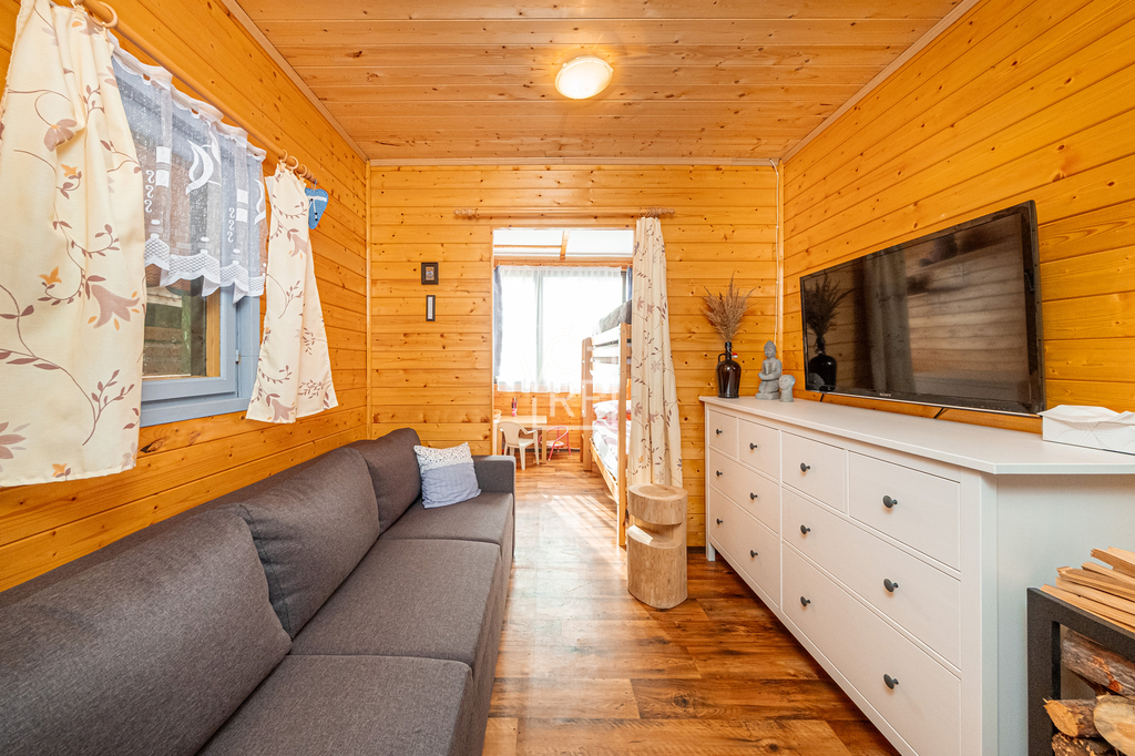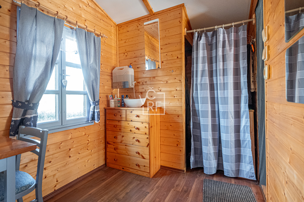 Dispozice chaty nabízí jednu společenskou místnost a dvě samostatné místnosti určené ke spaní, což poskytuje dostatek prostoru pro rodinu i přátele. Nemovitost je velmi pěkně udržovaná a prodává se téměř kompletně vybavená, takže je připravena k okamžitému užívání.