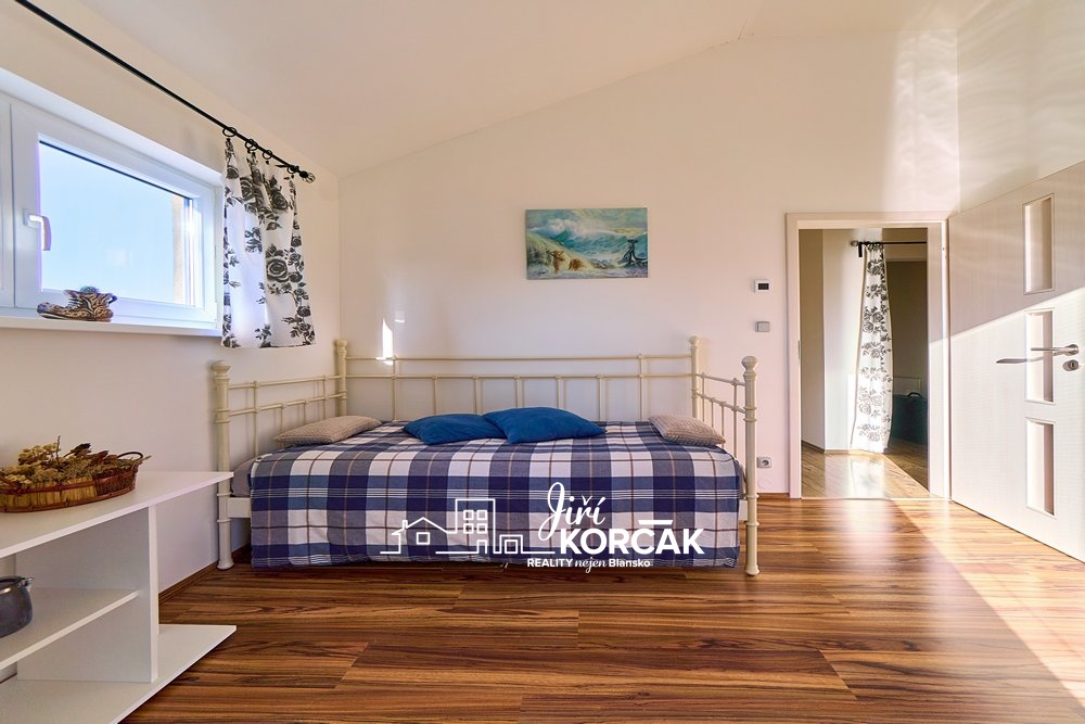 Uvnitř najdete prostorný obývací pokoj volně navazující na kuchyni, ložnici, dětský pokoj i velmi hezký pokoj