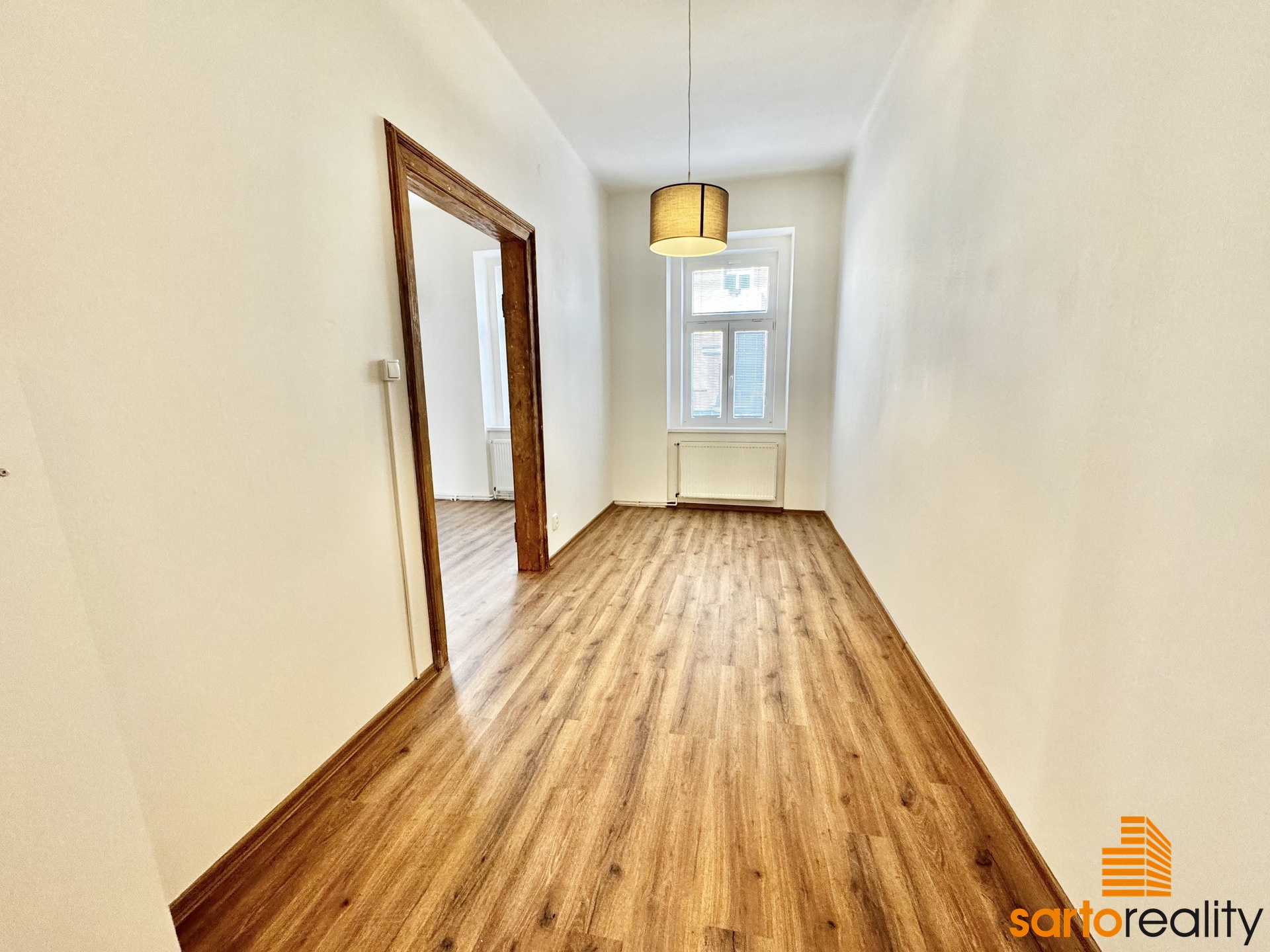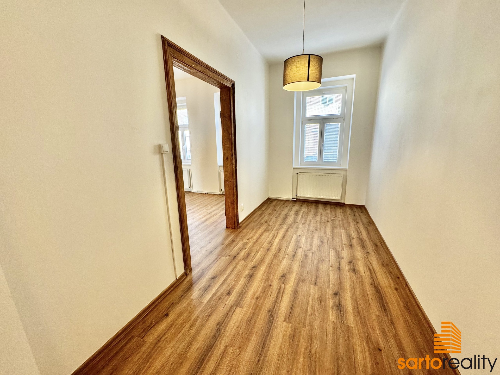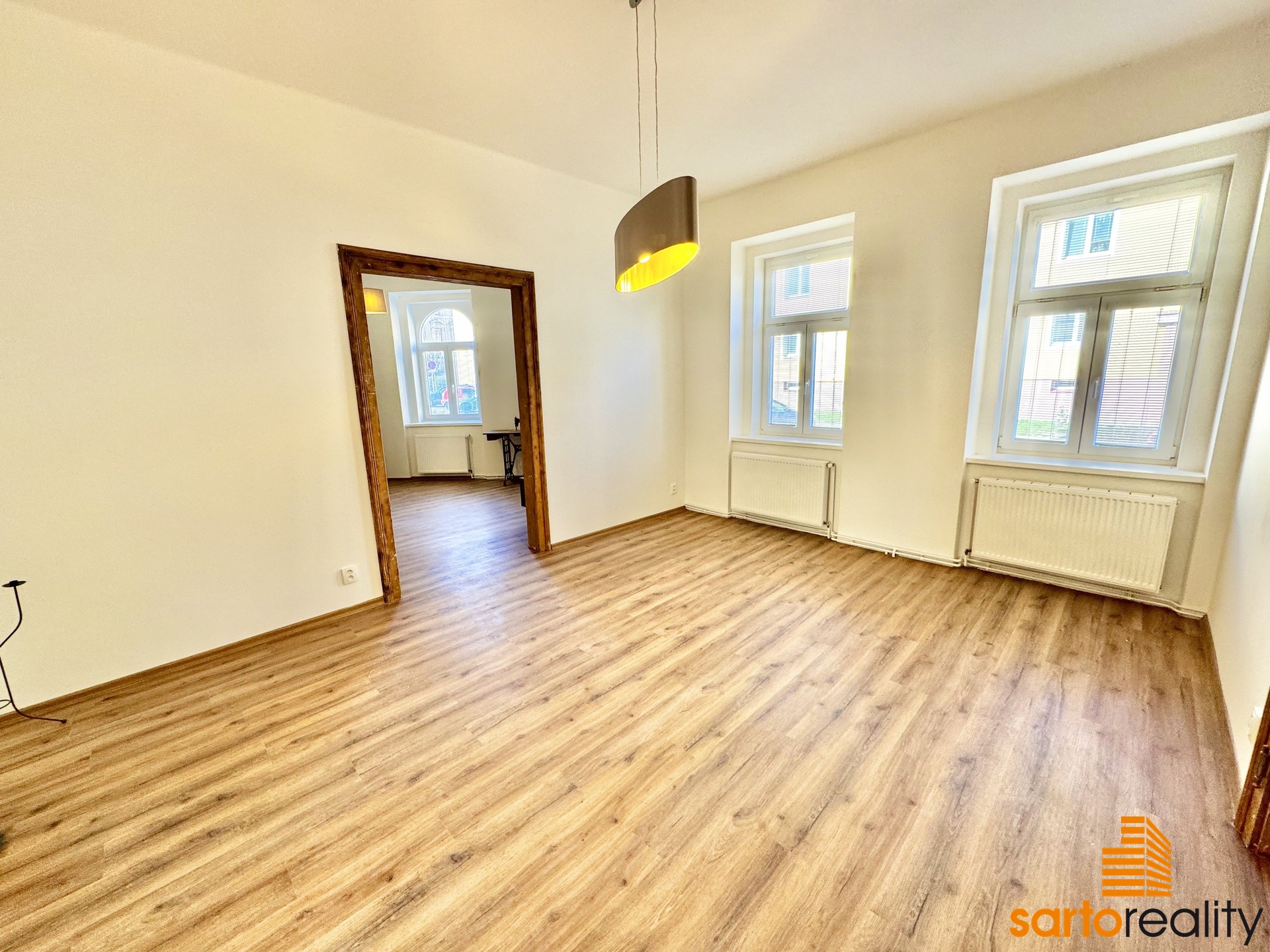 Tento byt, o velikosti 95,5 m2, je situovaný do 1.NP cihlového městského domu. Skládá se ze vstupní předsíně, prostorného obývacího pokoje, dvou ložnic, velké kuchyně s rohovou kuchyňskou linkou, koupelny, spíže a samostatného WC. Aktuálně se dokončuje nákladná rekonstrukce bytu a byt tak bude připraven na nastěhování nového nájemce. Na foto ještě před finálním dokončením. Jen pro zmínku bych rád vypíchl několik důležitých věcí - nový topný systém vč. moderního plynového kotle. Nová koupelna vč. bezprahového sprchového koutu, nová kuchyňská linka vč. spotřebičů (indukční varná deska, trouba i myčka GORENJE), plovoucí podlahové krytiny a jiné. Současně autentickou atmosféru bytu dotváří vysoké stropy a původní dřevěné dveře, které aktuálně prochází renovací.