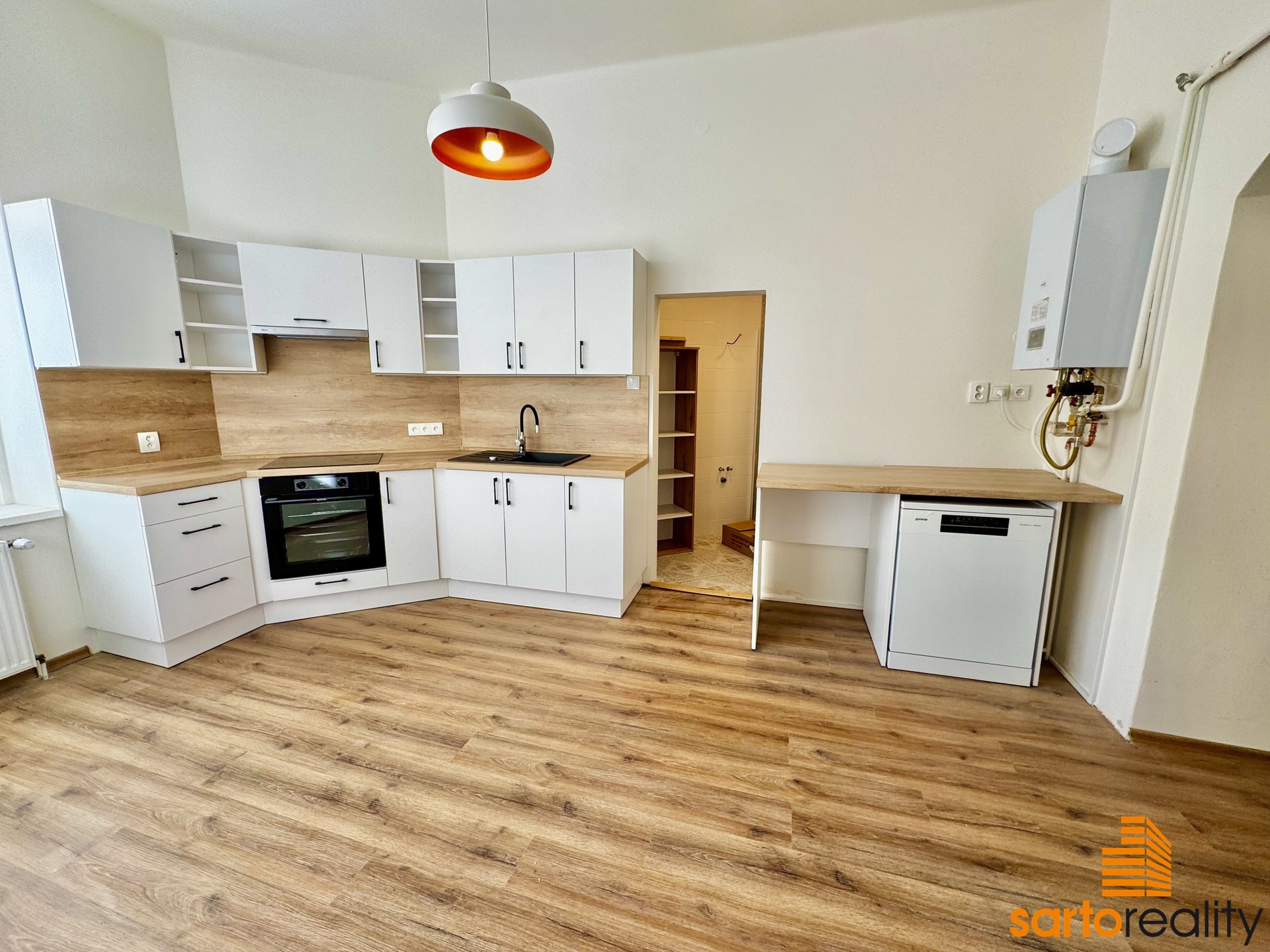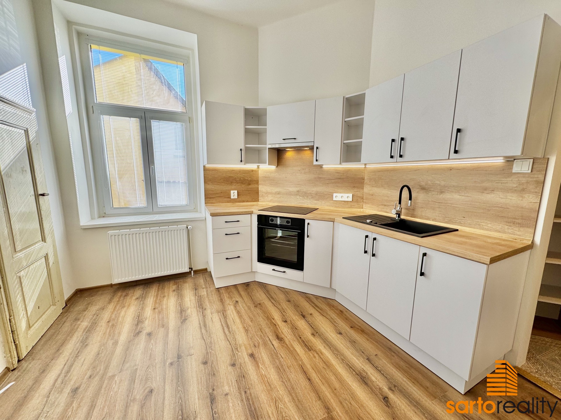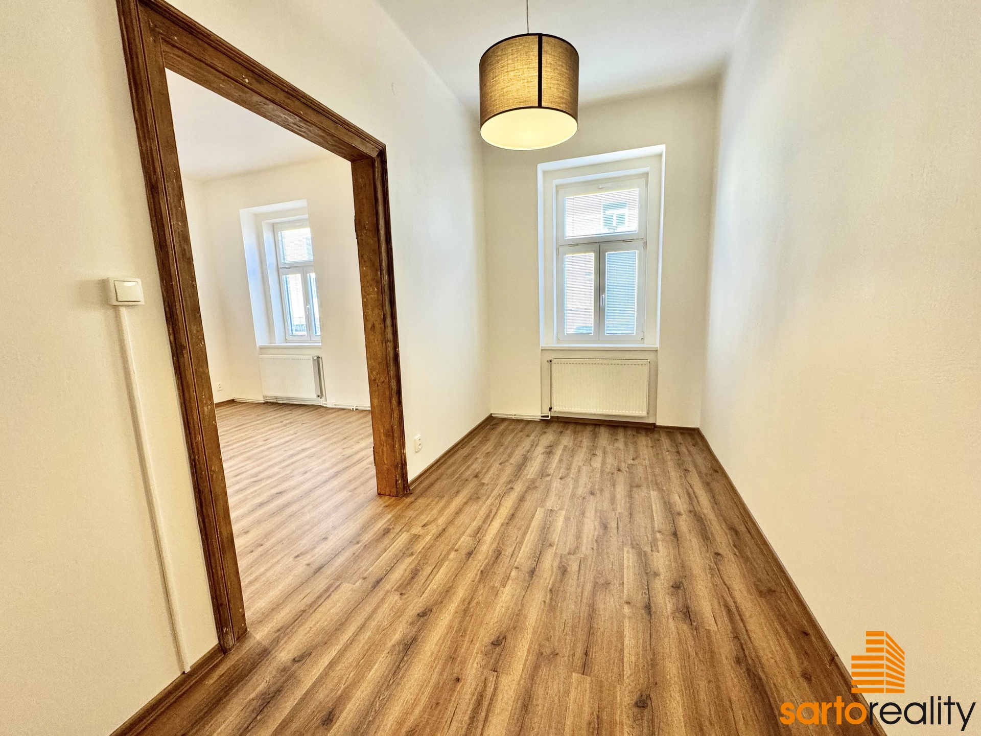 Tento byt, o velikosti 95,5 m2, je situovaný do 1.NP cihlového městského domu. Skládá se ze vstupní předsíně, prostorného obývacího pokoje, dvou ložnic, velké kuchyně s rohovou kuchyňskou linkou, koupelny, spíže a samostatného WC. Aktuálně se dokončuje nákladná rekonstrukce bytu a byt tak bude připraven na nastěhování nového nájemce. Na foto ještě před finálním dokončením. Jen pro zmínku bych rád vypíchl několik důležitých věcí - nový topný systém vč. moderního plynového kotle. Nová koupelna vč. bezprahového sprchového koutu, nová kuchyňská linka vč. spotřebičů (indukční varná deska, trouba i myčka GORENJE), plovoucí podlahové krytiny a jiné. Současně autentickou atmosféru bytu dotváří vysoké stropy a původní dřevěné dveře, které aktuálně prochází renovací.
