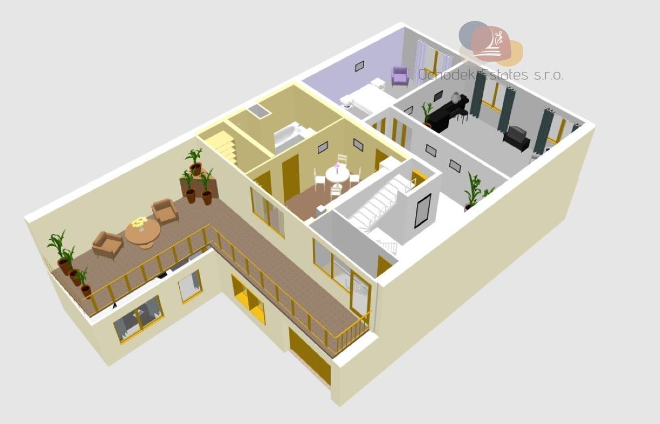 Jedná se o 6+1, kde v přízemí je komerční prostor o výměře 65m2 s výlohou a se samostatným vstupem přímo z ulice a vjezd do garáže s vchodem do obytné části. V prvním patře je prostorný obývák, kuchyň s novou kuchyňskou linkou, samostatnou spíží, pokoj pro hosty, koupelna a samostatné WC. Dále je tu vstup na zastřešenou terasu. První patro je koncipováno jako prostor pro trávení společného času s rodinou a přáteli.