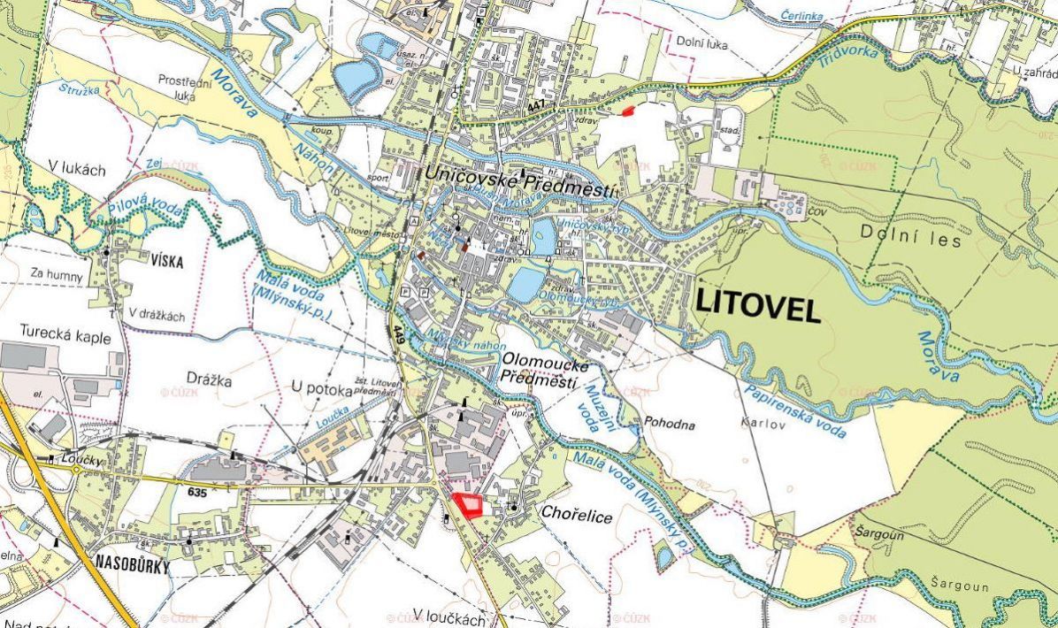Investiční území v Litovli - spoluvlastnické podíly na šesti pozemcích, uspořádaných do dvou celků.