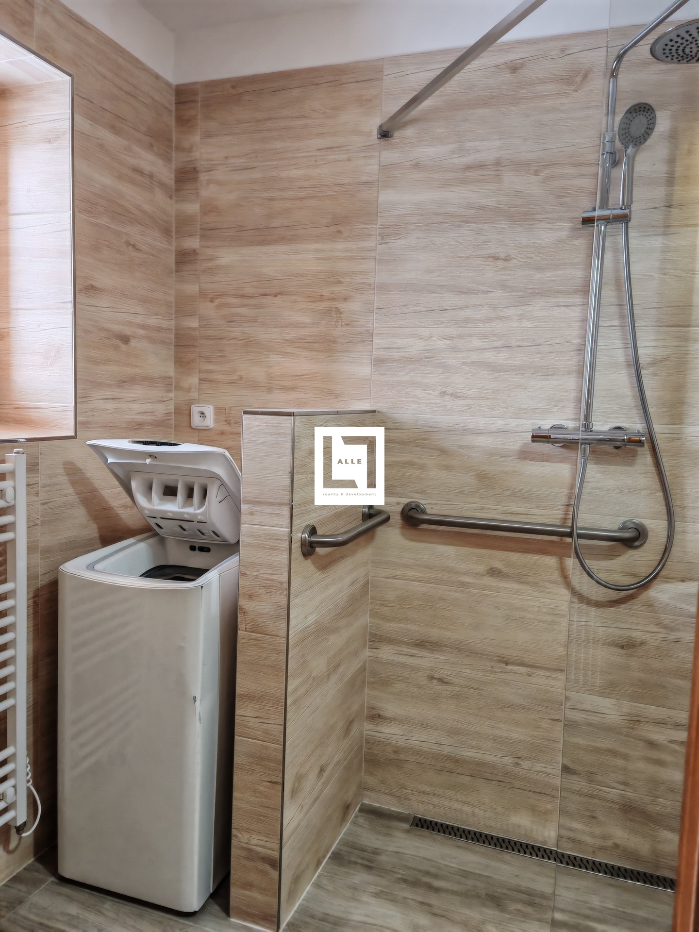 Po schodech postupujete do 1.NP na menší chodbu, kde je umístěno samostatné wc, koupelna se sprchovým koutem a pračkou a následně vchod na dlouhou terasu s výhledem do vnitrobloku se zahradou. Z chodby také pokračujete do velké kuchyně vybavené kuchyňskou linkou s troubou a varnou deskou, digestoří a dřezem. Místnost je průchozí společně s obývacím pokojem do samostatné ložnice.