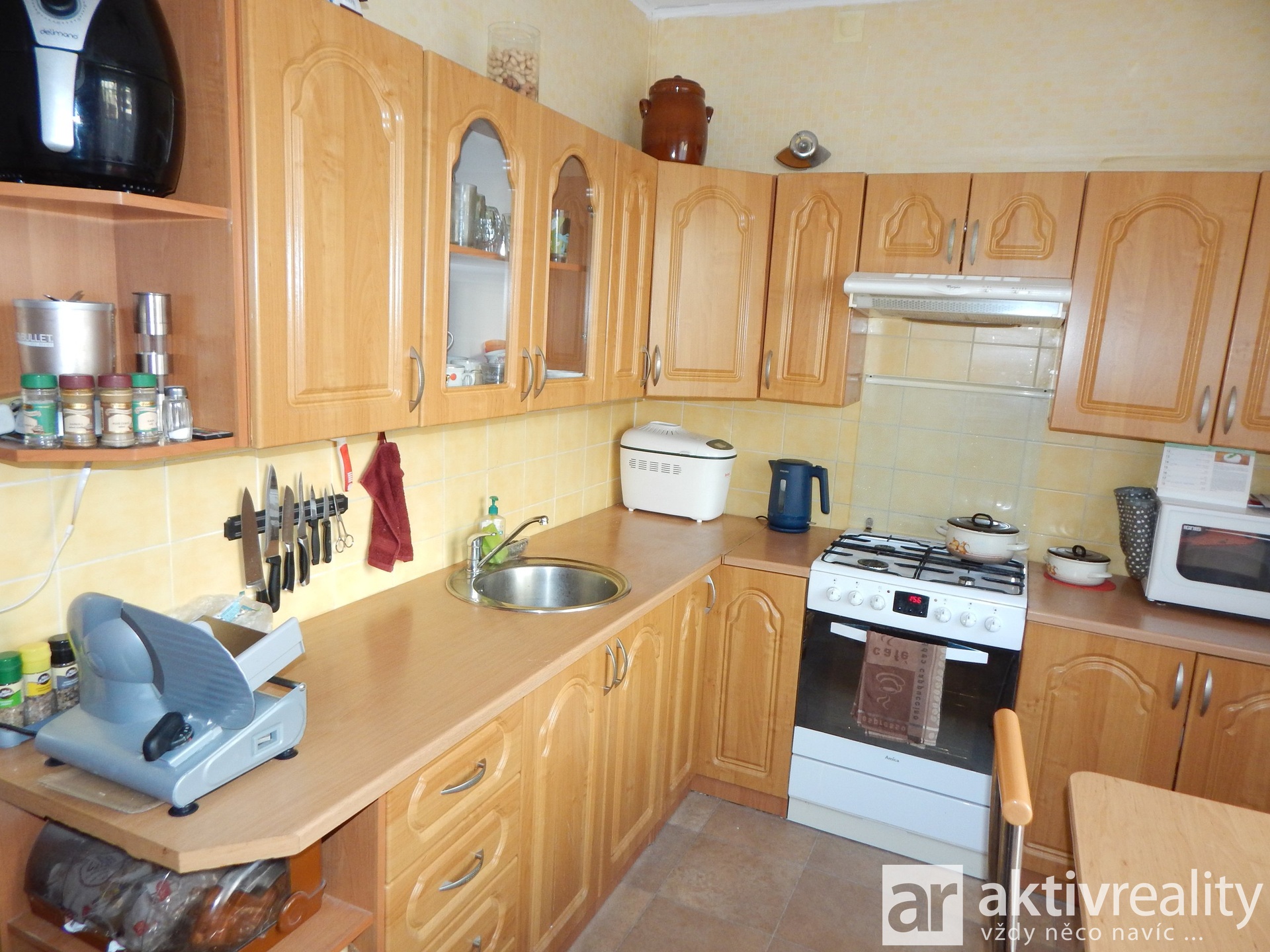 keramickým obkladem, kuchyně vybavena novou kuchyňskou linkou s kombinovaným sporákem.