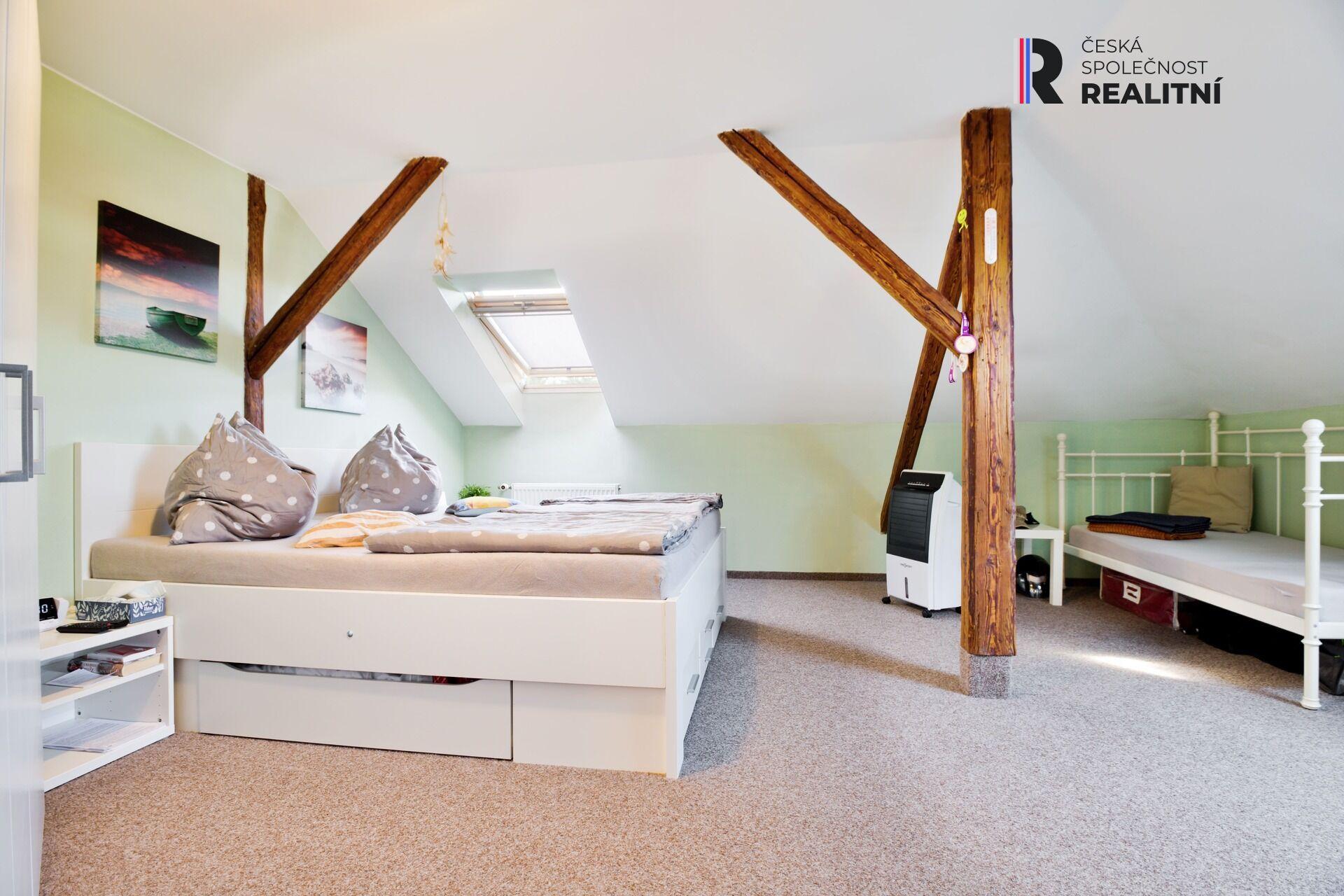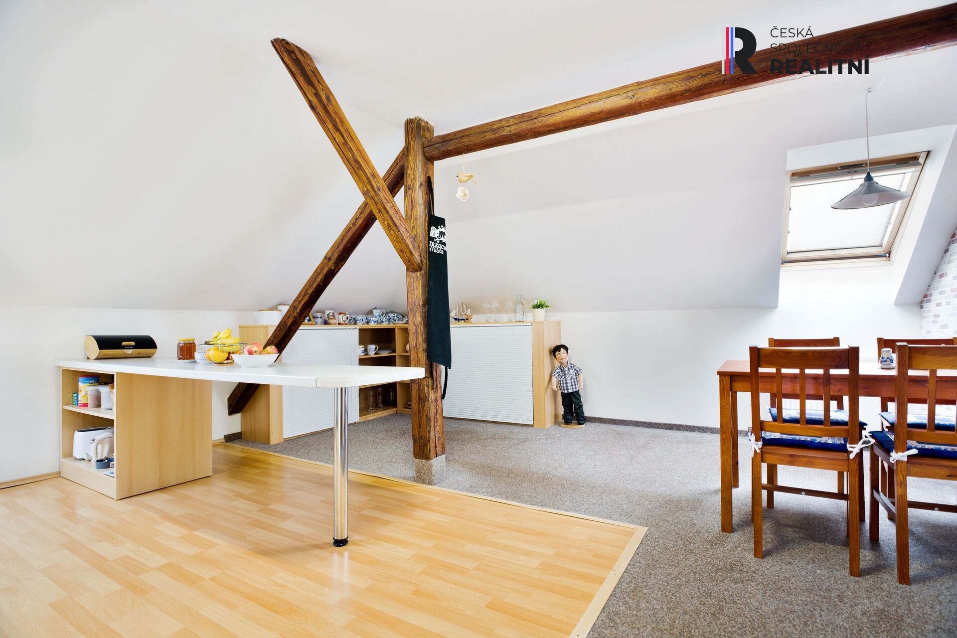 Ve čtvrtém podlaží je půdní prostor, který byl upraven na bytovou jednotku 3+kk o výměře 90m2. Zde je koupelna se sprchovým koutem a WC, střešní okna v každé z místností.