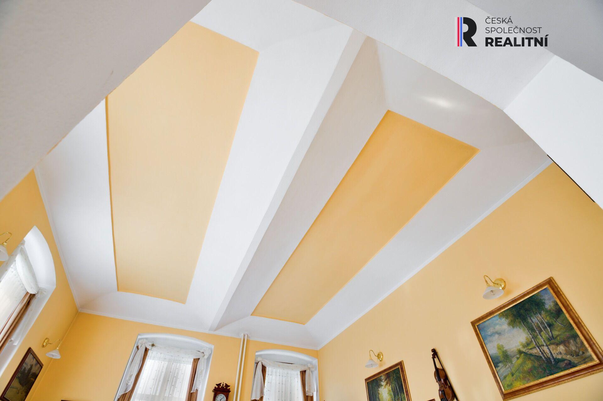 Obývák s krbovými kamny a ložnice s překrásnými klenutými stropy. Skrze tento byt (85m2) projdeme na centrální schodiště. Vedle vstupních dveří na chodbě je ještě samostatná kancelář.