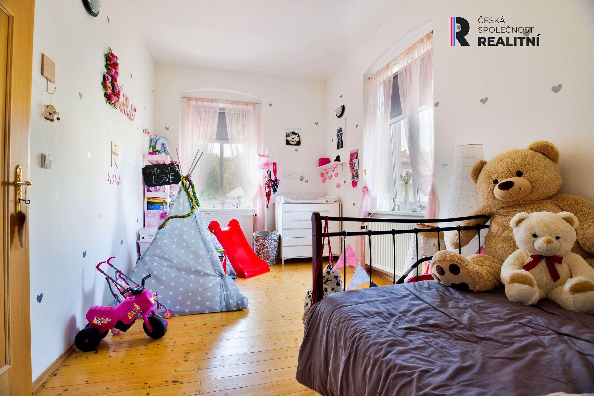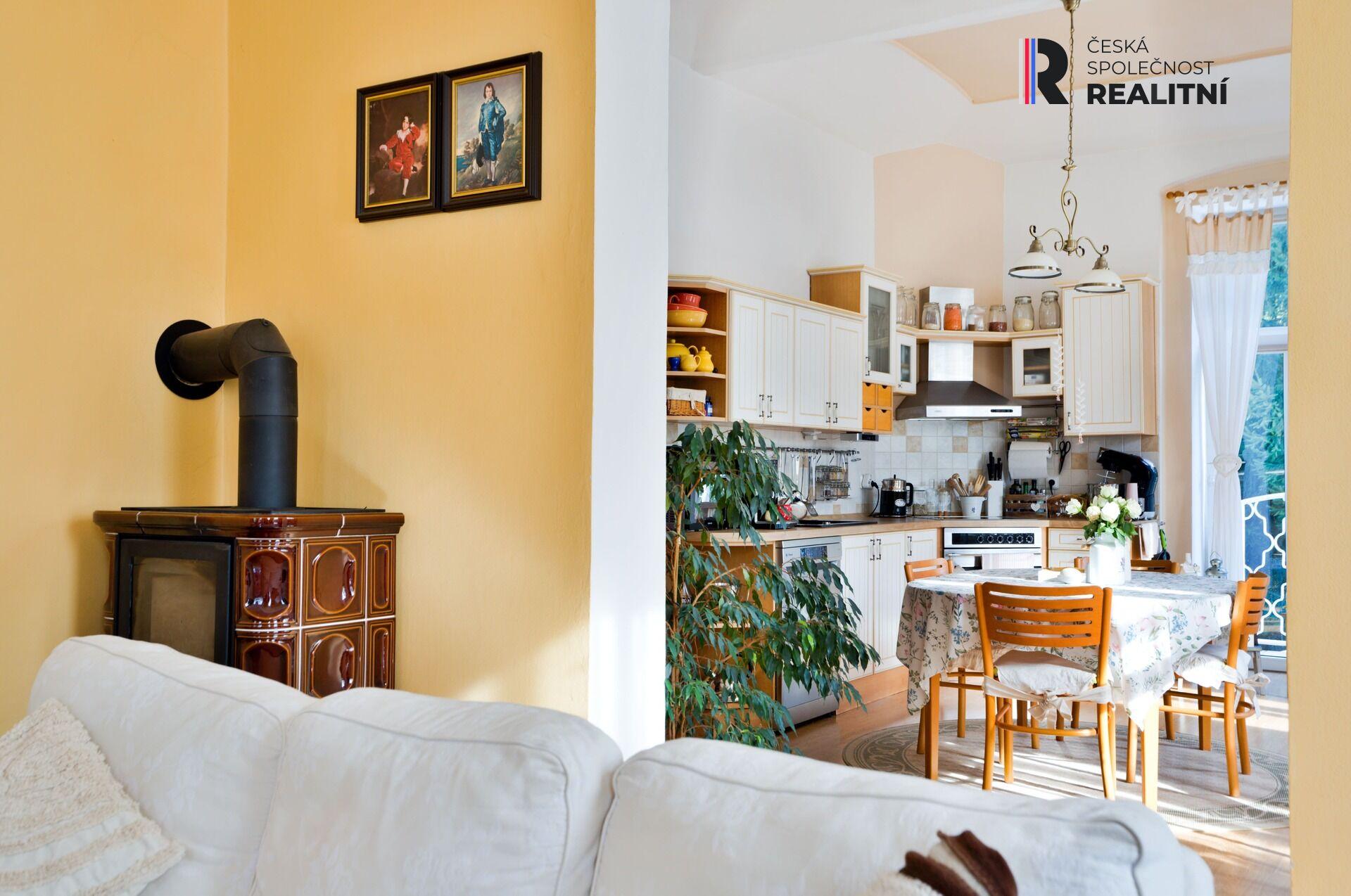 Ve druhém patře je jednotka 100m2, o upravené dispozici na 3+1 pro rodinu s dětmi. Disponuje samostatnou velkou kuchyní, koupelnou a třemi pokoji. Opět jsou zde k dispozici krbová kamna a celý byt má velmi příjemnou orientaci.