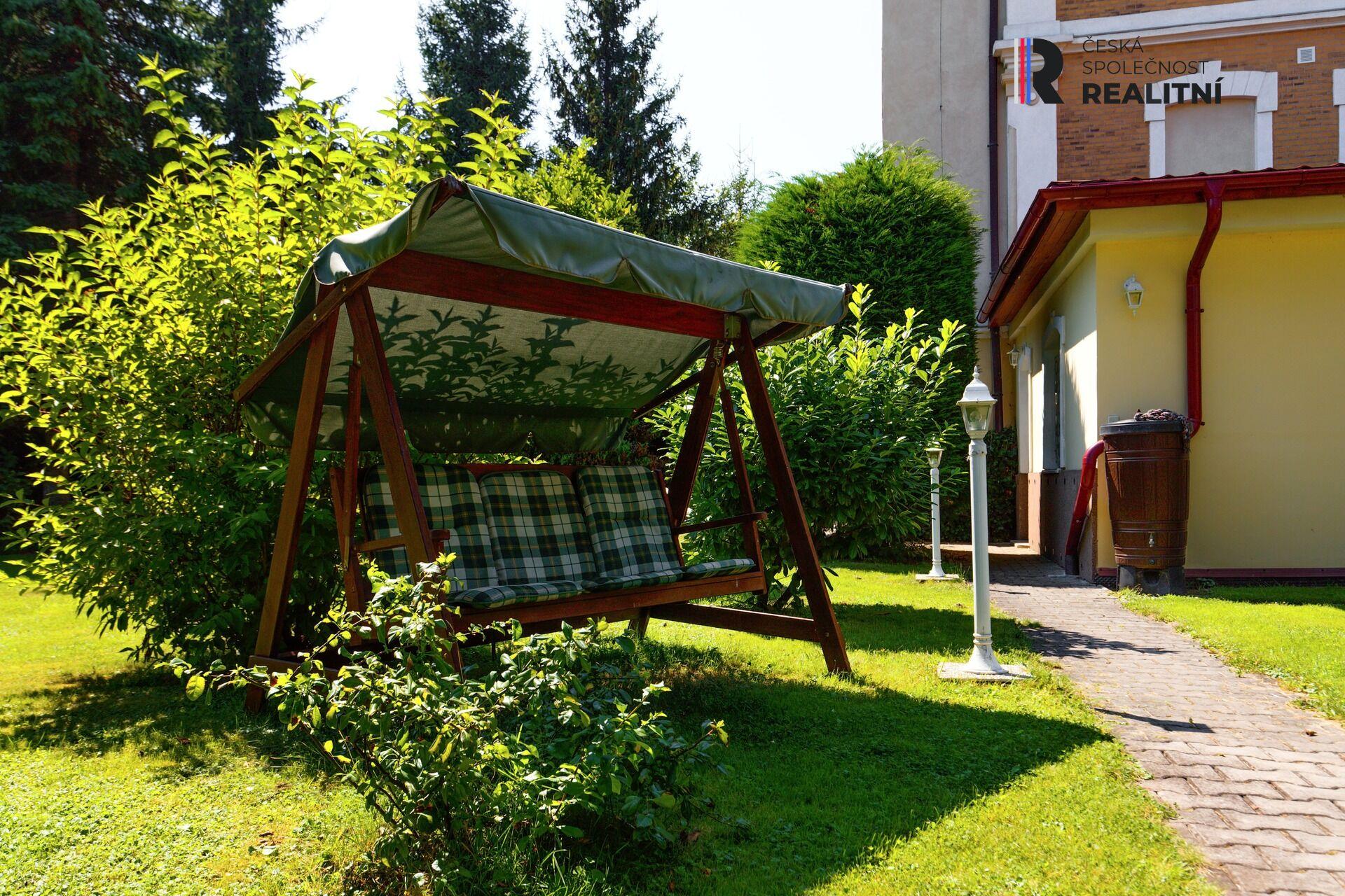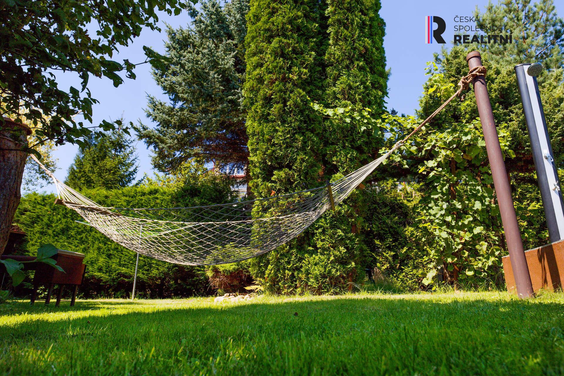 Tato velkorysá zahrada je ideálním místem pro odpočinek, posezení u grilu s rodinou a přáteli nebo pro pěstování vlastní zeleniny a květin. Prostor tu má také dětské hřiště, je zde zastřešený bazén, houpačka, altánek, ohniště, udírna, skleník aj.