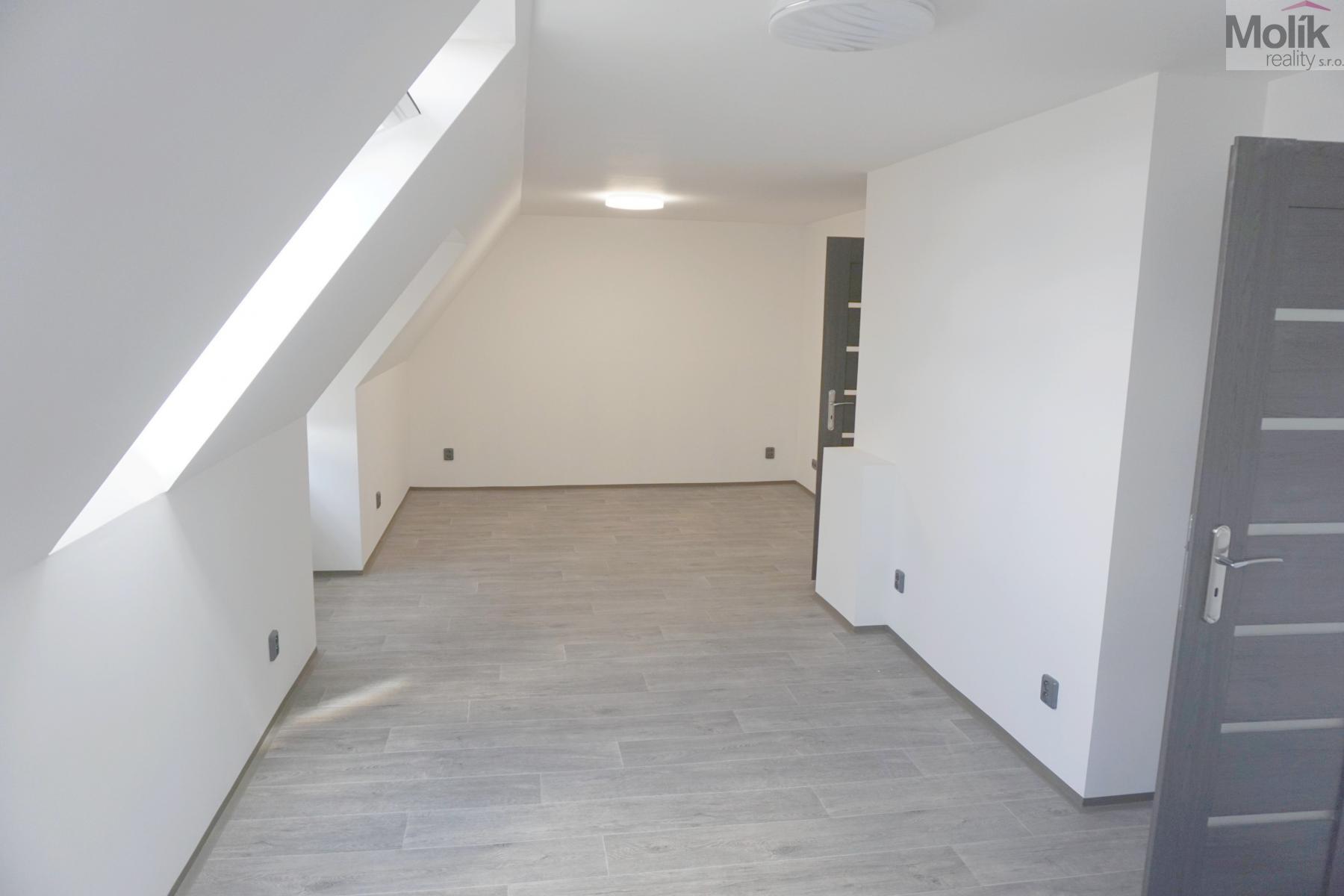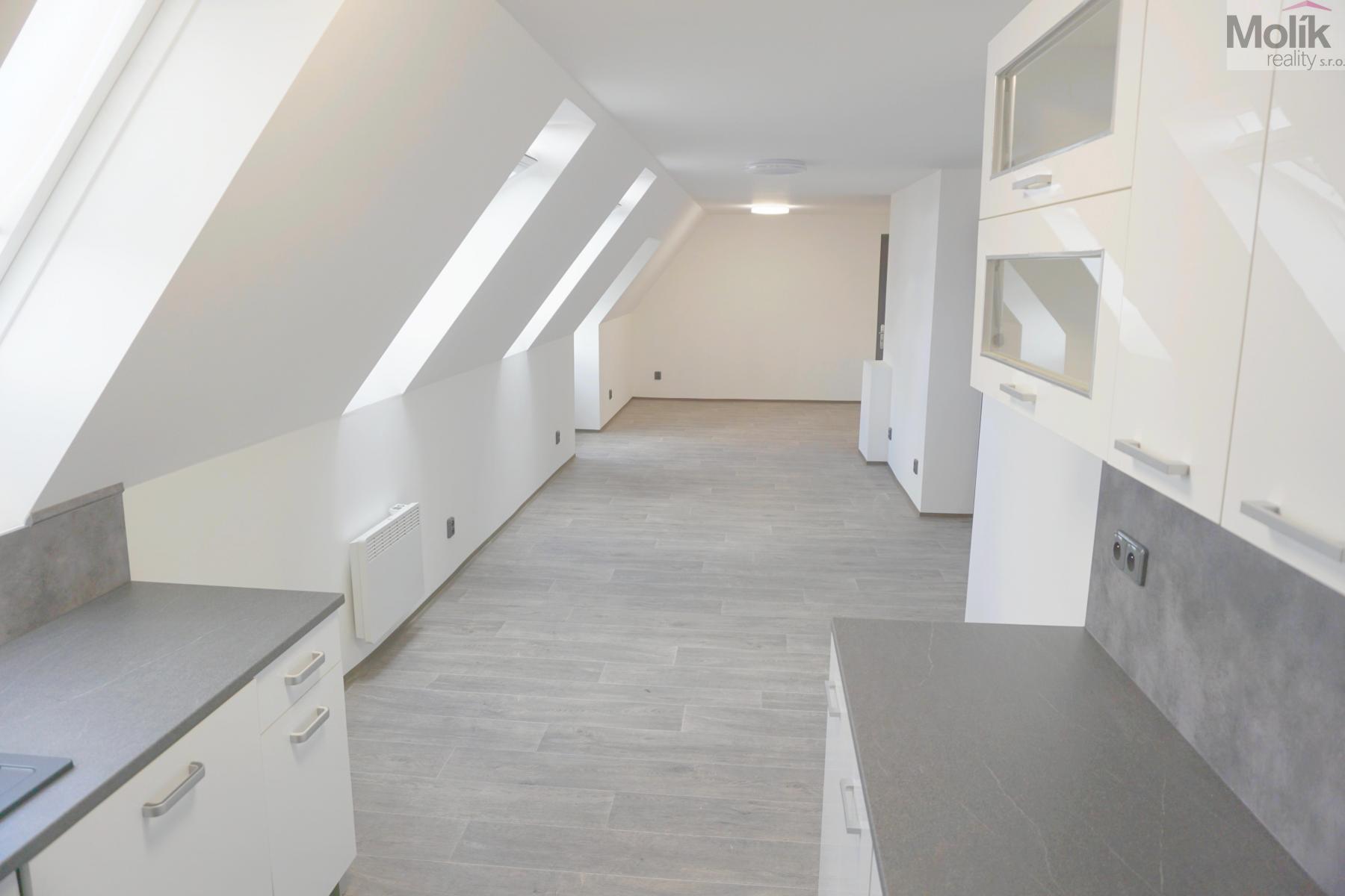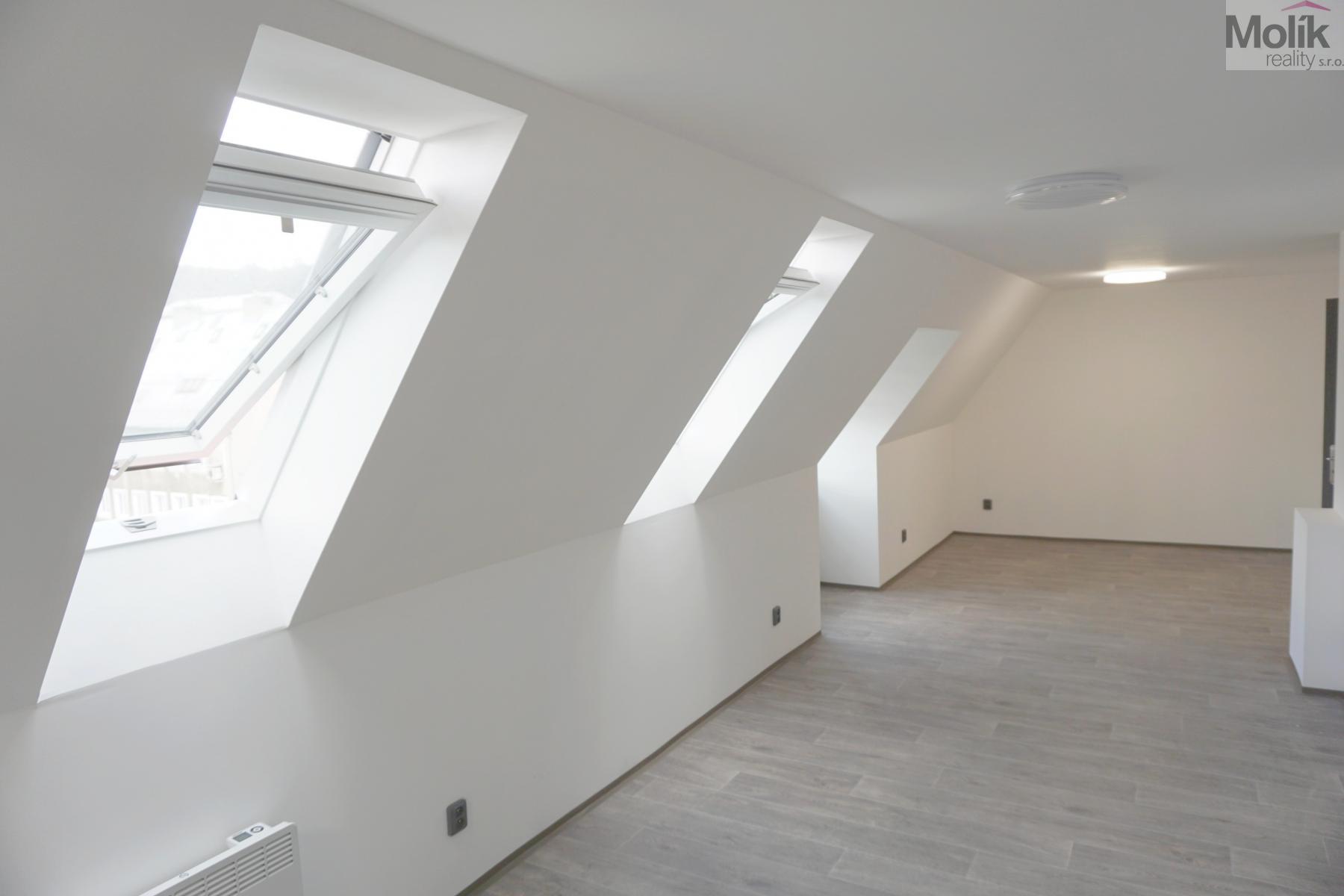 Jedná se o podkrovní byt, který prošel zdařilou, kompletní rekonstrukcí - nová kuchyňská linka včetně horkovzdušné trouby, varné desky, myčky.., nová koupelna se sprchovým koutem, keramickými obklady a dlažbou, nové podlahové krytiny, vnitřní dveře, střešní okna, izolace celého podkroví, nová elektroinstalace atd. ...........