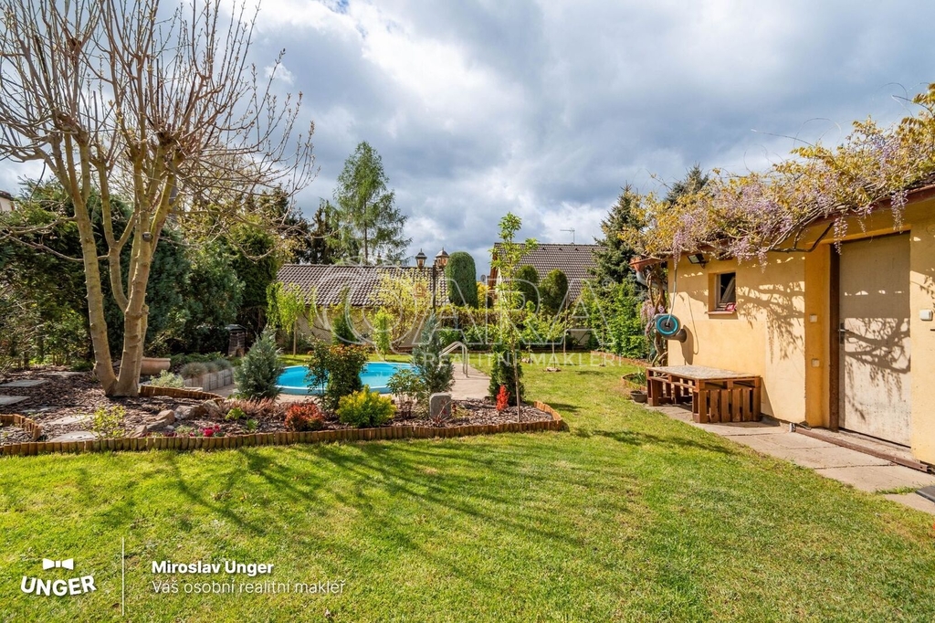 Zastřešené posezení u grilu, bazén, zděný zahradní domek… a hlavně vzrostlá zeleň kolem dokola, která vám dá klid a soukromí.