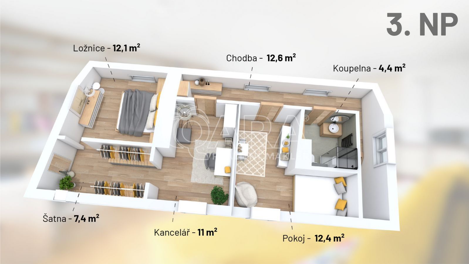 V patře najdete tři samostatné pokoje a druhou koupelnu.