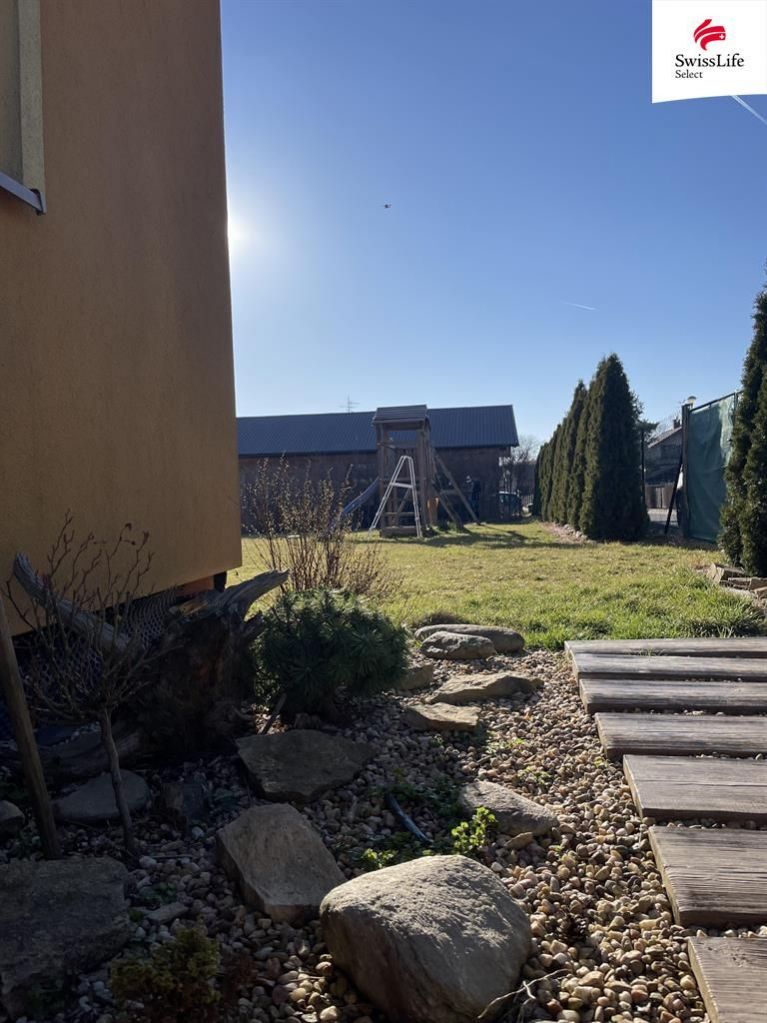 Dům je vkusný, ale jeho předností je zcela určitě zahrada. Je tady dětský hrad, bazén a trampolína. Vše zůstává a je součástí prodeje. Protože už nebyl čas věnovat se zahrádce, čeká na pečlivou ruku nového zahradníka a na nový nátěr dřevěných prvků. Velkorysá plocha pokračuje za domem. Tady je skvělé místo pro truhlíky, vyvýšené záhony, nebo skleník. Místo je chráněné a slunné. Součástí je zahradní domek. Protože na zahradě nejsou stromy, lze jí vhodně doplnit o některé solitéry, vejdou se ale i stromy ovocné, které přinesou zahradě potřebný stín. Stačí jen malá péče a bude kouzelná.