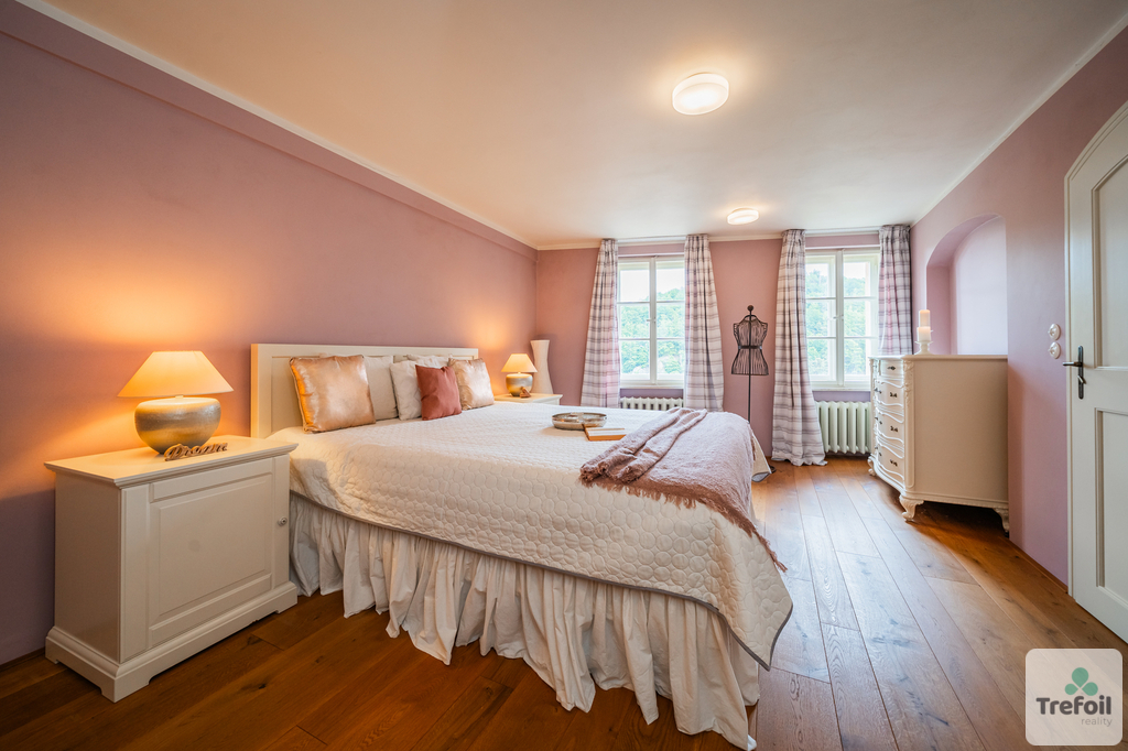 Každá místnost dýchá historií – masivní dubové podlahy, dřevěná špaletová okna, robustní dveře a travertinové parapety vytvářejí dojem noblesy a kvality.