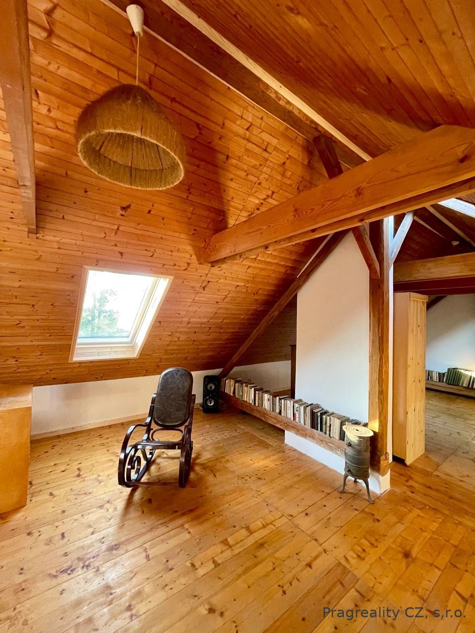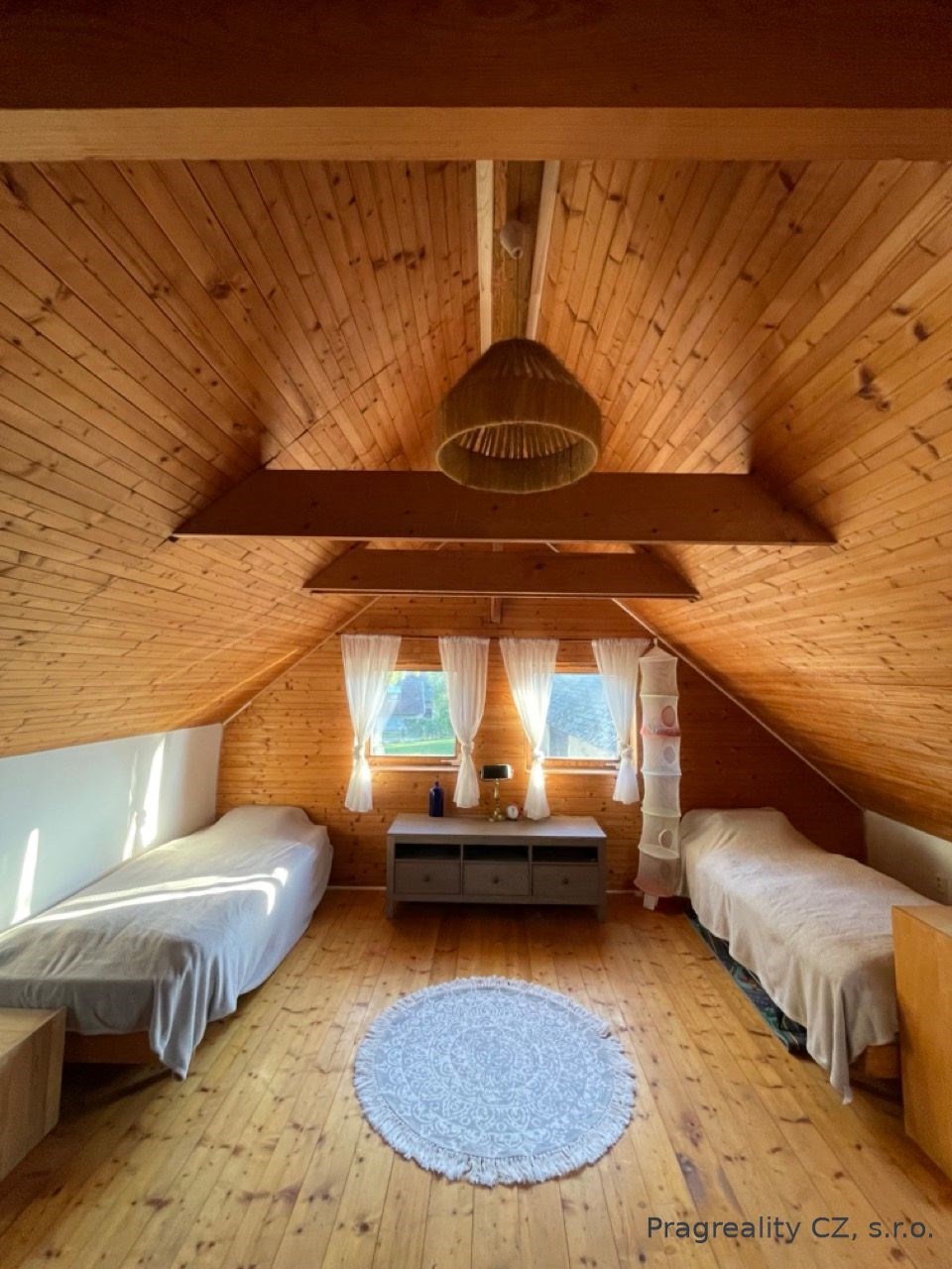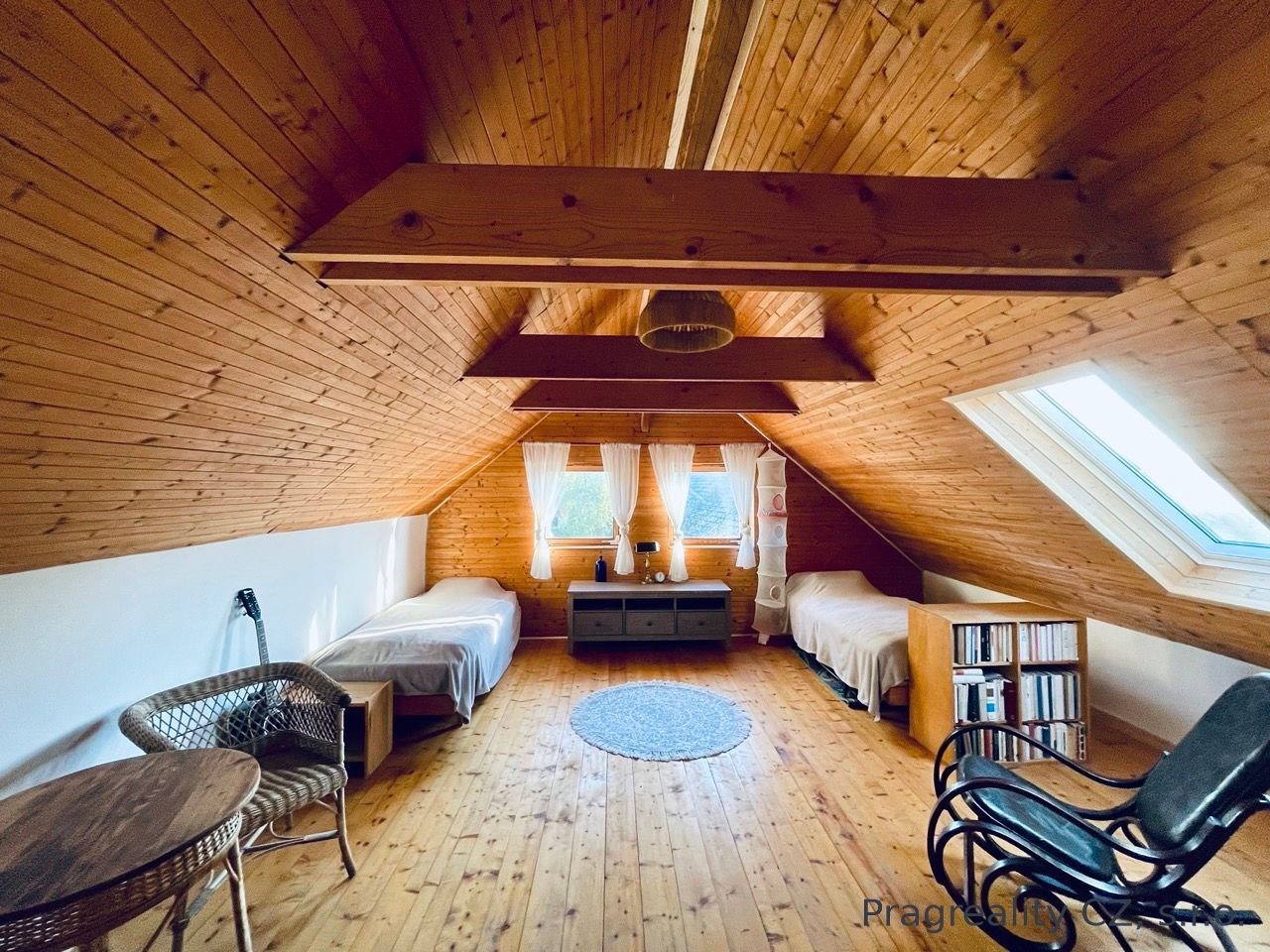 Podkroví má užitnou plochu 49m2 je obytné a užívané jako ložnice s obývací částí, lze případně rozdělit na 2 pokoje. Vytápění je el.přímotopy, krbovými kamny, ohřev vody el. bojlerem.
