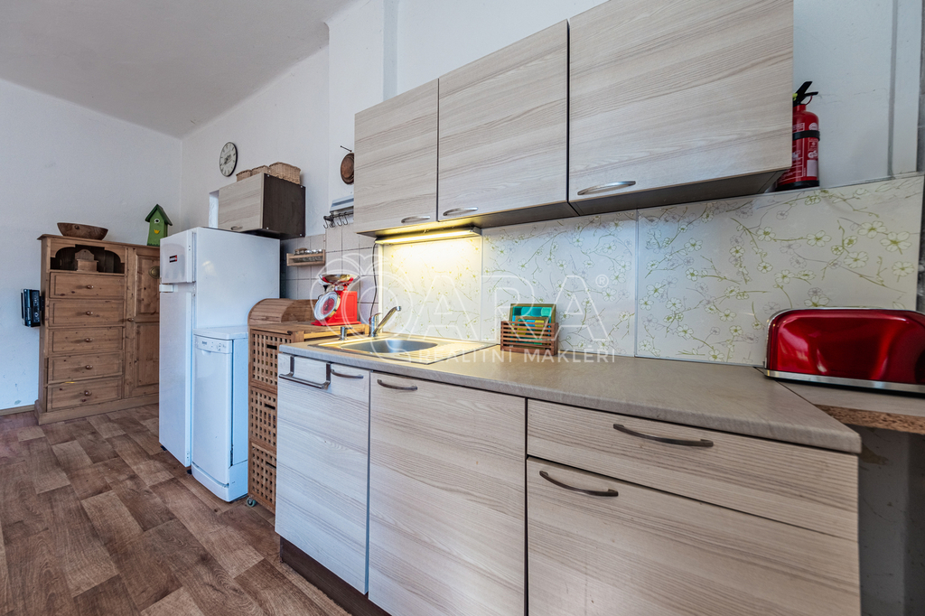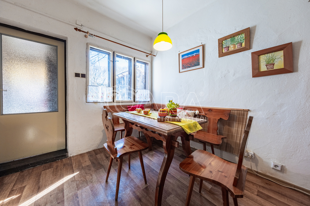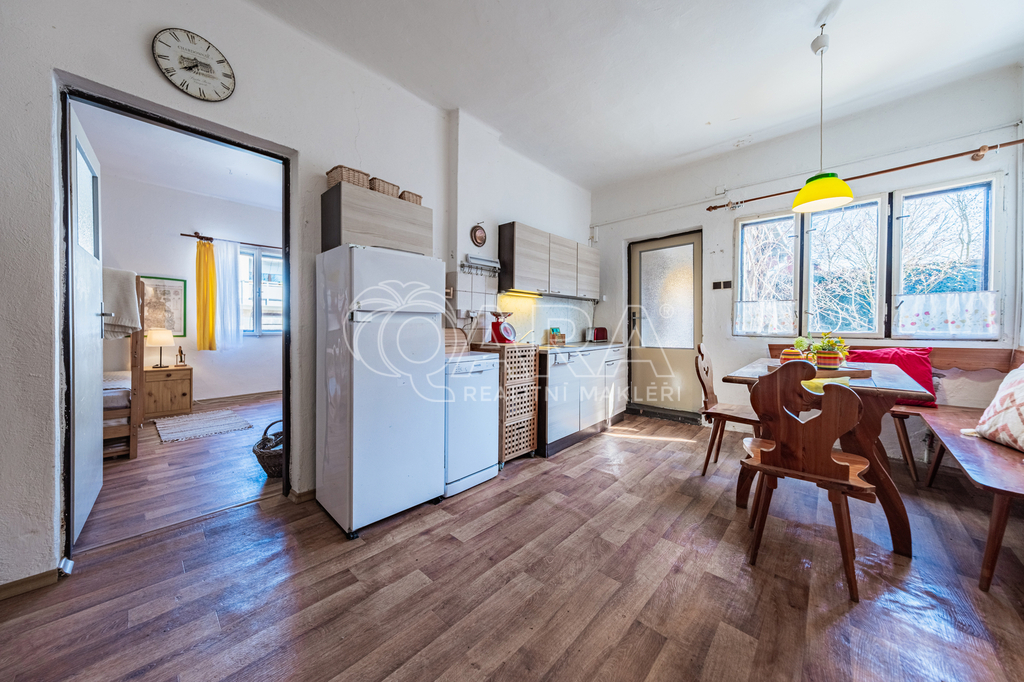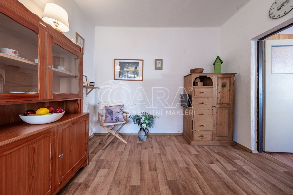 Nemovitost o dispozici 2+kk s půdním prostorem je určena k celkové rekonstrukci, případně nabízí možnost výstavby nového domu na stávající zastavěné ploše. Dispozice zahrnuje velkou ložnici, obývací pokoj spojený s kuchyňským koutem, předsíň a koupelnu se sprchovým koutem a společnou s toaletou. Půdní prostor nabízí možnost vybudování další obytné místnosti, pracovny či skladu dle potřeb nového majitele.