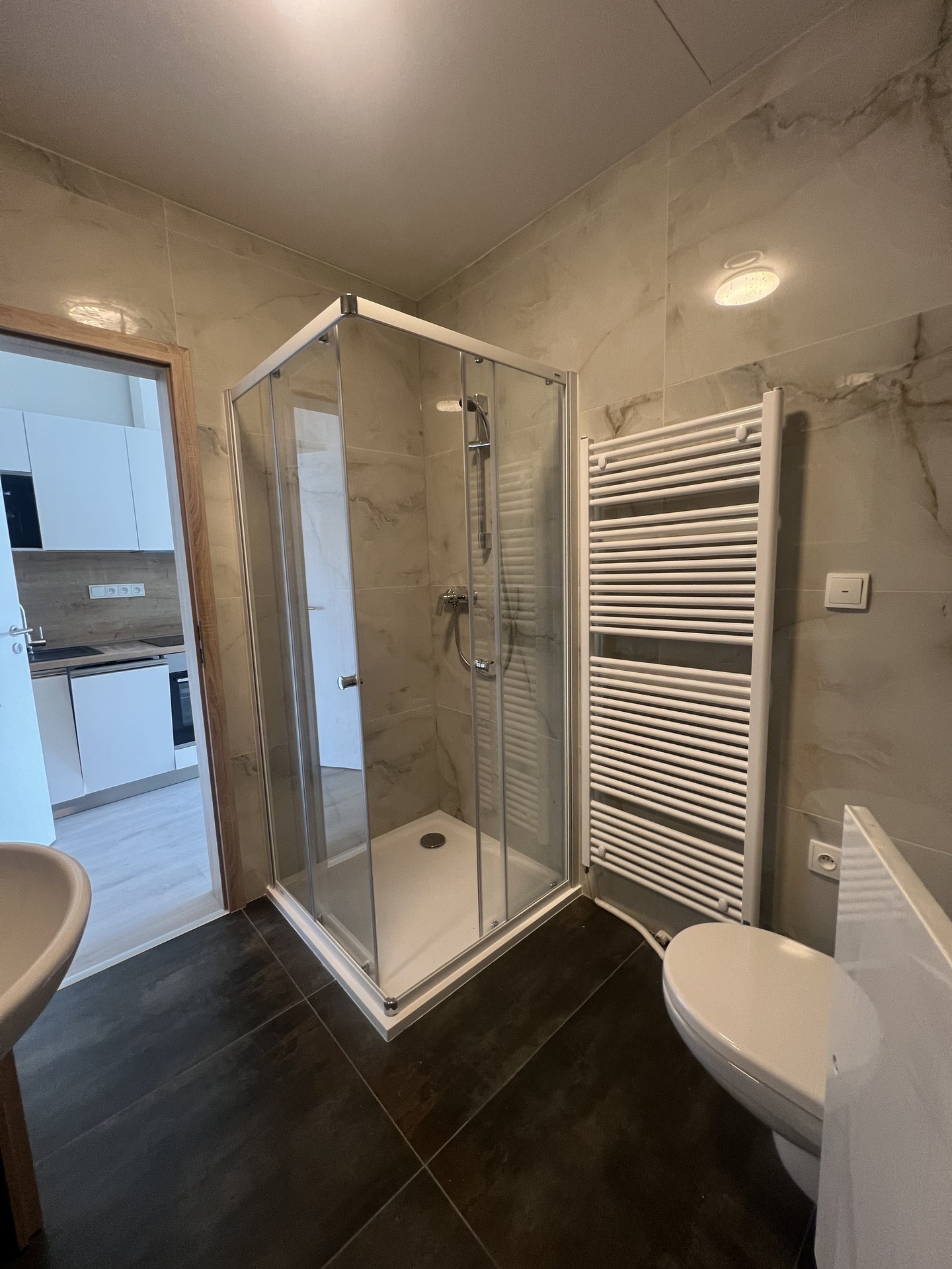 Koupelna je vybavena sprchovým koutem, umyvadlem, skřínkou pod umyvadlem a otopným žebříkem, vlastním plynovým kotlem.