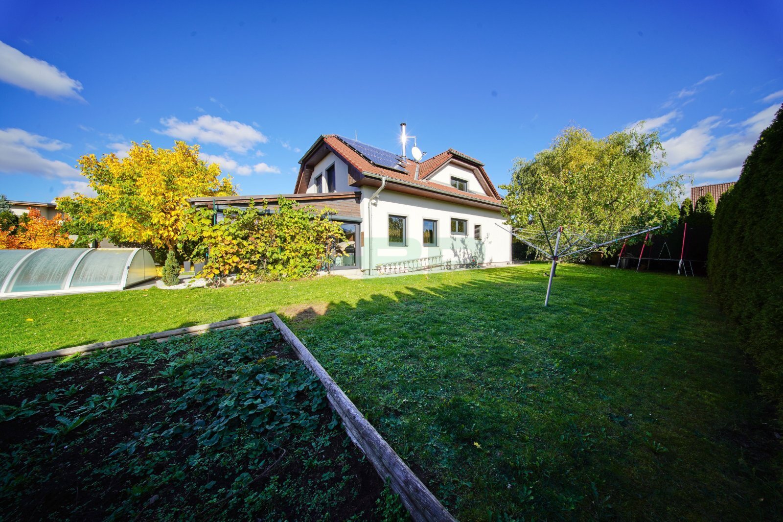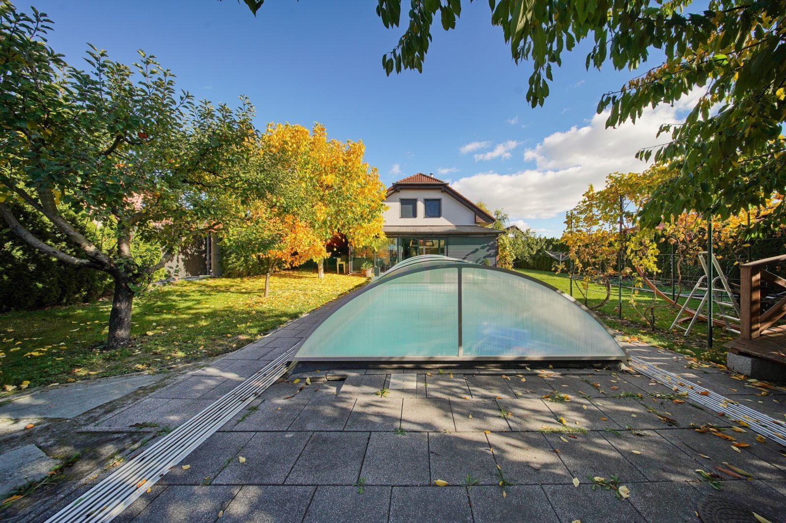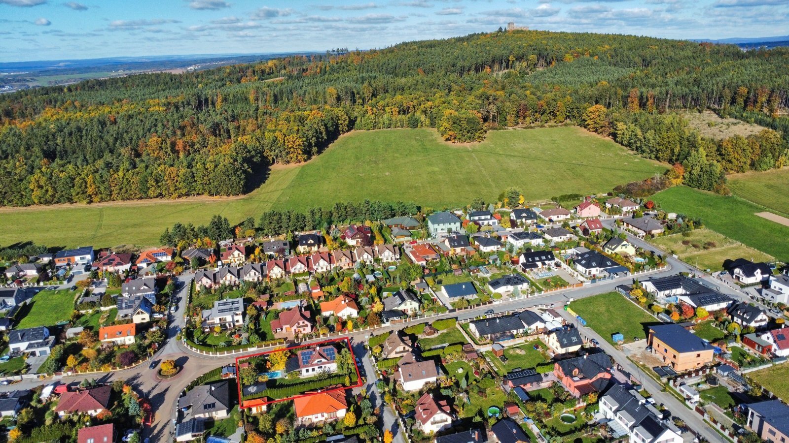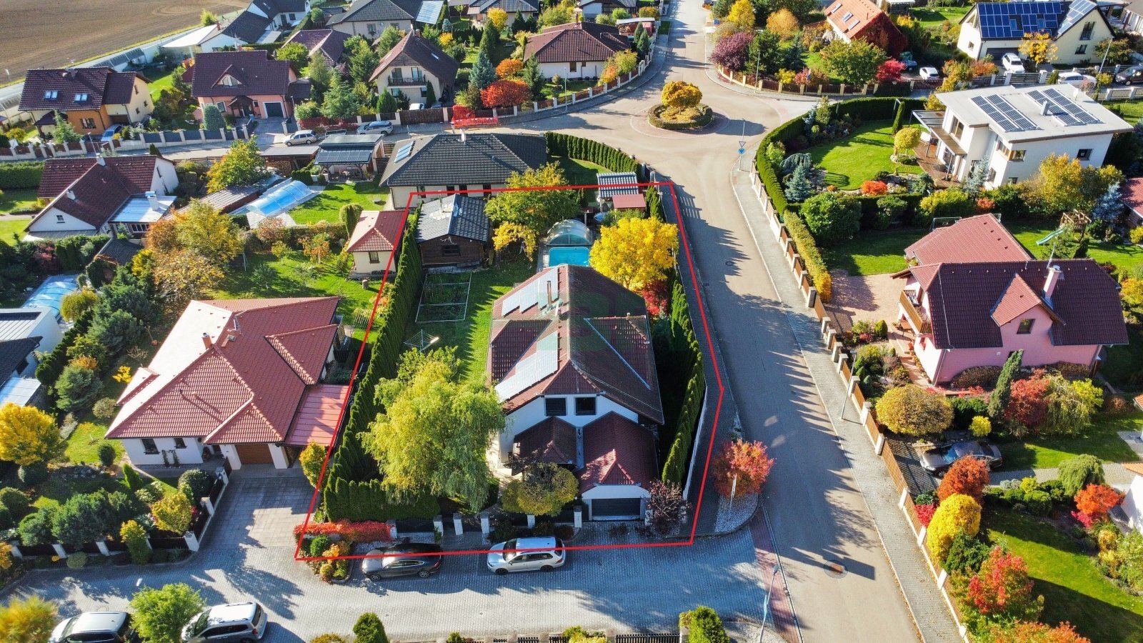 Dispozice 5+kk, 2x terasa, šatna, dvojgaráž, krytý bazén, kolna, zahradní roubenka se saunou, venkovní vířivka.