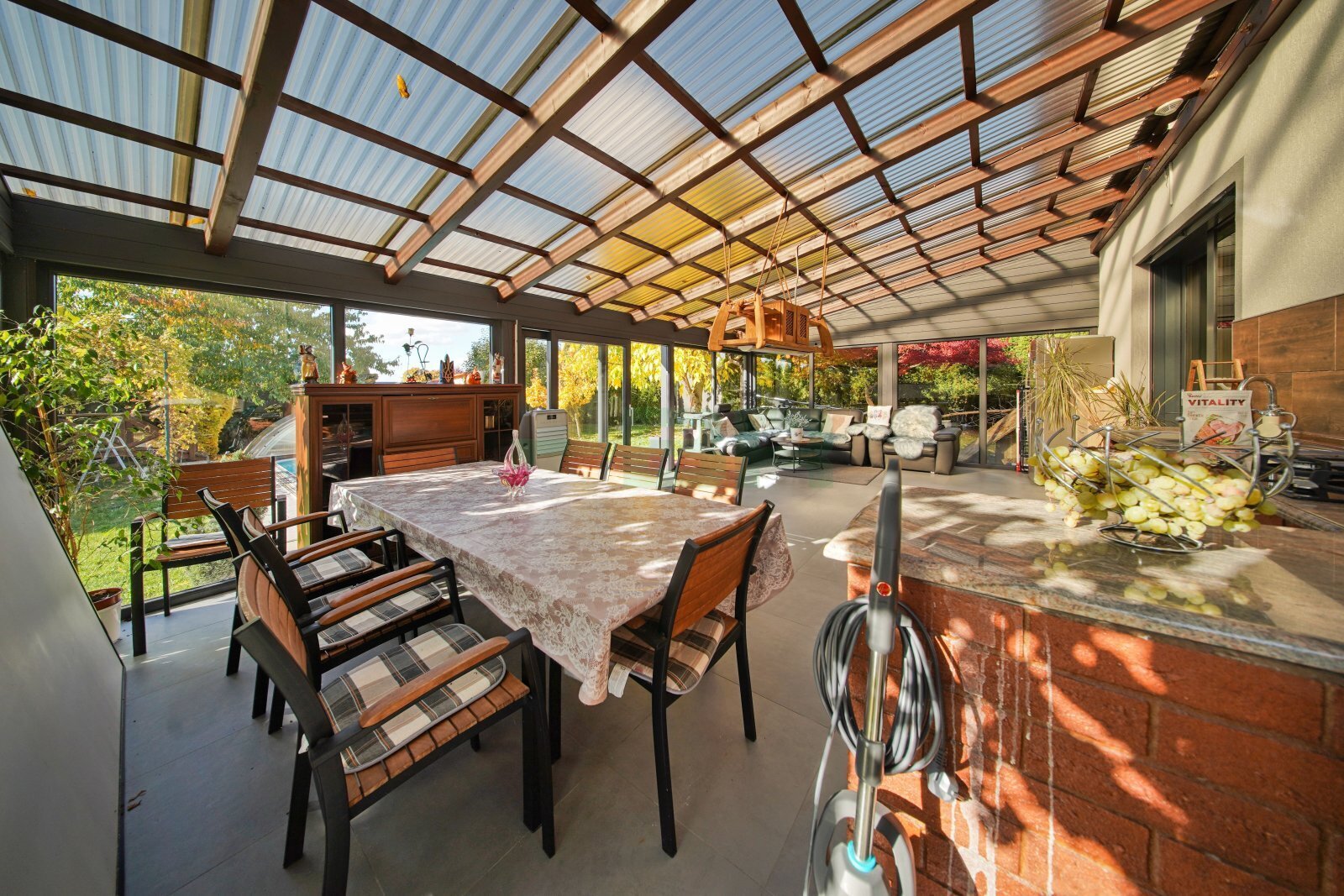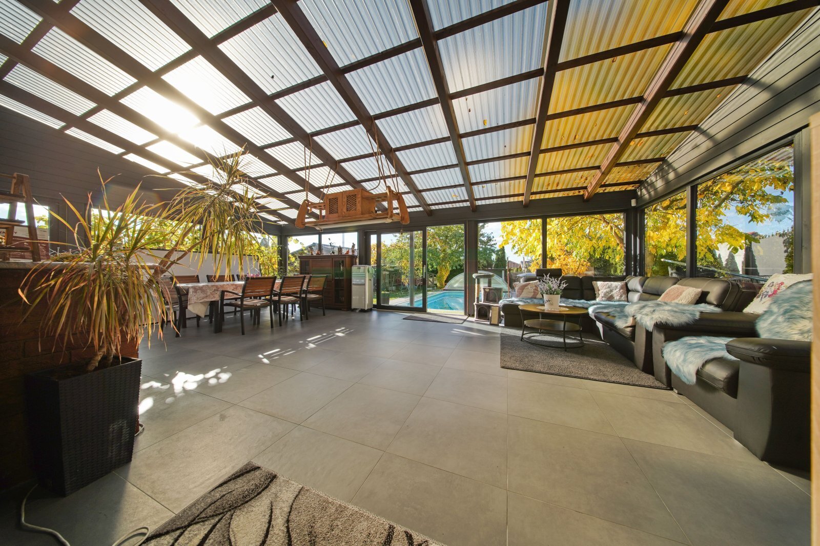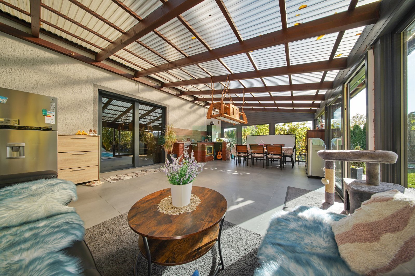 Zastřešená a zasklená terasa (42 m2) s portálovými dveřmi na zahradu i do obývacího pokoje. Celá terasa také disponuje předokenními roletami! Dále je zde venkovní kuchyňská linka s el. troubou, plynovou varnou deskou a dřezem.