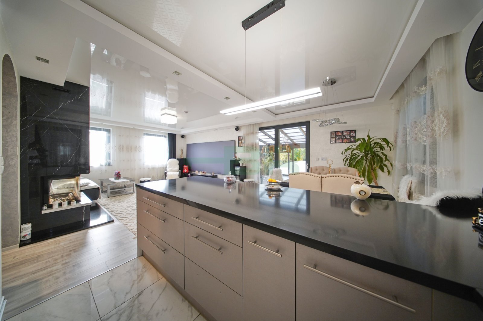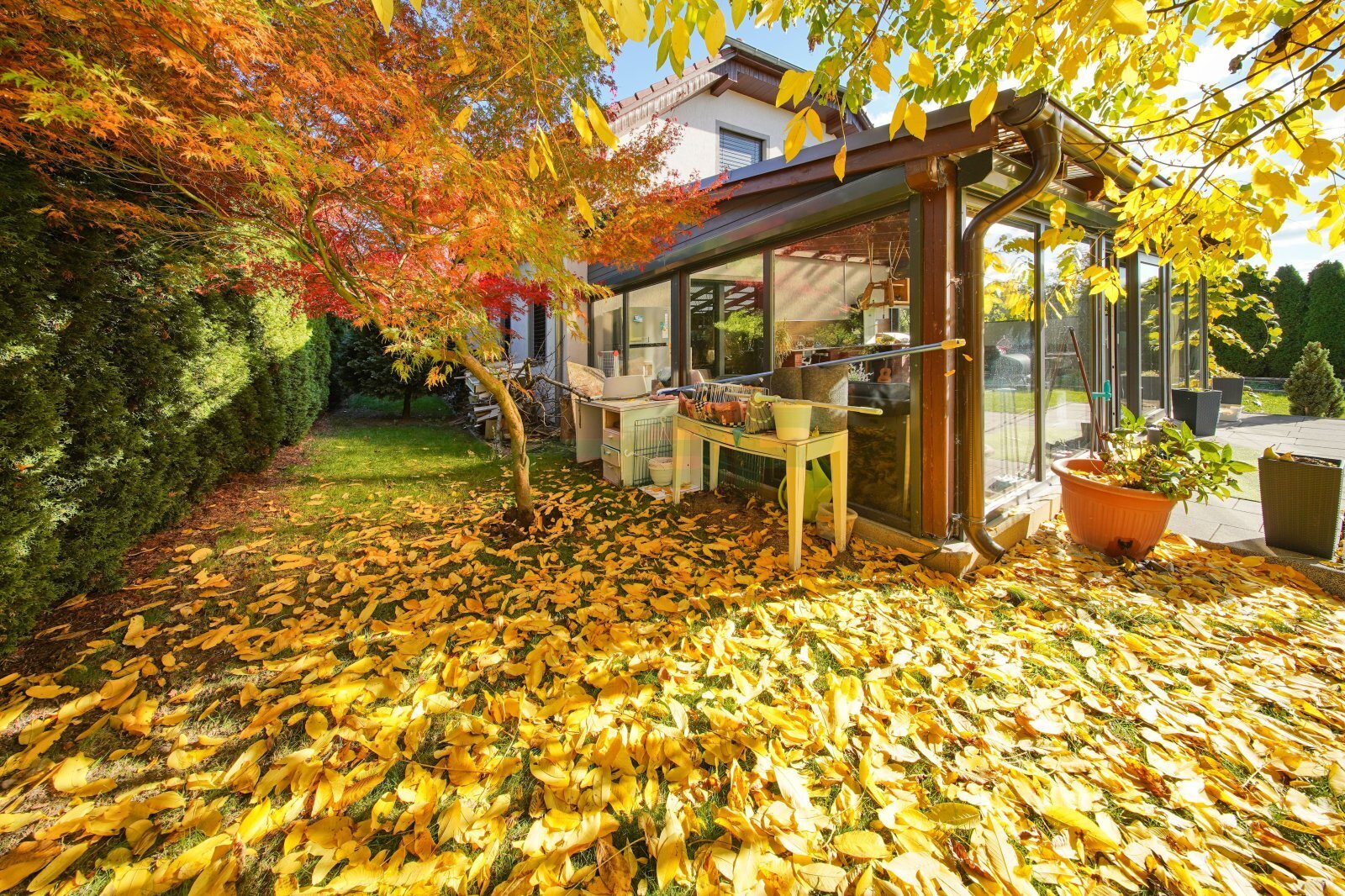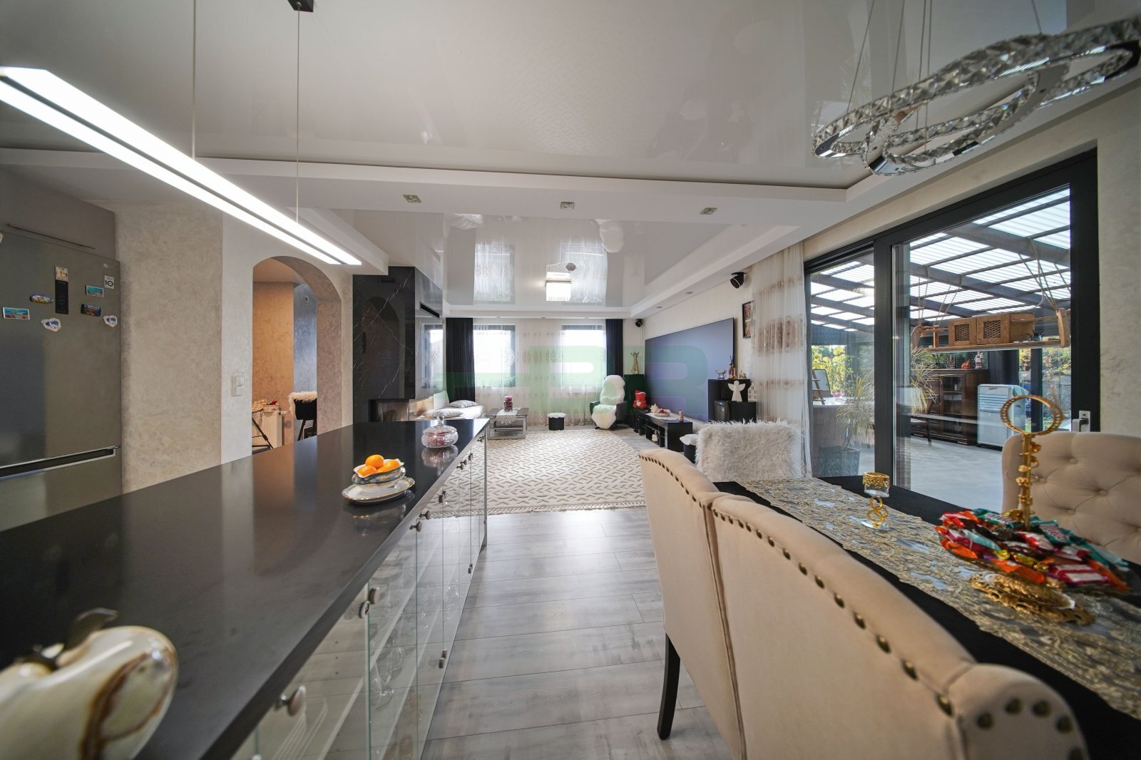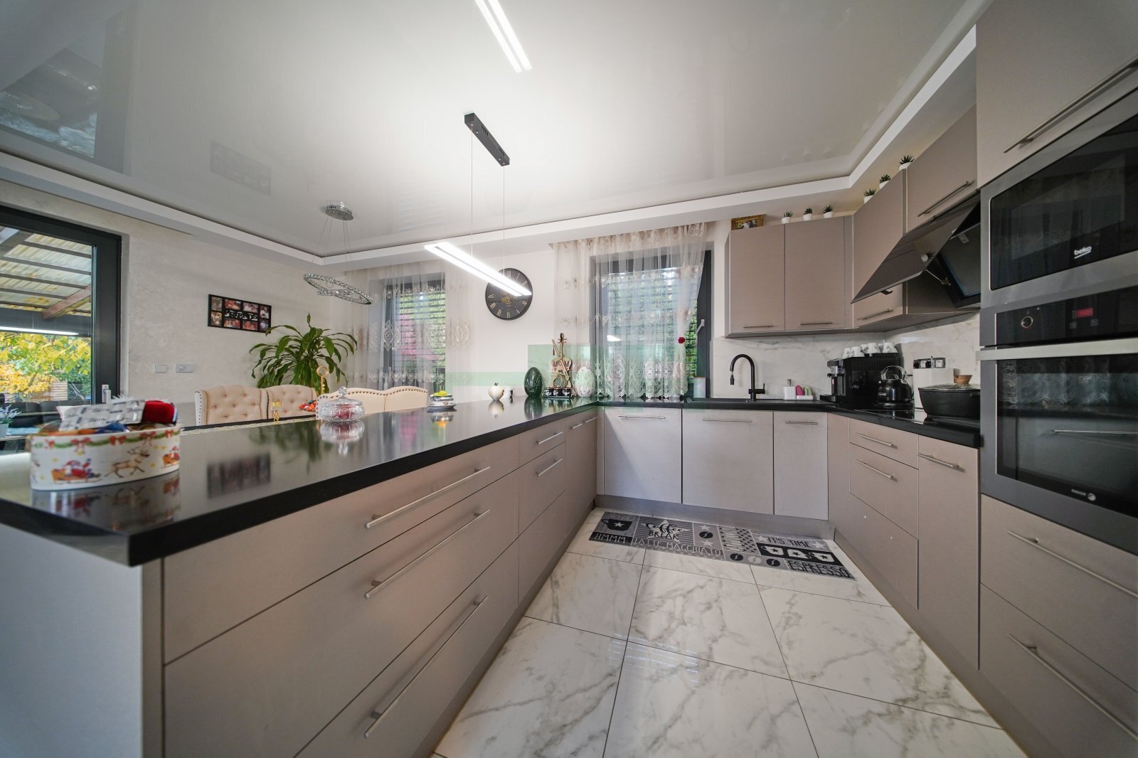 Zastřešená a zasklená terasa (42 m2) s portálovými dveřmi na zahradu i do obývacího pokoje. Celá terasa také disponuje předokenními roletami! Dále je zde venkovní kuchyňská linka s el. troubou, plynovou varnou deskou a dřezem.