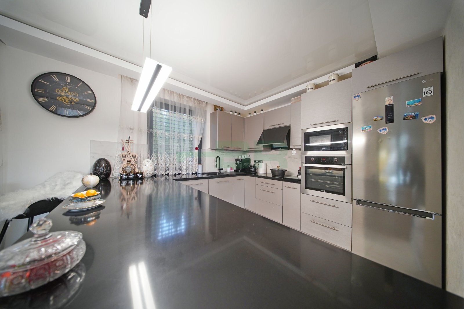 Kuchyňská linka s vestavnými spotřebiči (myčka, indukční varná deska, horkovzdušná trouba, mikrovlnka, lednice a digestoř s odtahem do fasády).