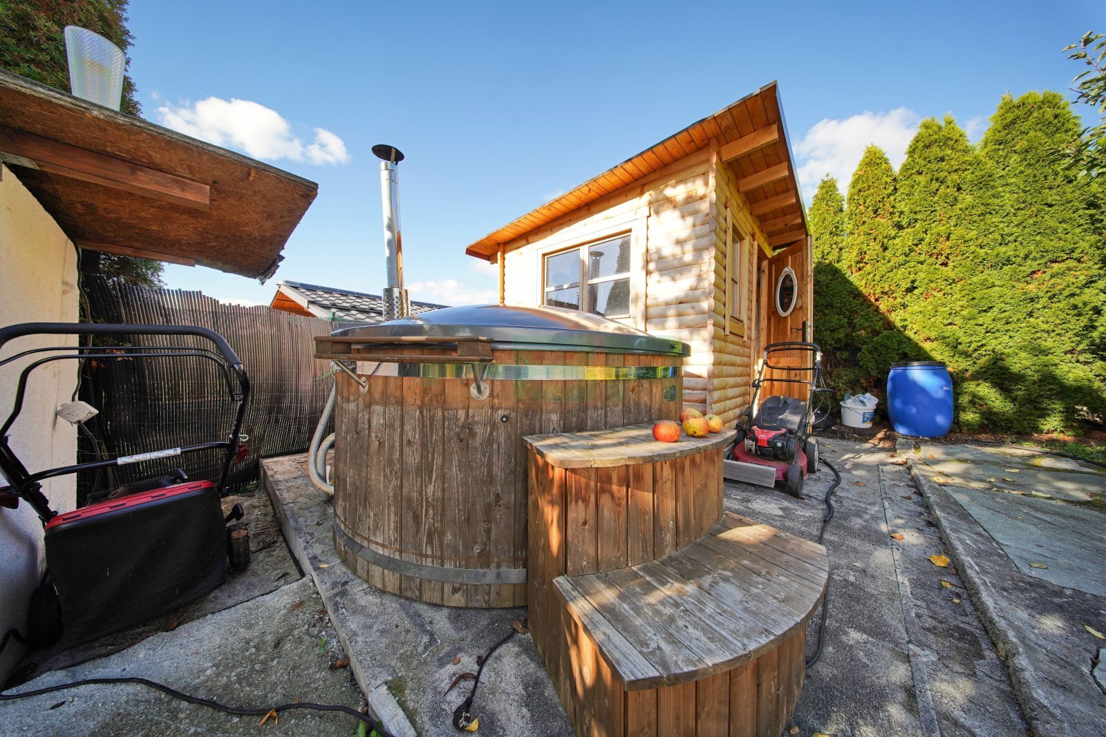 Venkovní vířivka s topidlem na dřevo. Stejně je vytápěná i sauna.