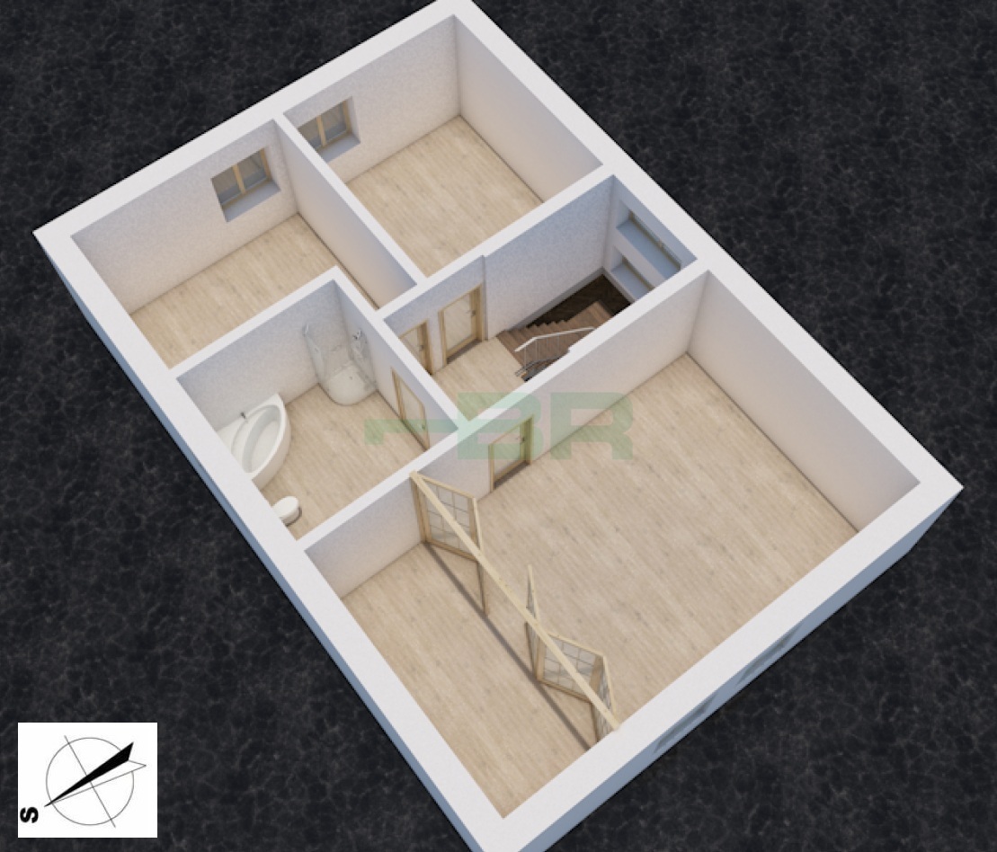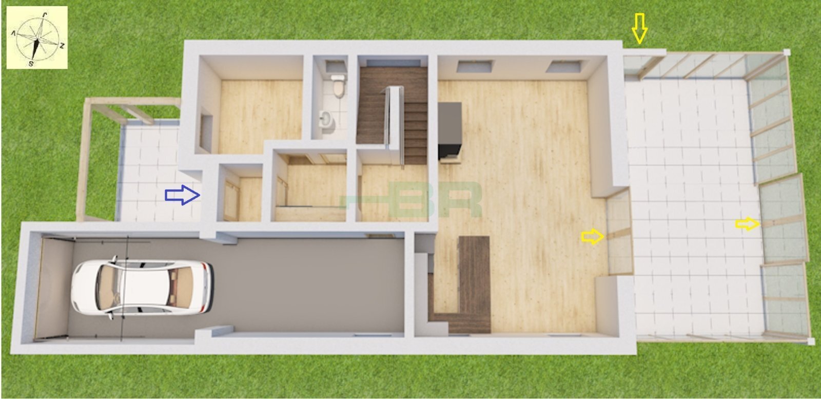 V 1. NP se nachází obývací pokoj s kuchyňským koutem (43,6 m2) se čtyřmi okny a velkými portálovými dveřmi a se vstupem na terasu, pracovna, hala, zádveří, koupelna s oknem, sprchovým koutem, místem na pračku a s WC.