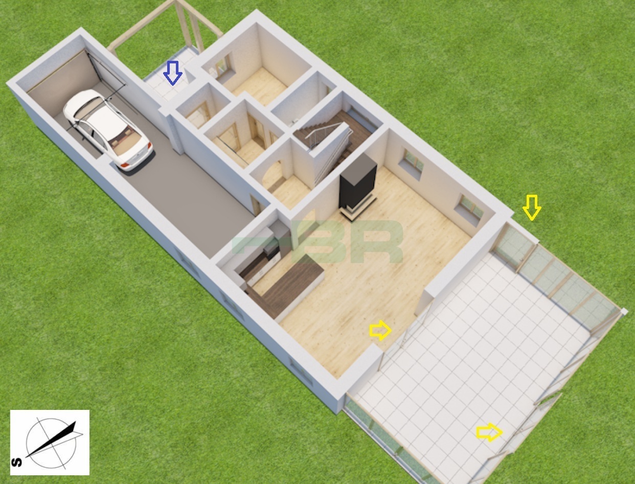 Dvě parkovací místa v garáži za sebou a další před domem. Vjezdové rozměry – šířka 293 cm, výška 202 cm.