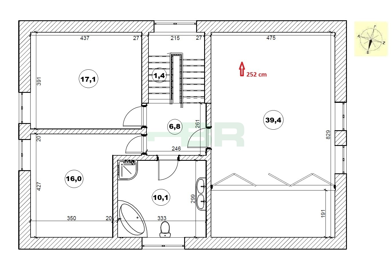 Ve 2. NP prostorná centrální chodba se samostatnými vstupy do všech jednotlivých místností – třech ložnic (jedna s obrovskou šatnou) a do velké koupelny (10 m2) s oknem, rohovou vanou, sprchovým koutem a dvěma umyvadly.