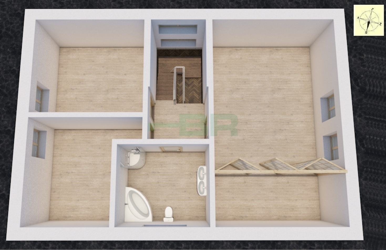 Schodiště do patra je betonové a prosvětlené dvěma okny.