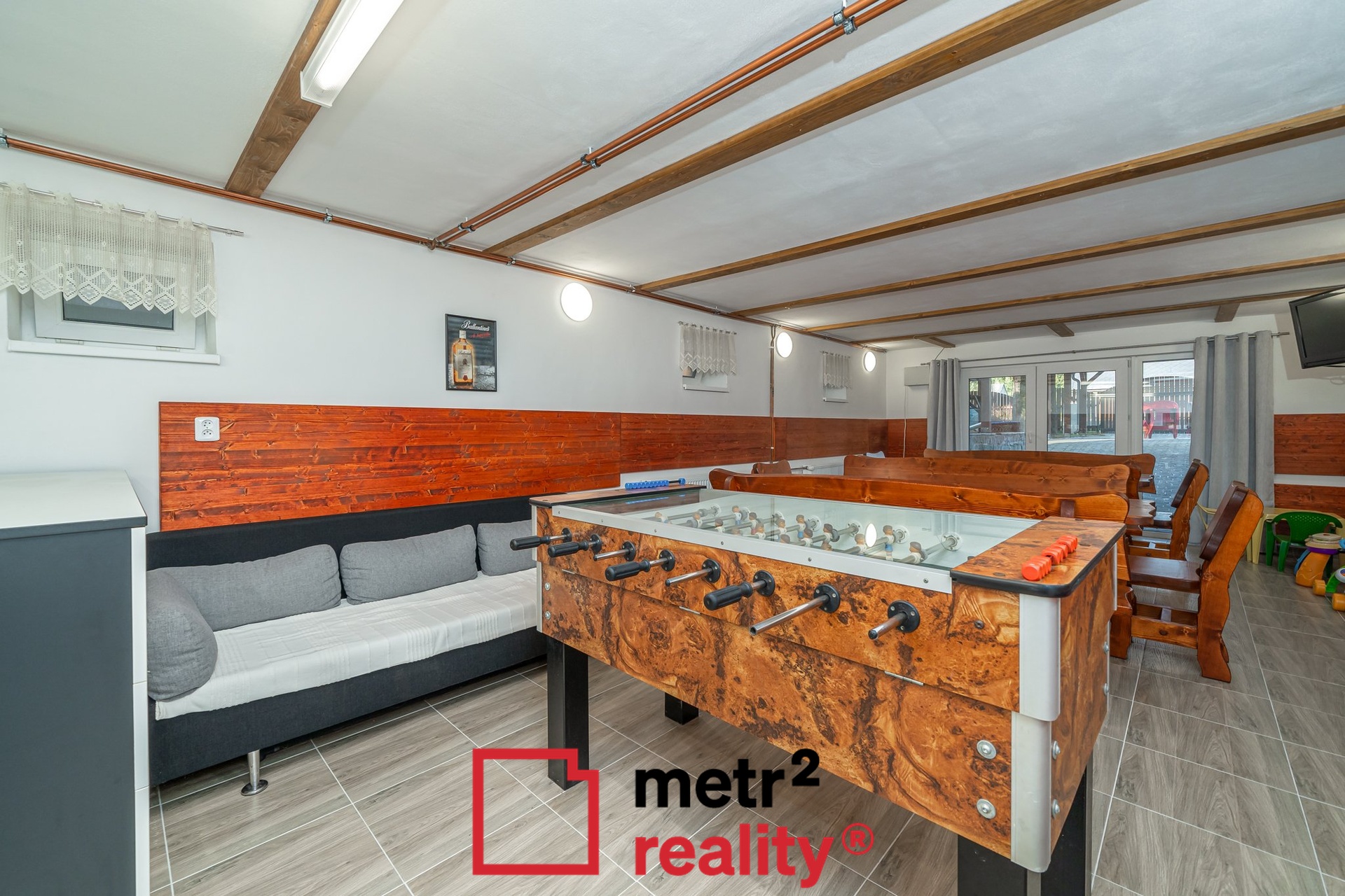 - Nadstandardní technické a sociální zázemí se soukromou wellness zónou a prostornou společenskou místností s posezením, dětským koutem a venkovním bazénem
