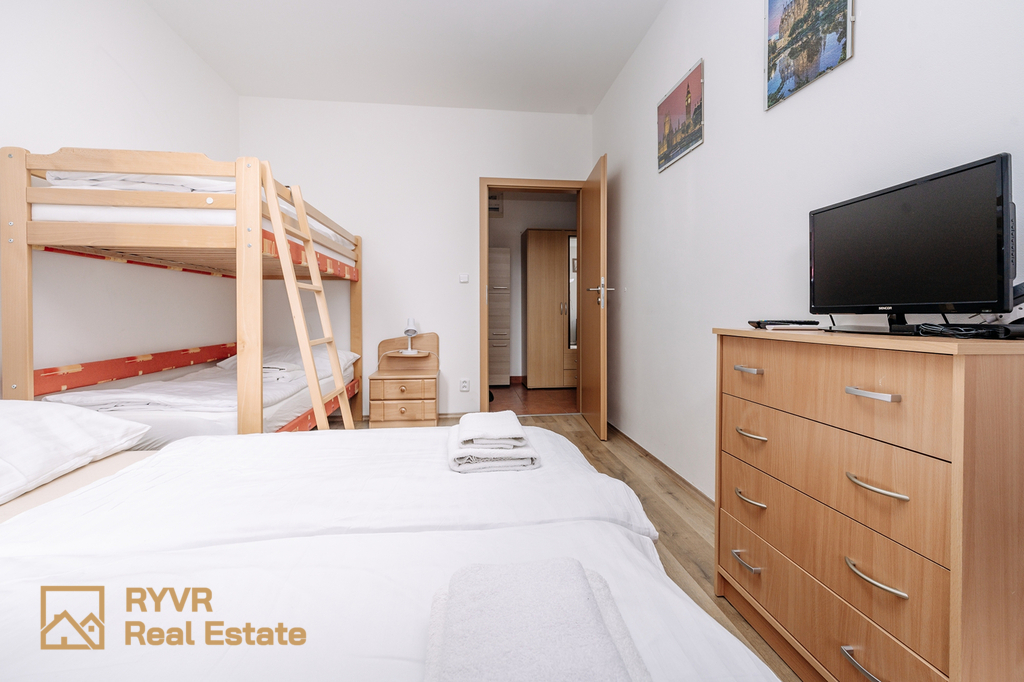 Apartmán je uzpůsoben k ubytování až 6-ti osob. Ložnice je vybavena King Size postelí a palandou se vstupem na balkón. Kuchyňská linka, sporák s troubou, mikrovlnná trouba, myčka na nádobí, lednice, TV, internet. Součástní je jídelní stůl s posezením, rozkladácí sofa. Z obývacího pokoje je taktéž vstup na balkon. Koupelna se sprchovým koutem a WC, vytápěno vlastním el.kotlem, ohřev vody zajištěn boilerem.