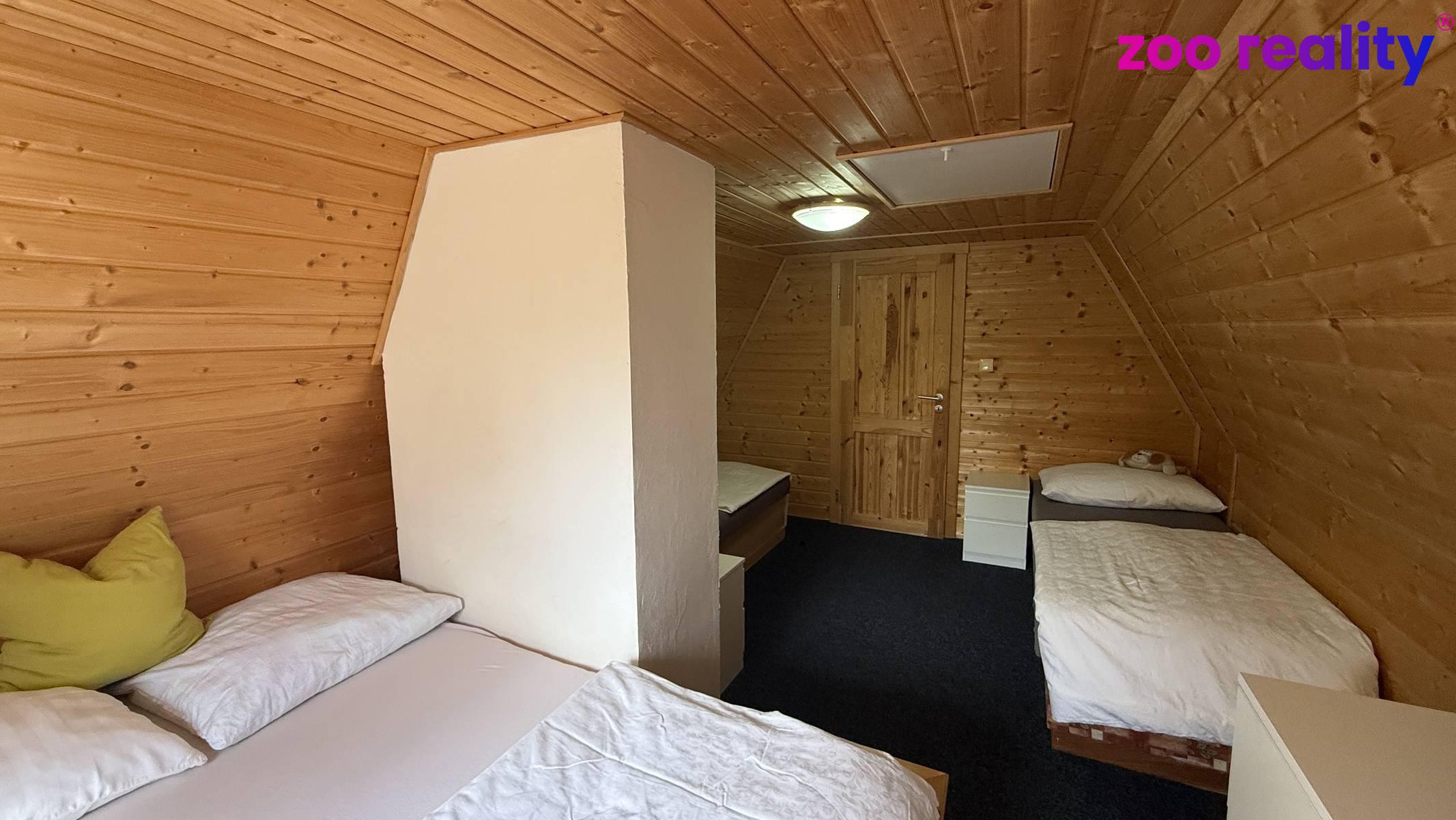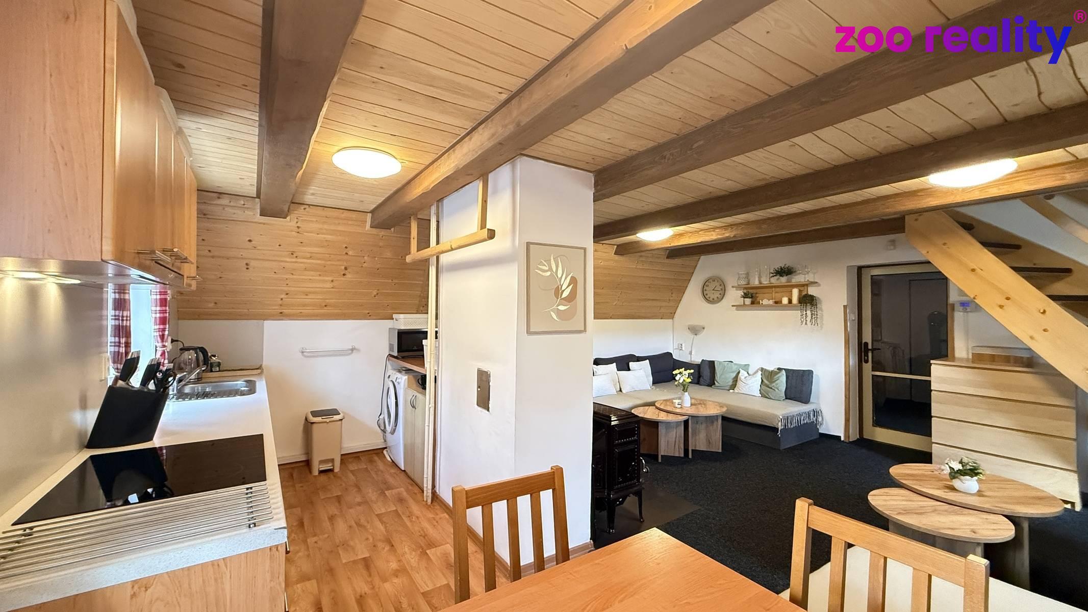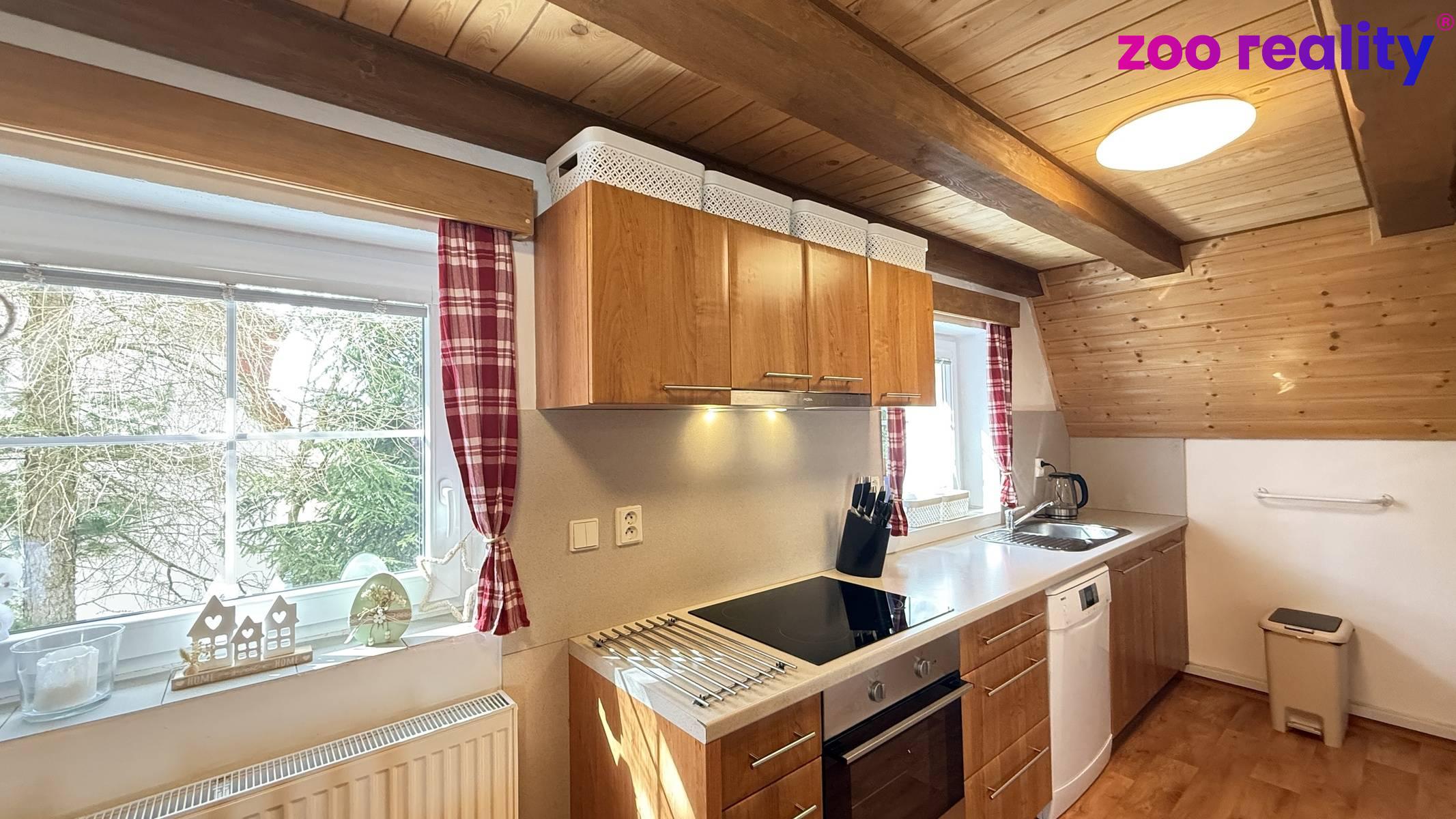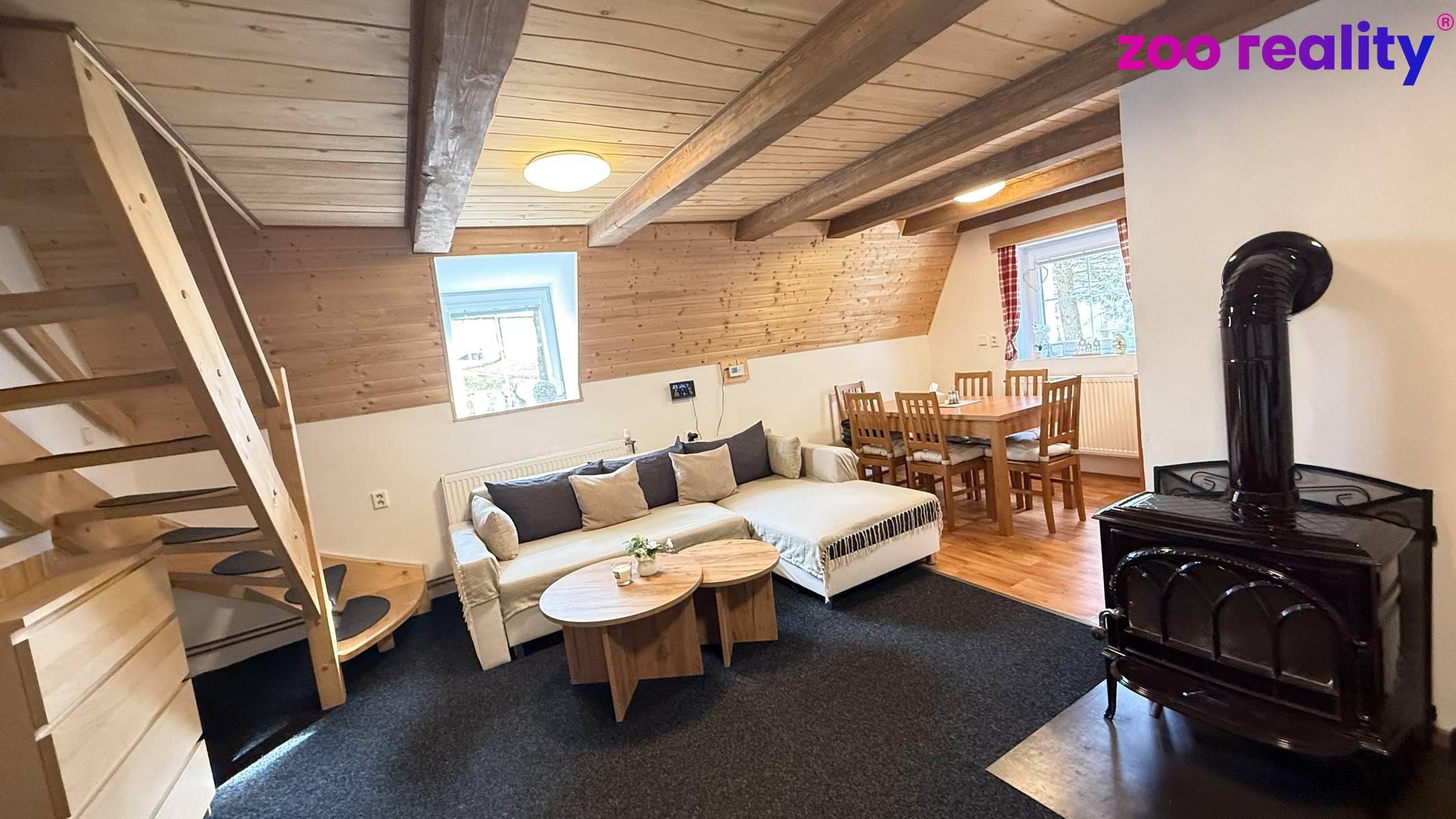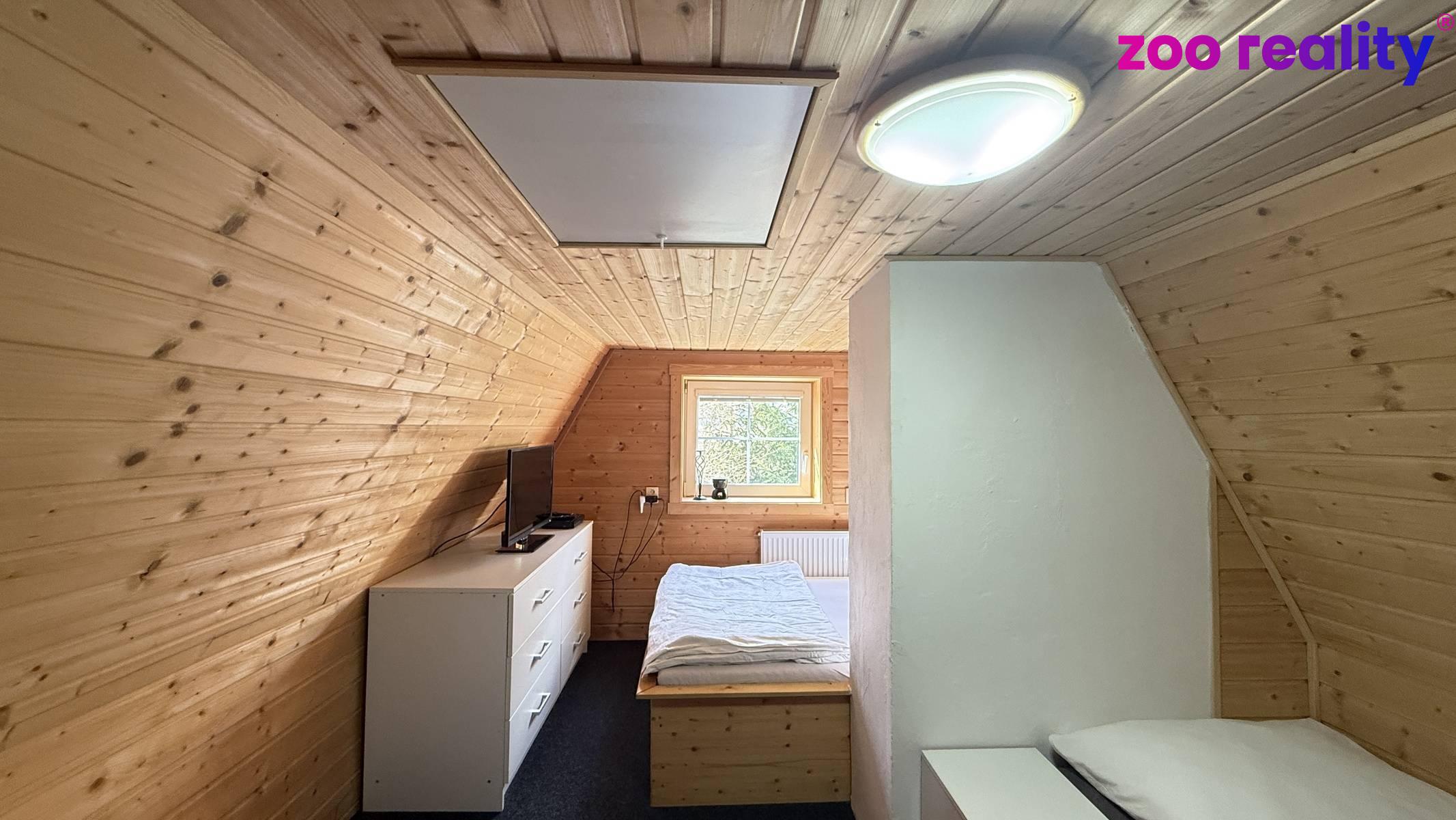 Nabízíme k prodeji rodinný dům se zahradou (1.018 m2), v obci Háj u Klínovce, která je částí města Loučná pod Klínovcem v Krušných horách, okres Chomutov. Nemovitost se nachází přibližně 30 km jihozápadně od Chomutova. Obec se v posledních letech proměnila v oblíbené rekreační centrum, zaměřené zejména na zimní sporty na nedalekém areálu Klínovec a v letních měsících na cykloturistiku po Krušných horách. Dům prošel kompletní rekonstrukcí a je plně vybaven k okamžitému nastěhování. V přízemí se nachází obývací pokoj s kuchyňským koutem, který je vybaven kuchyňskou linkou se sklokeramickou deskou, vestavěnou troubou, myčkou a pračkou. Dominantou obývacího pokoje jsou krbová kamna. U hlavního vchodu je předsíň s velkým botníkem a policí na lyže, dále navazuje druhá předsíň, ze které je vstup do koupelny se sprchovým koutem a umyvadlem, WC je samostatné. Součástí přízemí je také zděná šatna. Do podkroví vede dřevěné schodiště, kde se nacházejí dvě samostatné ložnice, každá disponuje 4 lůžky a je vybavena televizí. V zadní částí domu se nachází samostatná bytová jednotka, která nabízí vlastní zázemí - kuchyňku s dvouplotýnkovou sklokeramickou deskou, ložnici se dvěma lůžky a koupelnu se sprchovým koutem a WC. Dále jsou k dispozici dva uzamykatelné prostory sloužící jako sklad zahradního nábytku,, sklad na uhlí a technická místnost s elektrickým kotlem a kotlem na tuhá paliva. Na zahradě je venkovní posezení s ohništěm, a dva dřevníky. Dům má vlastní ČOV a studnu na pitnou vodu, která je rozvedena do domu, s možností napojení i na místní vodovod. U silnice je vybudované parkování pro dva osobní automobily. Nedaleko od domu je zastávka SKI BUSu. Pro více info volejte makléři.