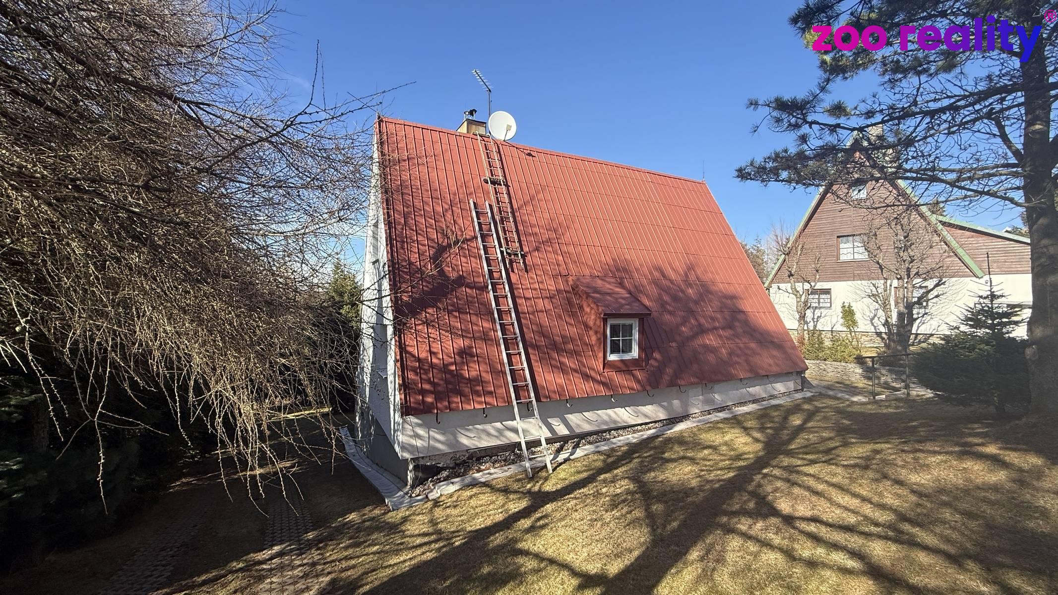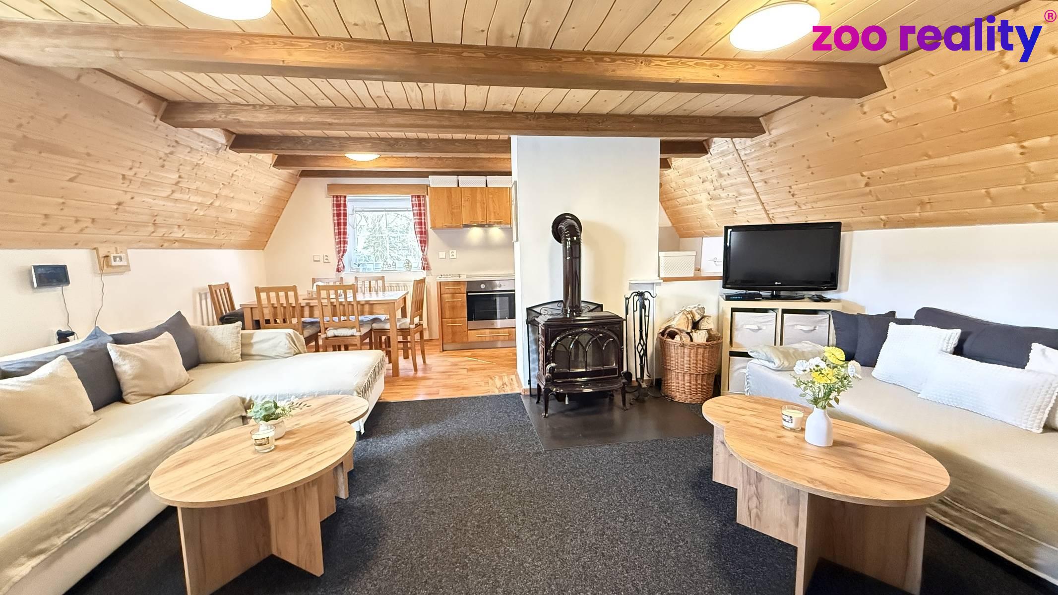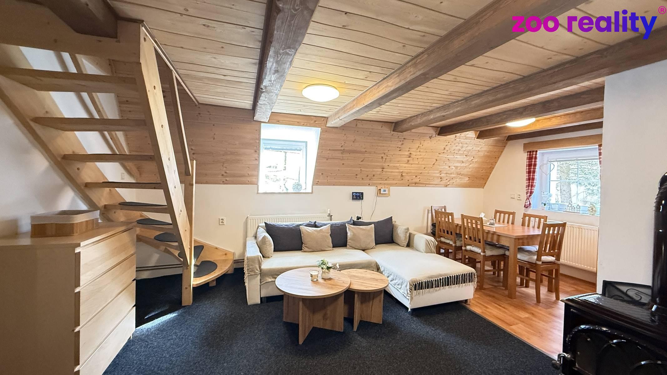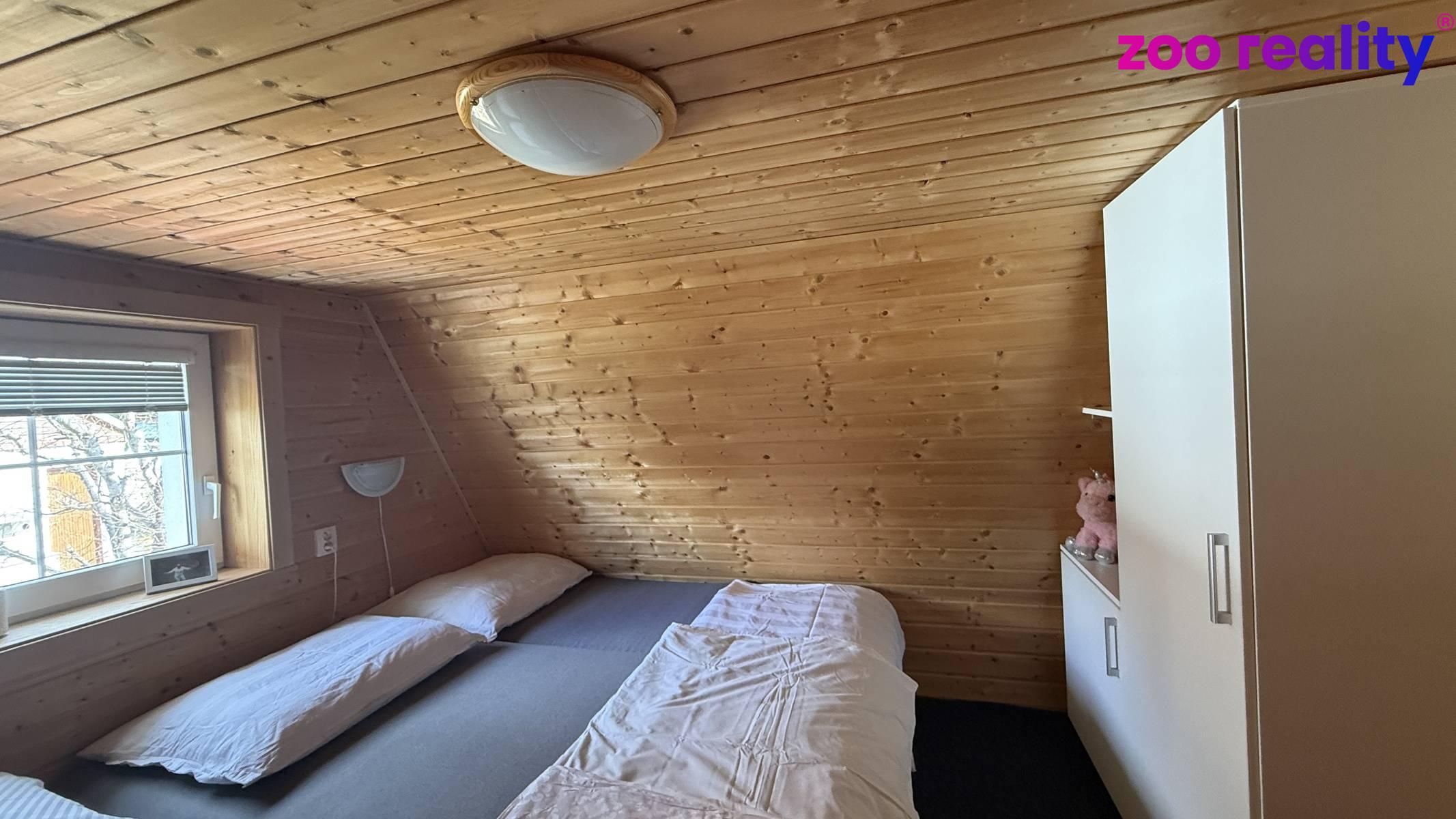 Nabízíme k prodeji rodinný dům se zahradou (1.018 m2), v obci Háj u Klínovce, která je částí města Loučná pod Klínovcem v Krušných horách, okres Chomutov. Nemovitost se nachází přibližně 30 km jihozápadně od Chomutova. Obec se v posledních letech proměnila v oblíbené rekreační centrum, zaměřené zejména na zimní sporty na nedalekém areálu Klínovec a v letních měsících na cykloturistiku po Krušných horách. Dům prošel kompletní rekonstrukcí a je plně vybaven k okamžitému nastěhování. V přízemí se nachází obývací pokoj s kuchyňským koutem, který je vybaven kuchyňskou linkou se sklokeramickou deskou, vestavěnou troubou, myčkou a pračkou. Dominantou obývacího pokoje jsou krbová kamna. U hlavního vchodu je předsíň s velkým botníkem a policí na lyže, dále navazuje druhá předsíň, ze které je vstup do koupelny se sprchovým koutem a umyvadlem, WC je samostatné. Součástí přízemí je také zděná šatna. Do podkroví vede dřevěné schodiště, kde se nacházejí dvě samostatné ložnice, každá disponuje 4 lůžky a je vybavena televizí. V zadní částí domu se nachází samostatná bytová jednotka, která nabízí vlastní zázemí - kuchyňku s dvouplotýnkovou sklokeramickou deskou, ložnici se dvěma lůžky a koupelnu se sprchovým koutem a WC. Dále jsou k dispozici dva uzamykatelné prostory sloužící jako sklad zahradního nábytku,, sklad na uhlí a technická místnost s elektrickým kotlem a kotlem na tuhá paliva. Na zahradě je venkovní posezení s ohništěm, a dva dřevníky. Dům má vlastní ČOV a studnu na pitnou vodu, která je rozvedena do domu, s možností napojení i na místní vodovod. U silnice je vybudované parkování pro dva osobní automobily. Nedaleko od domu je zastávka SKI BUSu. Pro více info volejte makléři.
