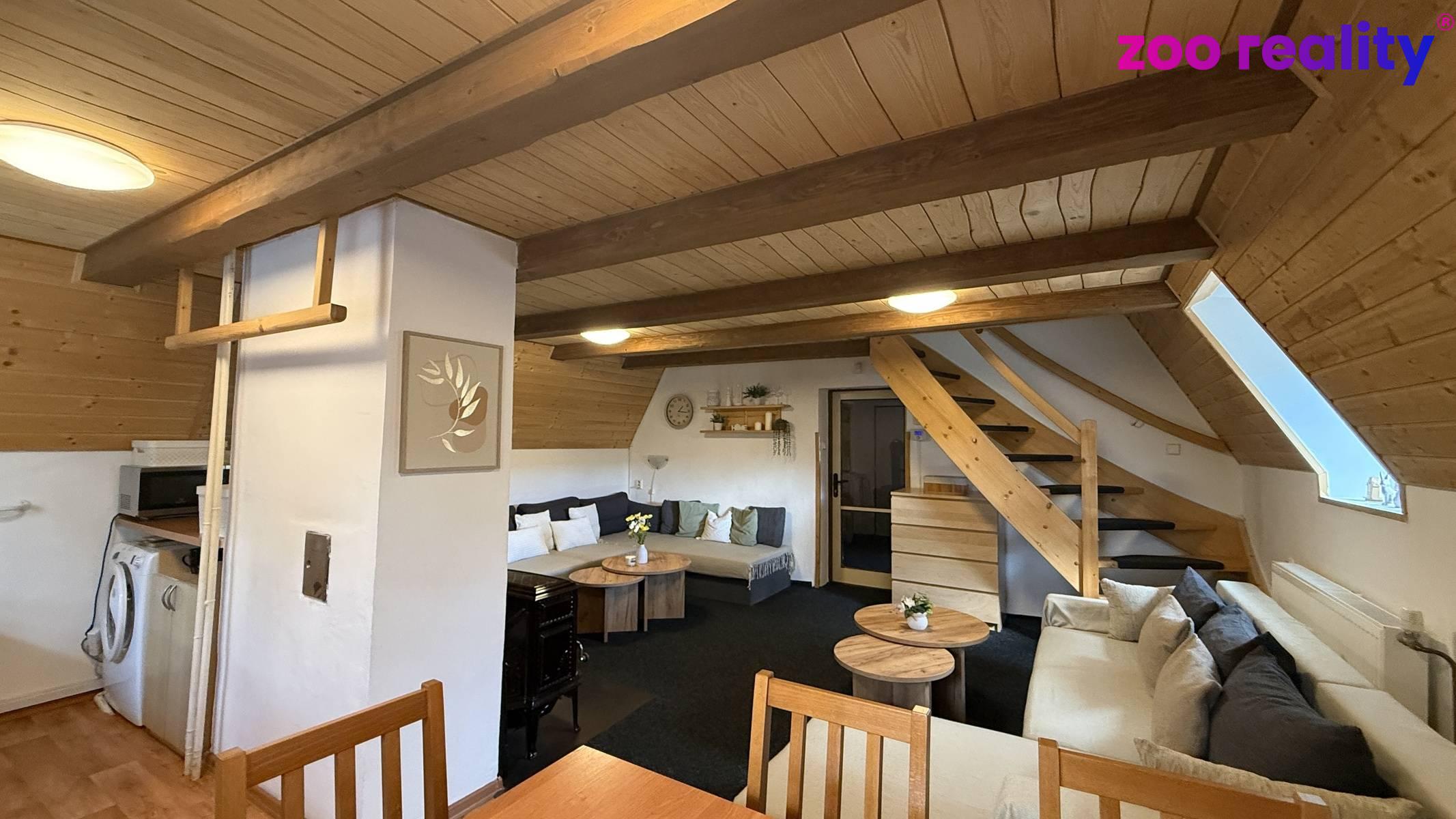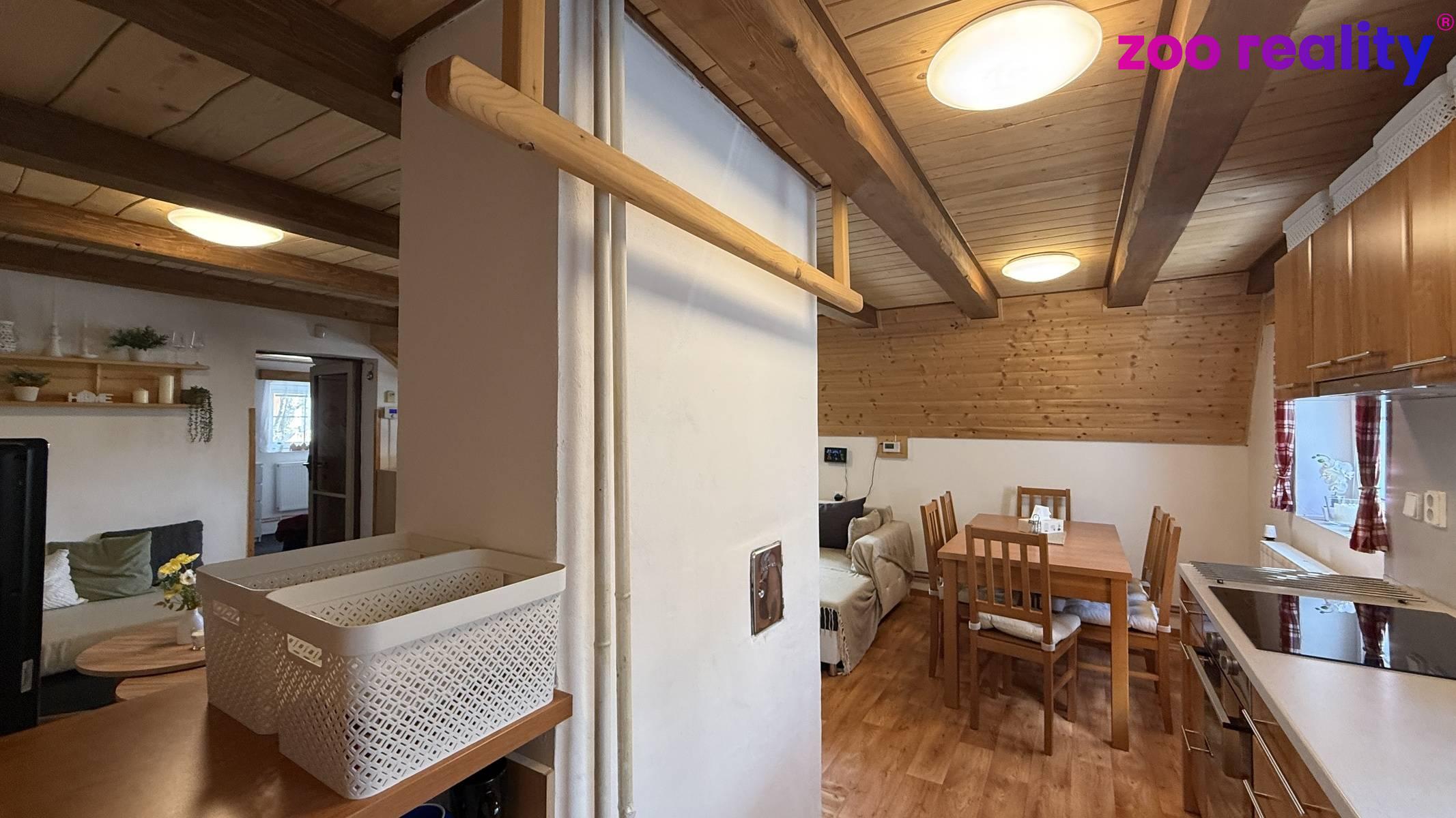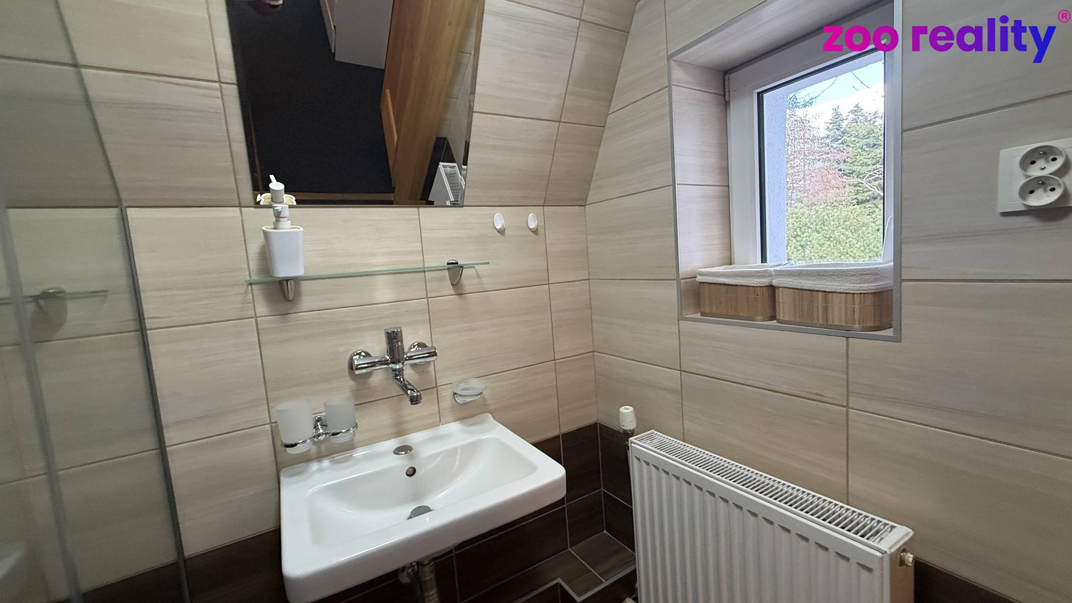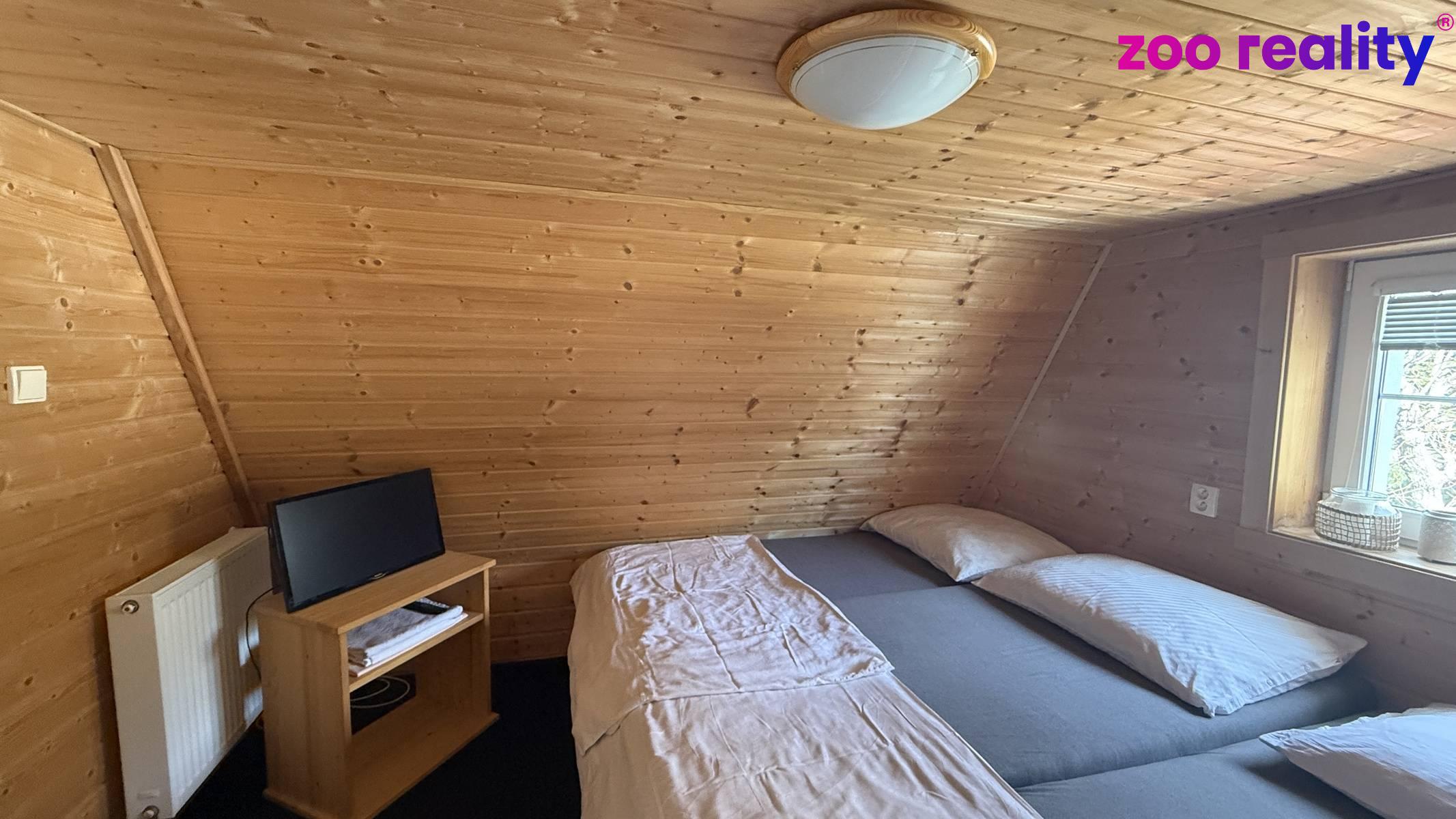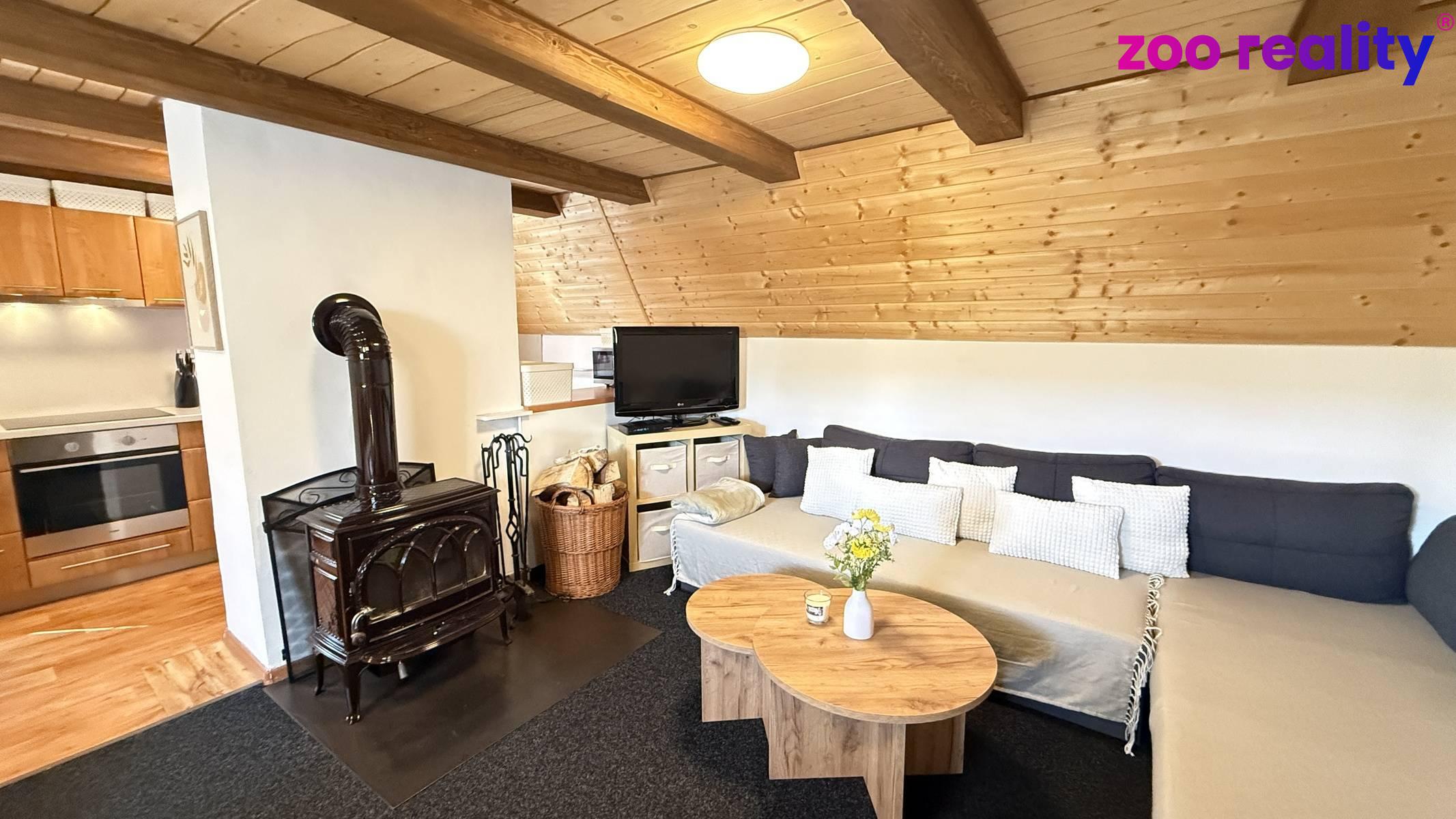 Nabízíme k prodeji rodinný dům se zahradou (1.018 m2), v obci Háj u Klínovce, která je částí města Loučná pod Klínovcem v Krušných horách, okres Chomutov. Nemovitost se nachází přibližně 30 km jihozápadně od Chomutova. Obec se v posledních letech proměnila v oblíbené rekreační centrum, zaměřené zejména na zimní sporty na nedalekém areálu Klínovec a v letních měsících na cykloturistiku po Krušných horách. Dům prošel kompletní rekonstrukcí a je plně vybaven k okamžitému nastěhování. V přízemí se nachází obývací pokoj s kuchyňským koutem, který je vybaven kuchyňskou linkou se sklokeramickou deskou, vestavěnou troubou, myčkou a pračkou. Dominantou obývacího pokoje jsou krbová kamna. U hlavního vchodu je předsíň s velkým botníkem a policí na lyže, dále navazuje druhá předsíň, ze které je vstup do koupelny se sprchovým koutem a umyvadlem, WC je samostatné. Součástí přízemí je také zděná šatna. Do podkroví vede dřevěné schodiště, kde se nacházejí dvě samostatné ložnice, každá disponuje 4 lůžky a je vybavena televizí. V zadní částí domu se nachází samostatná bytová jednotka, která nabízí vlastní zázemí - kuchyňku s dvouplotýnkovou sklokeramickou deskou, ložnici se dvěma lůžky a koupelnu se sprchovým koutem a WC. Dále jsou k dispozici dva uzamykatelné prostory sloužící jako sklad zahradního nábytku,, sklad na uhlí a technická místnost s elektrickým kotlem a kotlem na tuhá paliva. Na zahradě je venkovní posezení s ohništěm, a dva dřevníky. Dům má vlastní ČOV a studnu na pitnou vodu, která je rozvedena do domu, s možností napojení i na místní vodovod. U silnice je vybudované parkování pro dva osobní automobily. Nedaleko od domu je zastávka SKI BUSu. Pro více info volejte makléři.