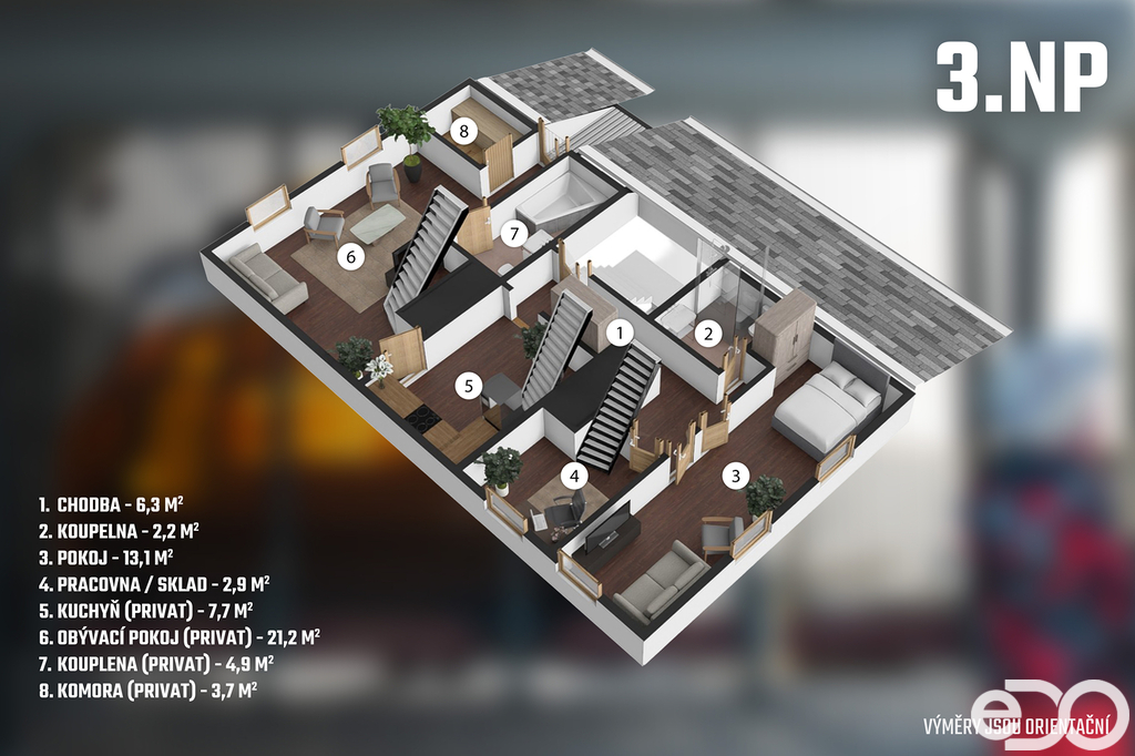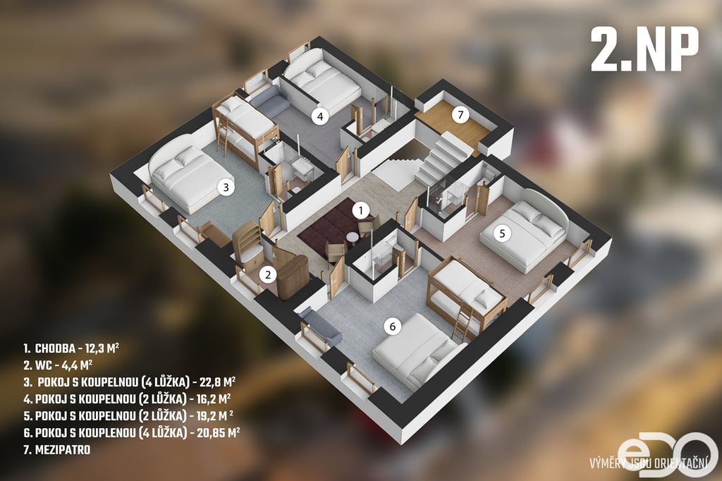 Dvě nadzemní podlaží a podkroví, celková užitná plocha je 290 m². Výměra je pouze orientační. K nemovitosti dále patří sklep a dílna na zahradě. Najdete zde 5 pokojů, společenskou místnost s krbem, kuchyň, technické zázemí a samostatný byt v podkroví. Hlavní zdroj vytápění jsou akumulační kamna, k vytápění slouží také přímotopy a krbová kamna s výměníkem napojená na radiátory a teplou vodu zajišťují bojlery. Napojeno na veřejný vodovod, odpad sveden do septiku – kanalizační přípojka je cca 10 metrů od domu, stačí ji dodělat. Nad podkrovím je navíc půdní prostor (cca 67 m²), využitelný jako sklad nebo úložné zázemí. U fotografií jsou využity i vizualizace ve velmi nízkém rozsahu.