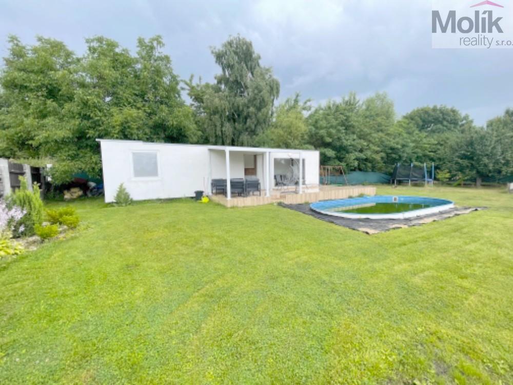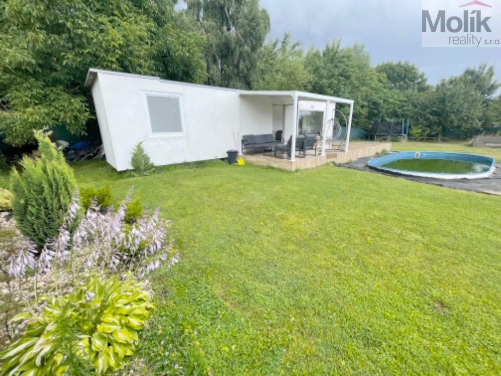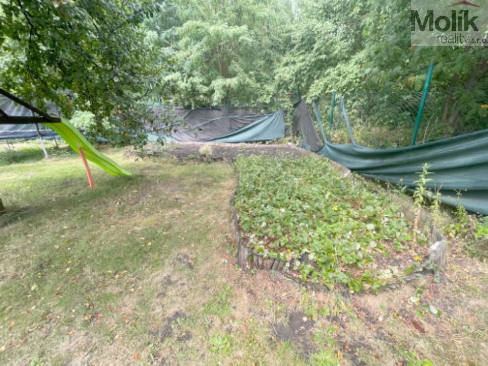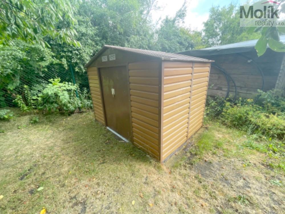 Zahradní dům o ploše 36m2 + terasa 30m2. Terasa s výhledem je z části zakrytá sklopným lamelovým přístřeškem. Dispozici zahradního domku tvoří prostorný obytný prostor, na který navazuje kuchyň, dále je přes chodbu přístupná ložnice a koupelna se sprchovým koutem a (chemické) WC. Dále na pozemku zahrady najdeme posezení s ohništěm, sklad na zahradní náčiní, záhony, vzrostlé stromy atd.