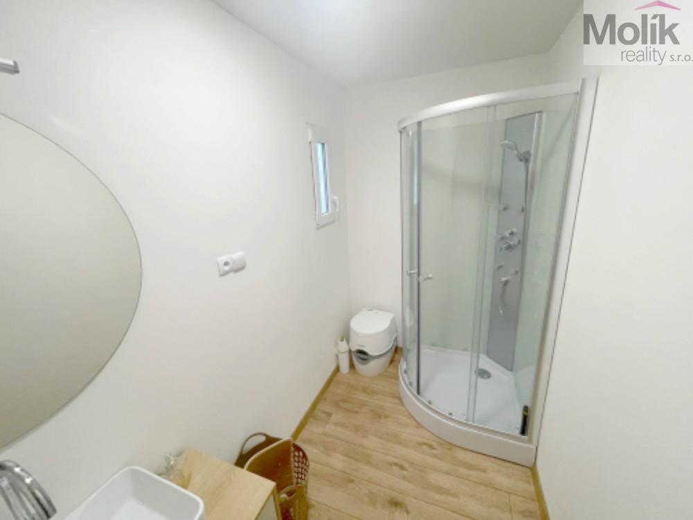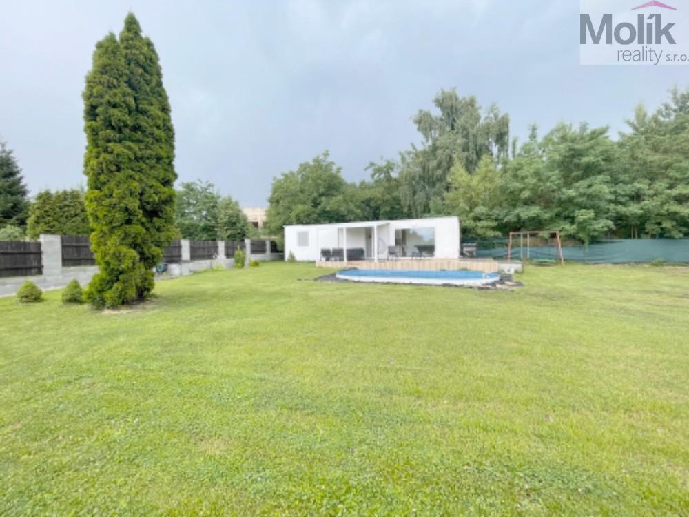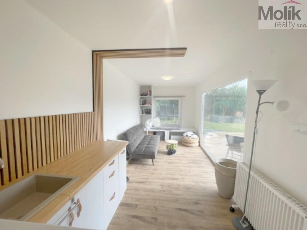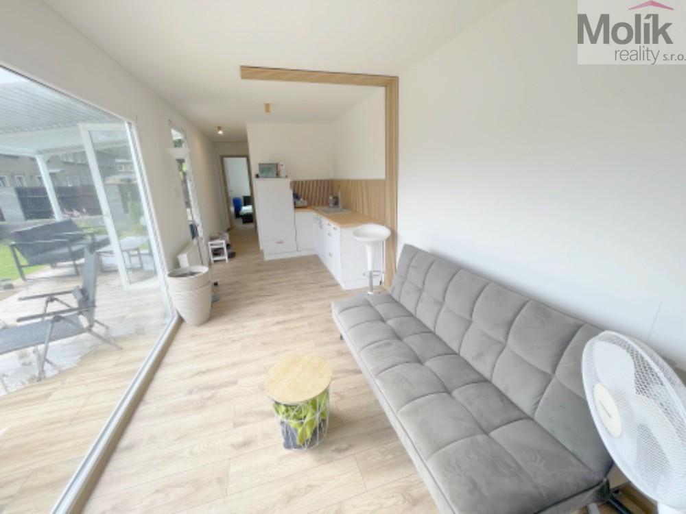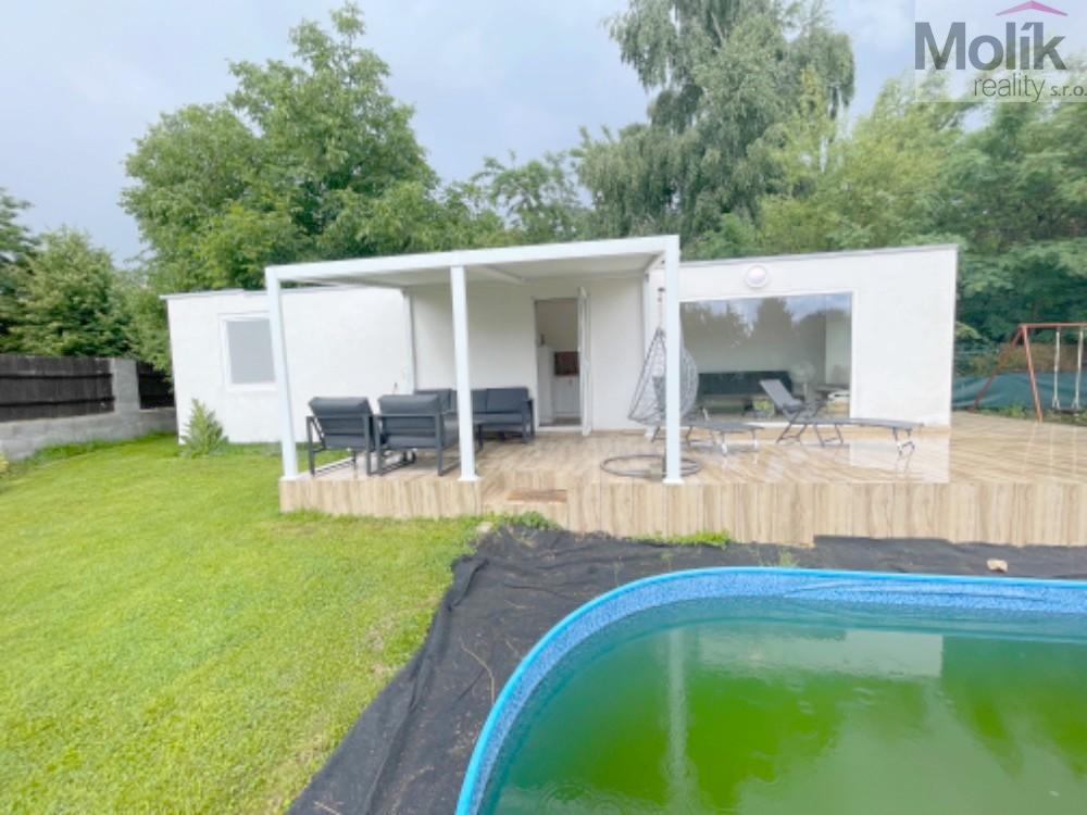 Zahradní dům o ploše 36m2 + terasa 30m2. Terasa s výhledem je z části zakrytá sklopným lamelovým přístřeškem. Dispozici zahradního domku tvoří prostorný obytný prostor, na který navazuje kuchyň, dále je přes chodbu přístupná ložnice a koupelna se sprchovým koutem a (chemické) WC. Dále na pozemku zahrady najdeme posezení s ohništěm, sklad na zahradní náčiní, záhony, vzrostlé stromy atd.
