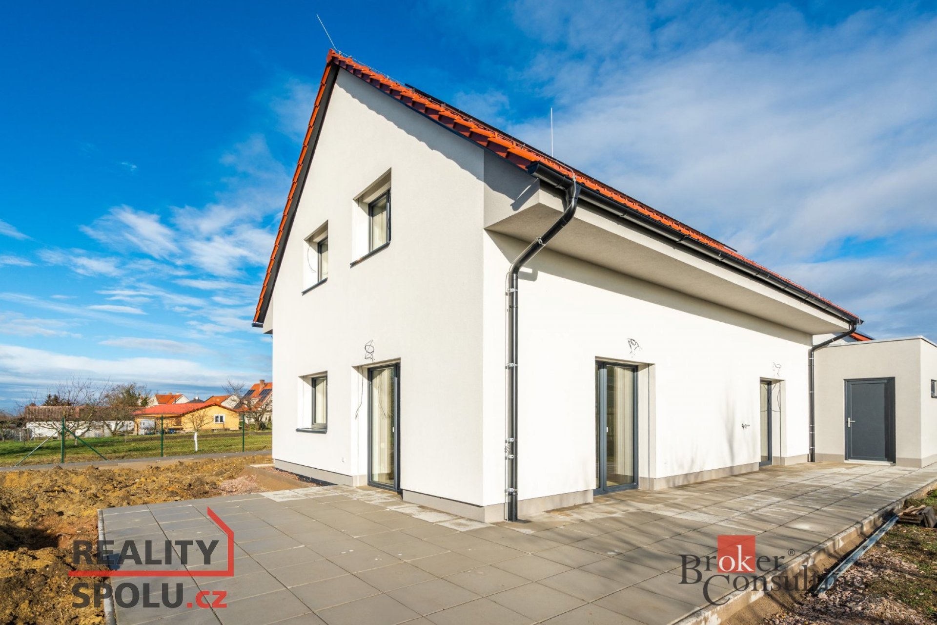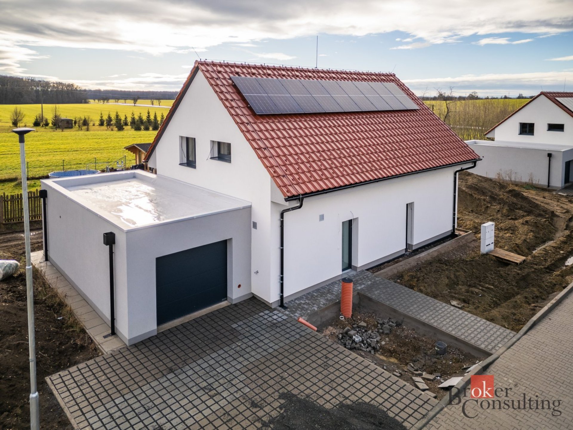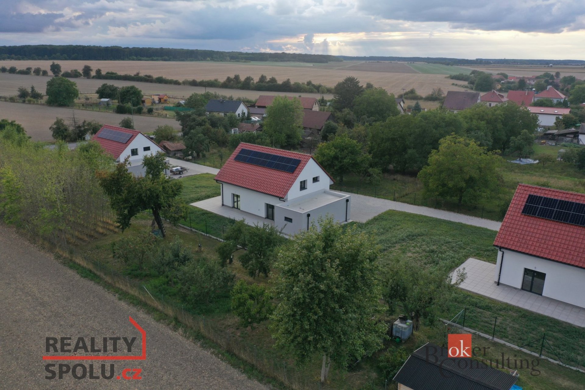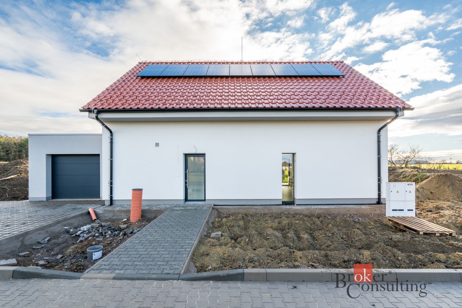 Jedná se o zděnou stavbu (Ytong) se dvěma nadzemními podlažími. Tato novostavba o dispozici 5+kk se nachází na pozemku o rozloze 723 m², přičemž celková plocha domu činí 164,8 m². V přízemí se nachází prostorný obývací pokoj spojený s kuchyní (41,1 m²) a vstupem na terasu (40 m²), dále je zde místnost, která může sloužit jako pokoj pro hosty či pracovna (11,8 m²), koupelna se záchodem (4,6 m²), technická místnost (2,9 m²) a ještě jedna menší místnost pod schody (4,0 m²). V prvním patře jsou dva pokoje s vlastní šatnou (17,8 m² a 16,0 m²), dále ložnice (16,0 m²) se samostatnou šatnou (3,0 m²) přes chodbu a také druhá koupelna (6,1 m²). Jistě také oceníte pudní prostor o velikosti cca 40 m².