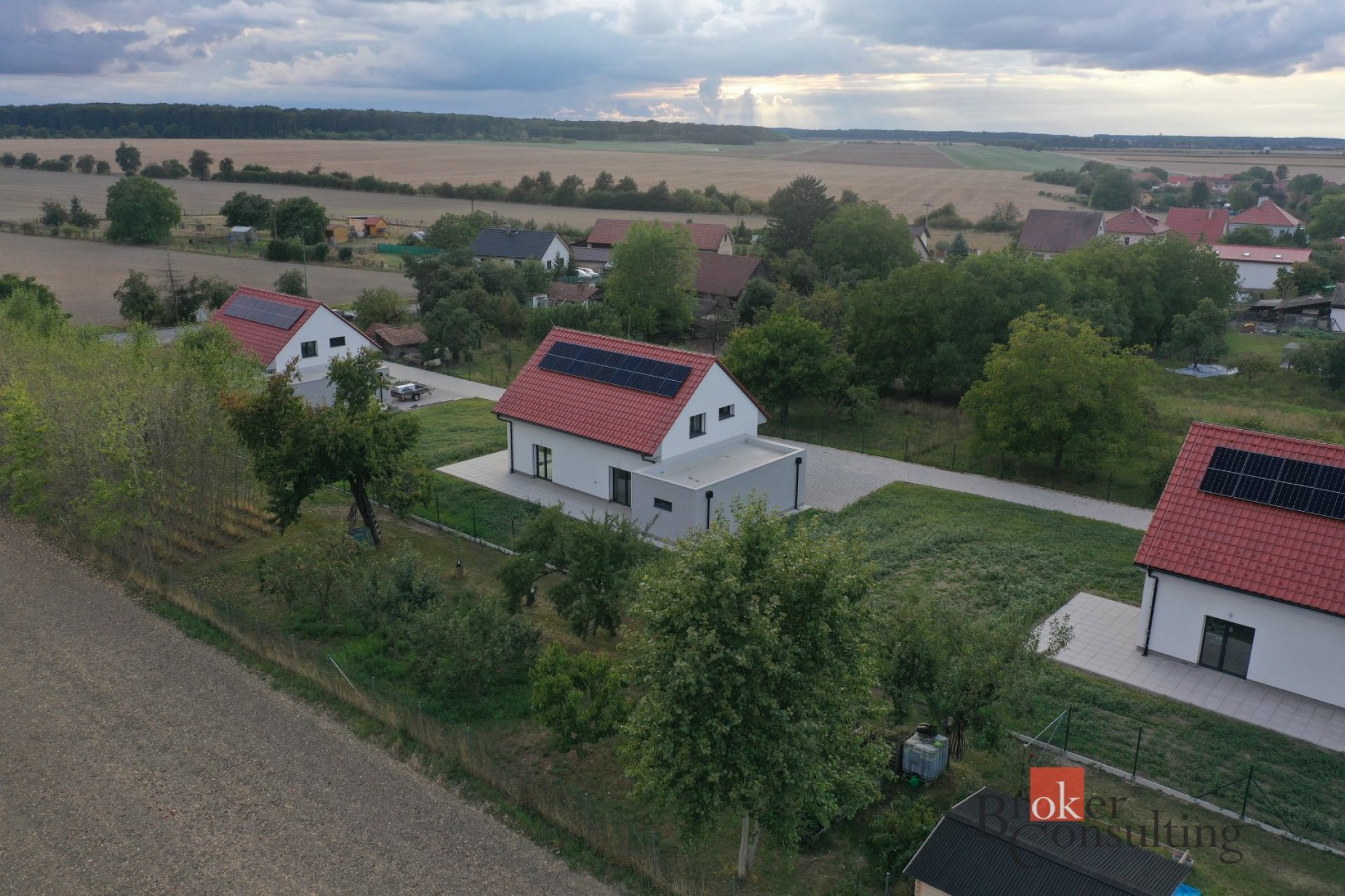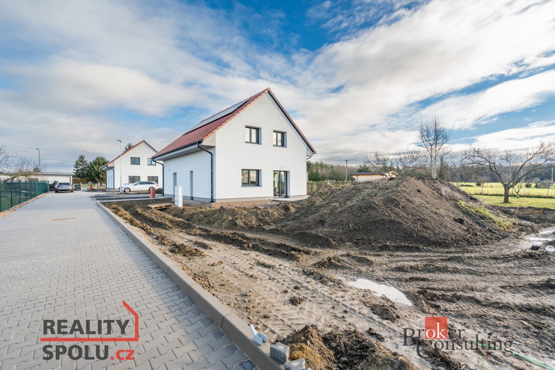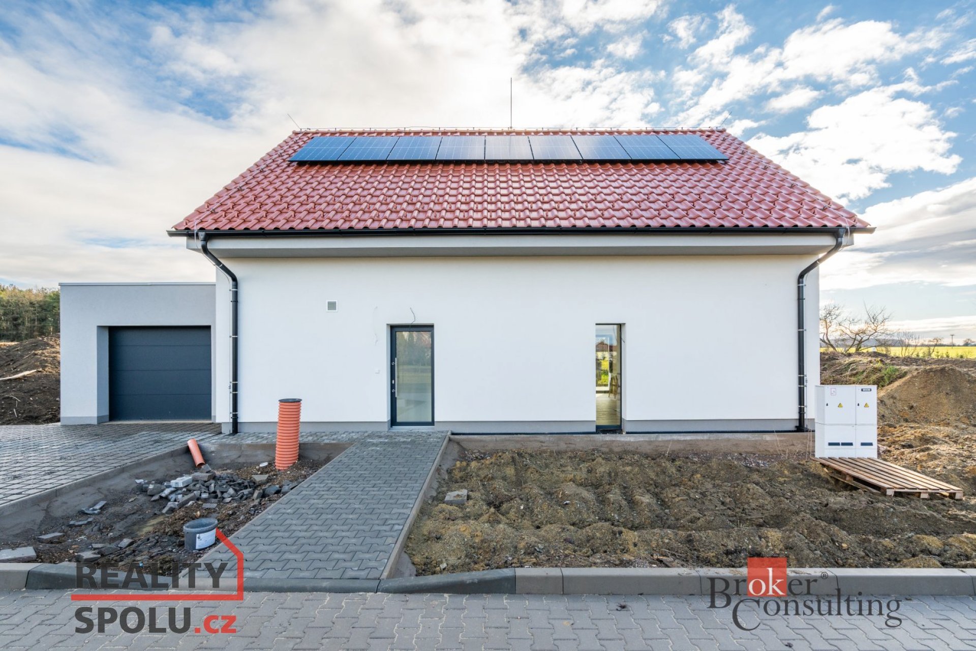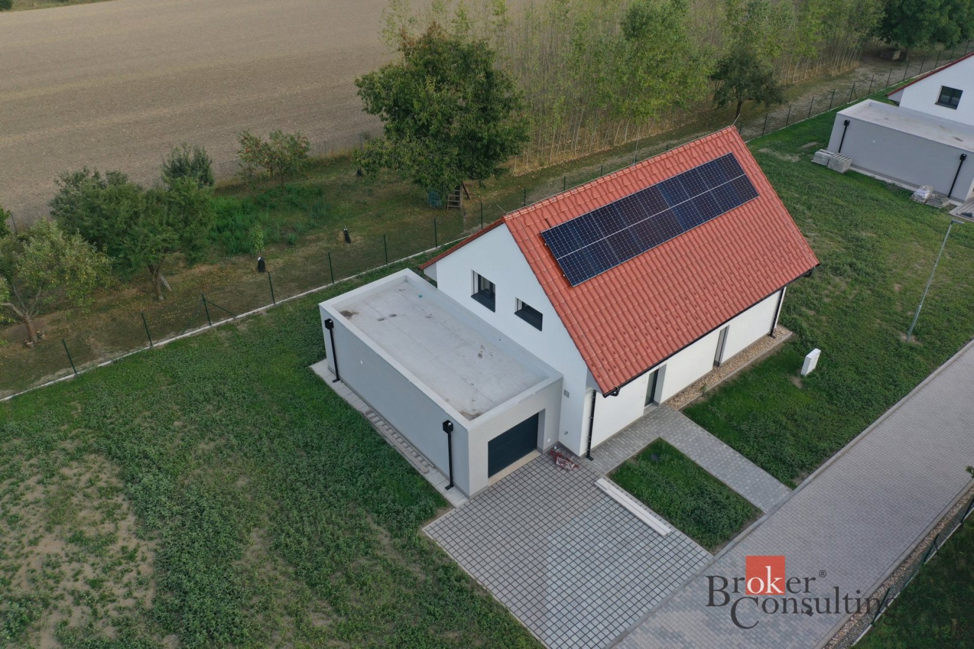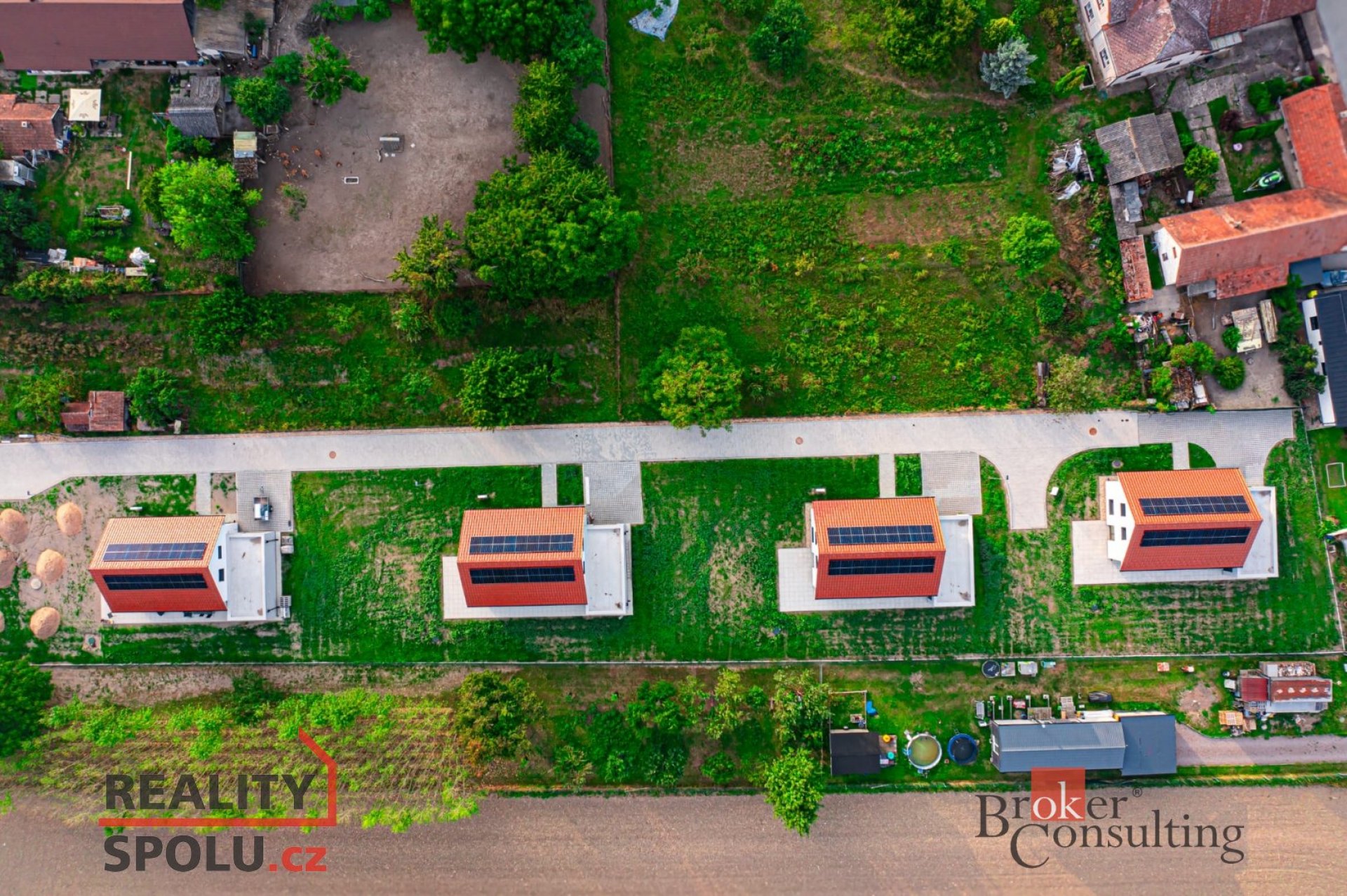 Jedná se o zděnou stavbu (Ytong) se dvěma nadzemními podlažími. Tato novostavba o dispozici 5+kk se nachází na pozemku o rozloze 723 m², přičemž celková plocha domu činí 164,8 m². V přízemí se nachází prostorný obývací pokoj spojený s kuchyní (41,1 m²) a vstupem na terasu (40 m²), dále je zde místnost, která může sloužit jako pokoj pro hosty či pracovna (11,8 m²), koupelna se záchodem (4,6 m²), technická místnost (2,9 m²) a ještě jedna menší místnost pod schody (4,0 m²). V prvním patře jsou dva pokoje s vlastní šatnou (17,8 m² a 16,0 m²), dále ložnice (16,0 m²) se samostatnou šatnou (3,0 m²) přes chodbu a také druhá koupelna (6,1 m²). Jistě také oceníte pudní prostor o velikosti cca 40 m².