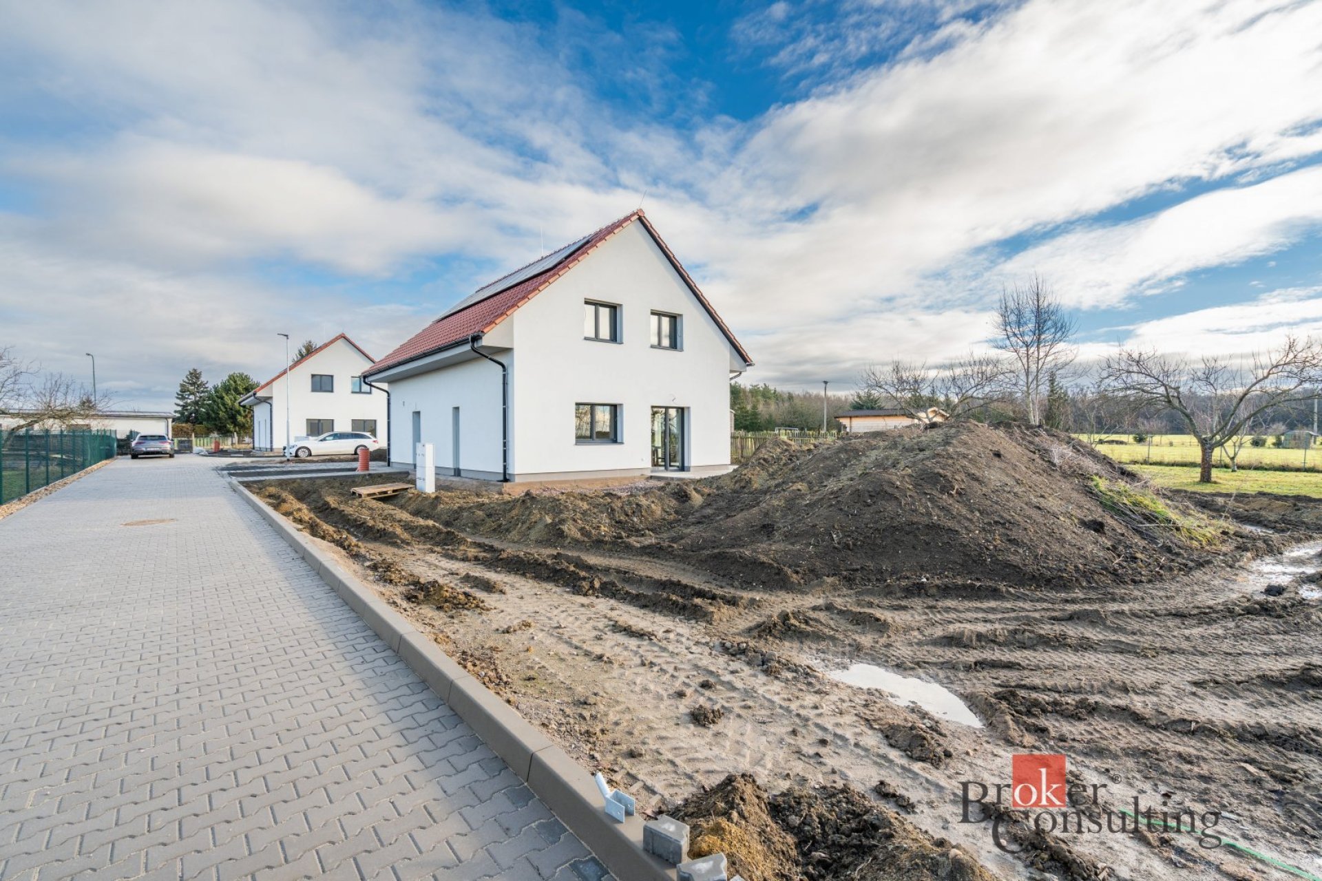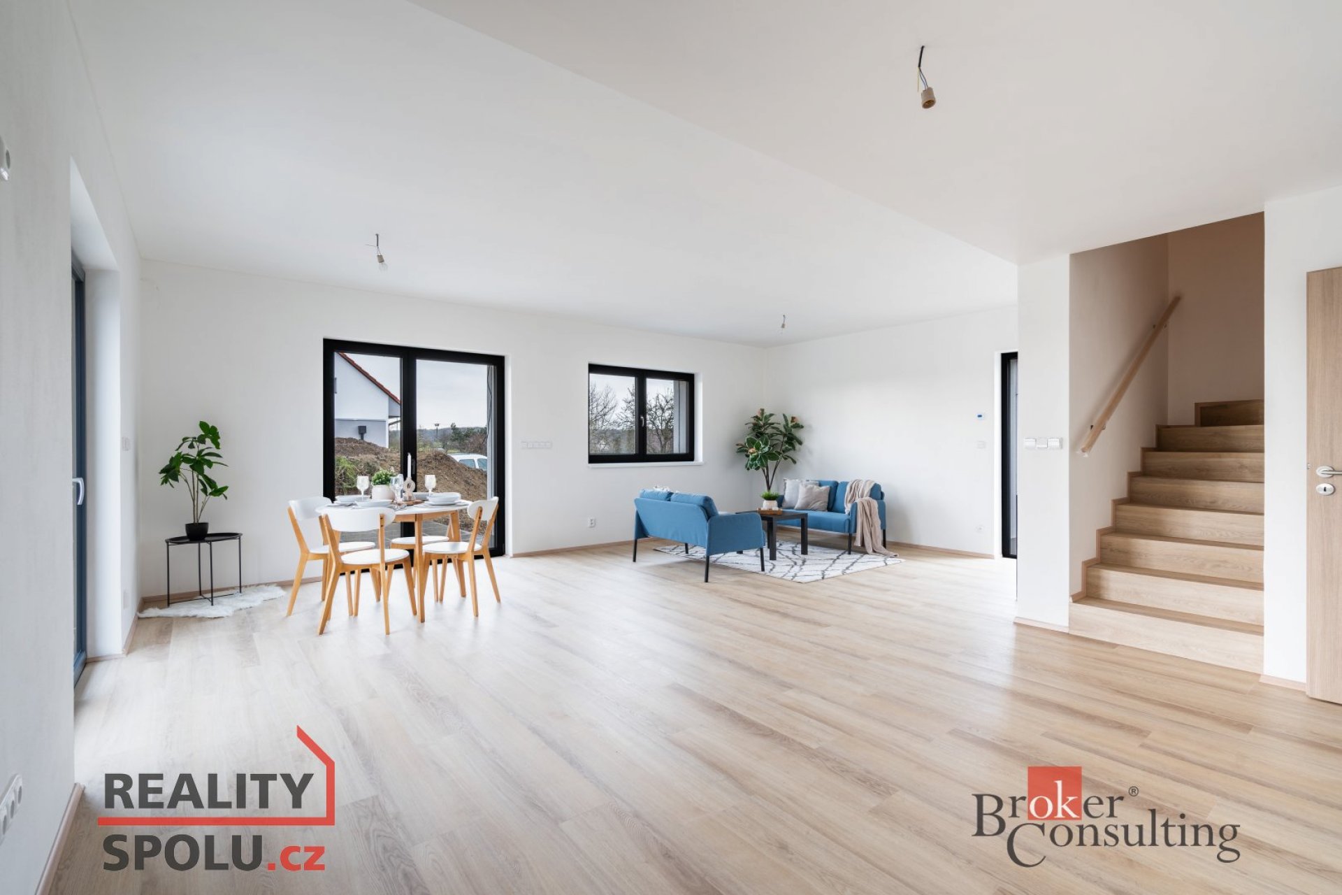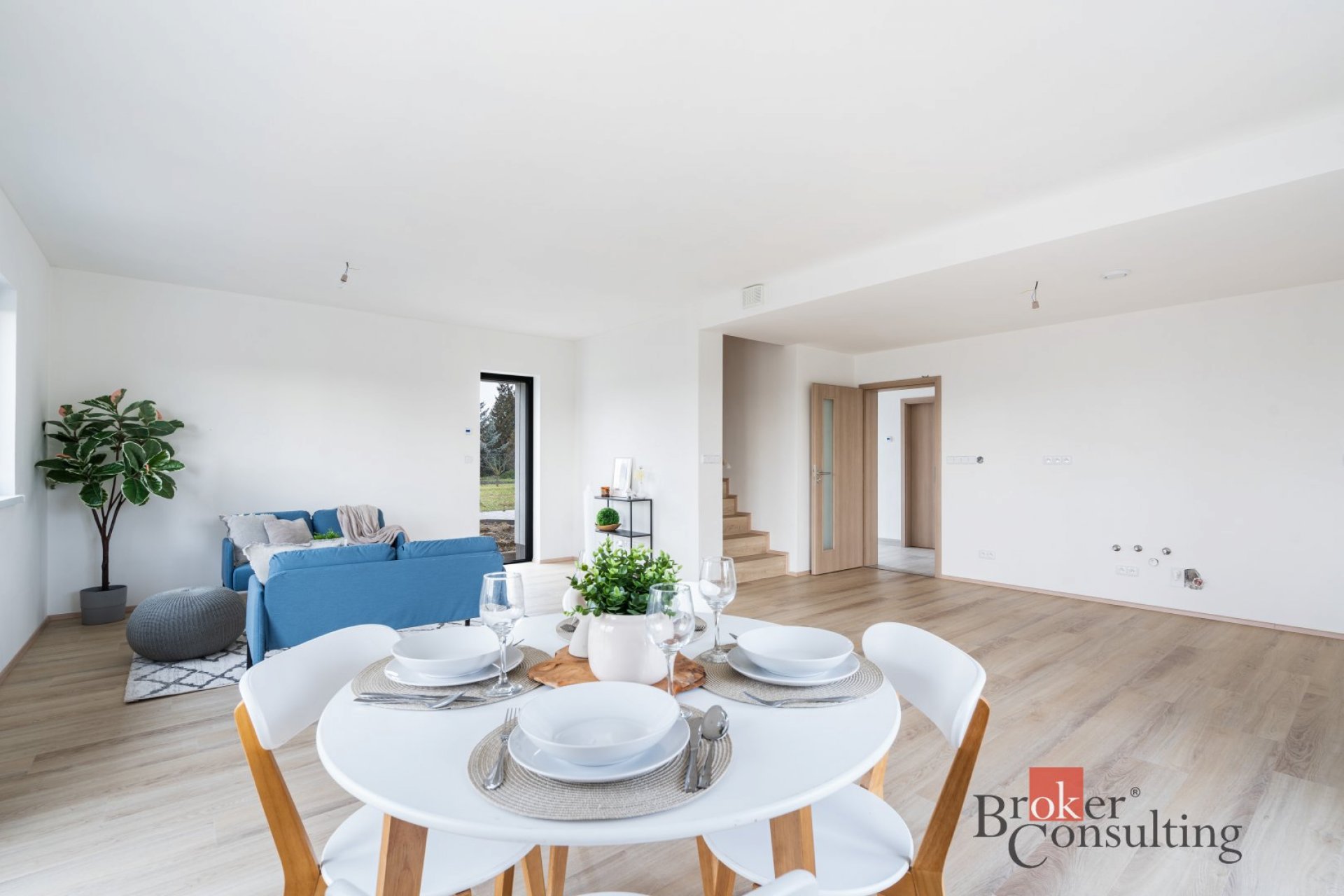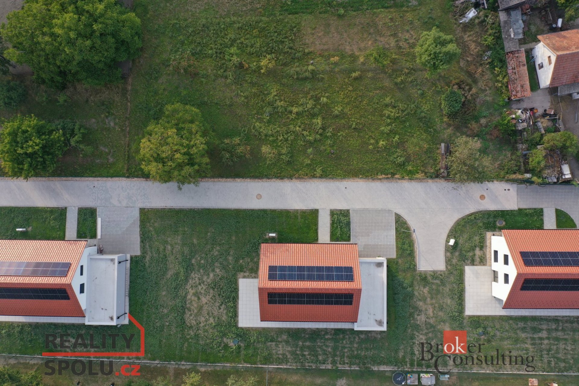 Jedná se o zděnou stavbu (Ytong) se dvěma nadzemními podlažími. Tato novostavba o dispozici 5+kk se nachází na pozemku o rozloze 723 m², přičemž celková plocha domu činí 164,8 m². V přízemí se nachází prostorný obývací pokoj spojený s kuchyní (41,1 m²) a vstupem na terasu (40 m²), dále je zde místnost, která může sloužit jako pokoj pro hosty či pracovna (11,8 m²), koupelna se záchodem (4,6 m²), technická místnost (2,9 m²) a ještě jedna menší místnost pod schody (4,0 m²). V prvním patře jsou dva pokoje s vlastní šatnou (17,8 m² a 16,0 m²), dále ložnice (16,0 m²) se samostatnou šatnou (3,0 m²) přes chodbu a také druhá koupelna (6,1 m²). Jistě také oceníte pudní prostor o velikosti cca 40 m².