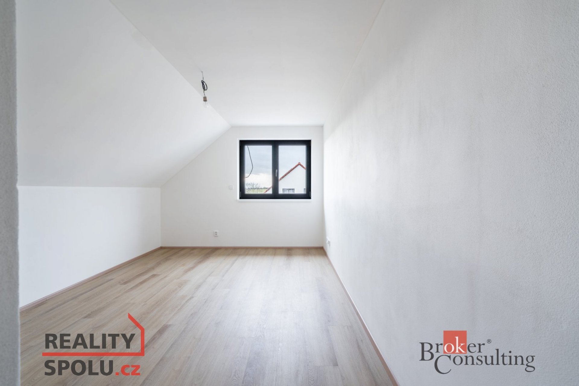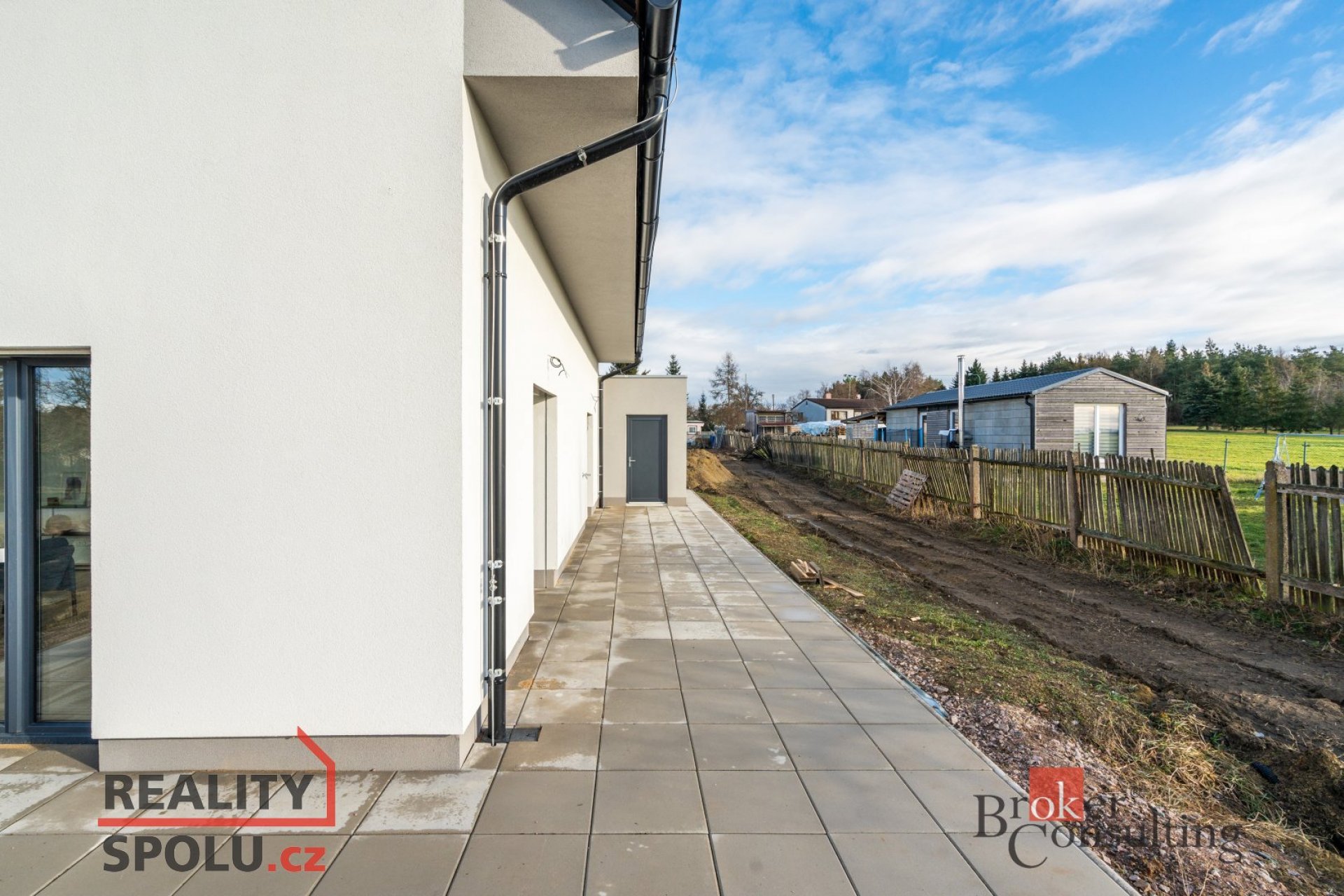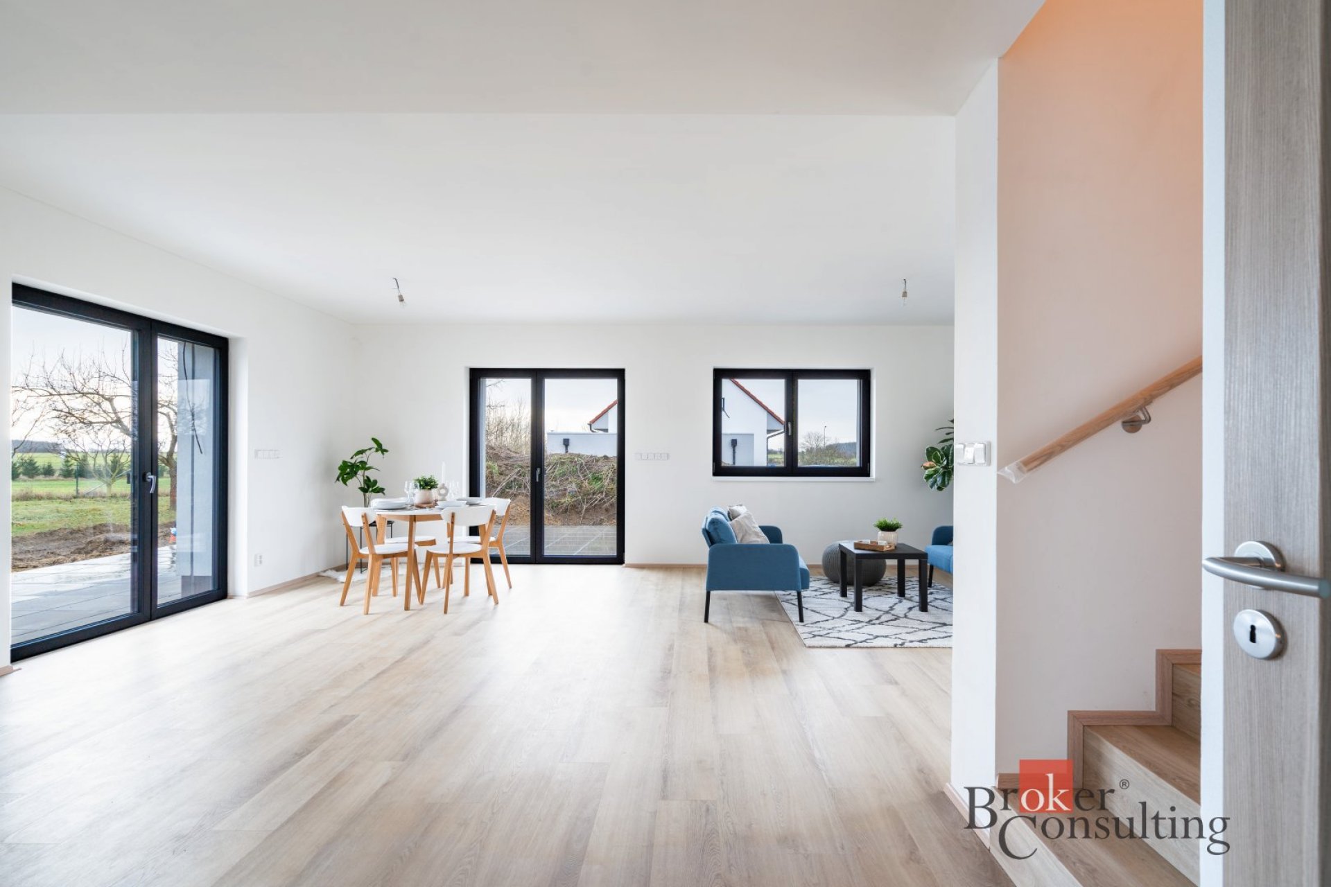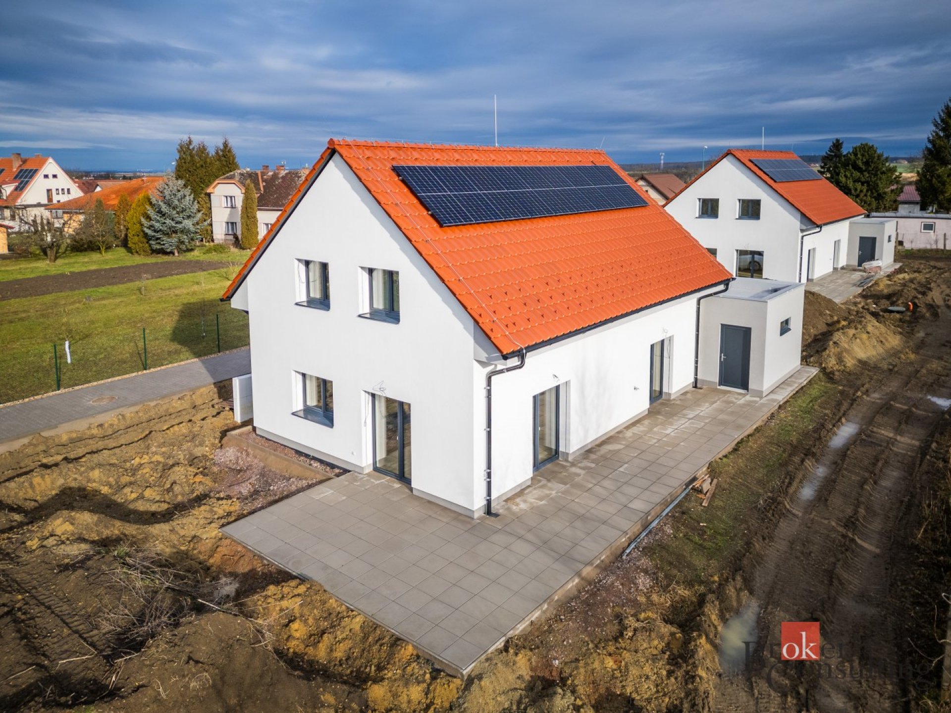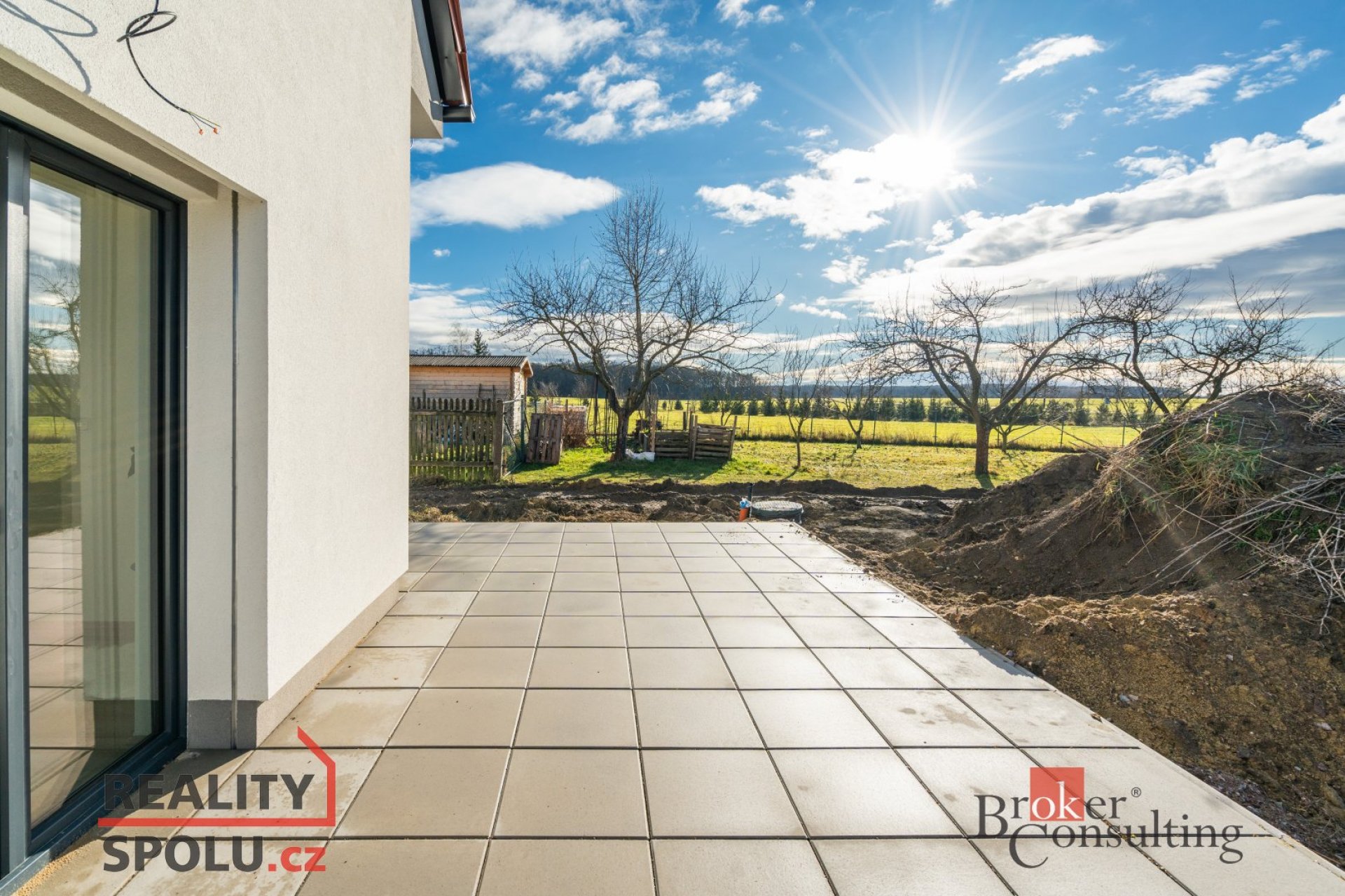 Jedná se o zděnou stavbu (Ytong) se dvěma nadzemními podlažími. Tato novostavba o dispozici 5+kk se nachází na pozemku o rozloze 723 m², přičemž celková plocha domu činí 164,8 m². V přízemí se nachází prostorný obývací pokoj spojený s kuchyní (41,1 m²) a vstupem na terasu (40 m²), dále je zde místnost, která může sloužit jako pokoj pro hosty či pracovna (11,8 m²), koupelna se záchodem (4,6 m²), technická místnost (2,9 m²) a ještě jedna menší místnost pod schody (4,0 m²). V prvním patře jsou dva pokoje s vlastní šatnou (17,8 m² a 16,0 m²), dále ložnice (16,0 m²) se samostatnou šatnou (3,0 m²) přes chodbu a také druhá koupelna (6,1 m²). Jistě také oceníte pudní prostor o velikosti cca 40 m².