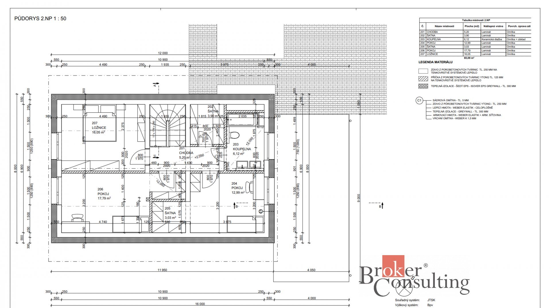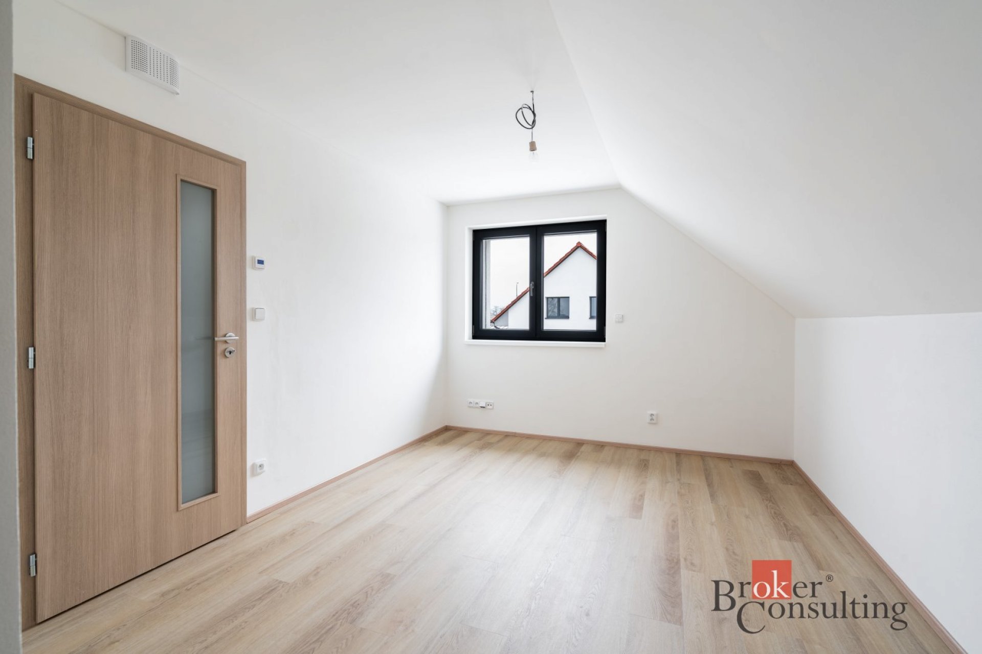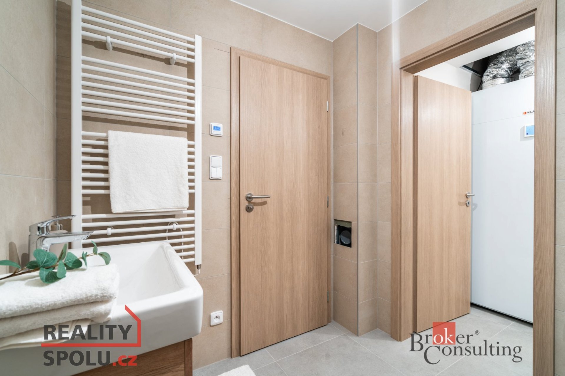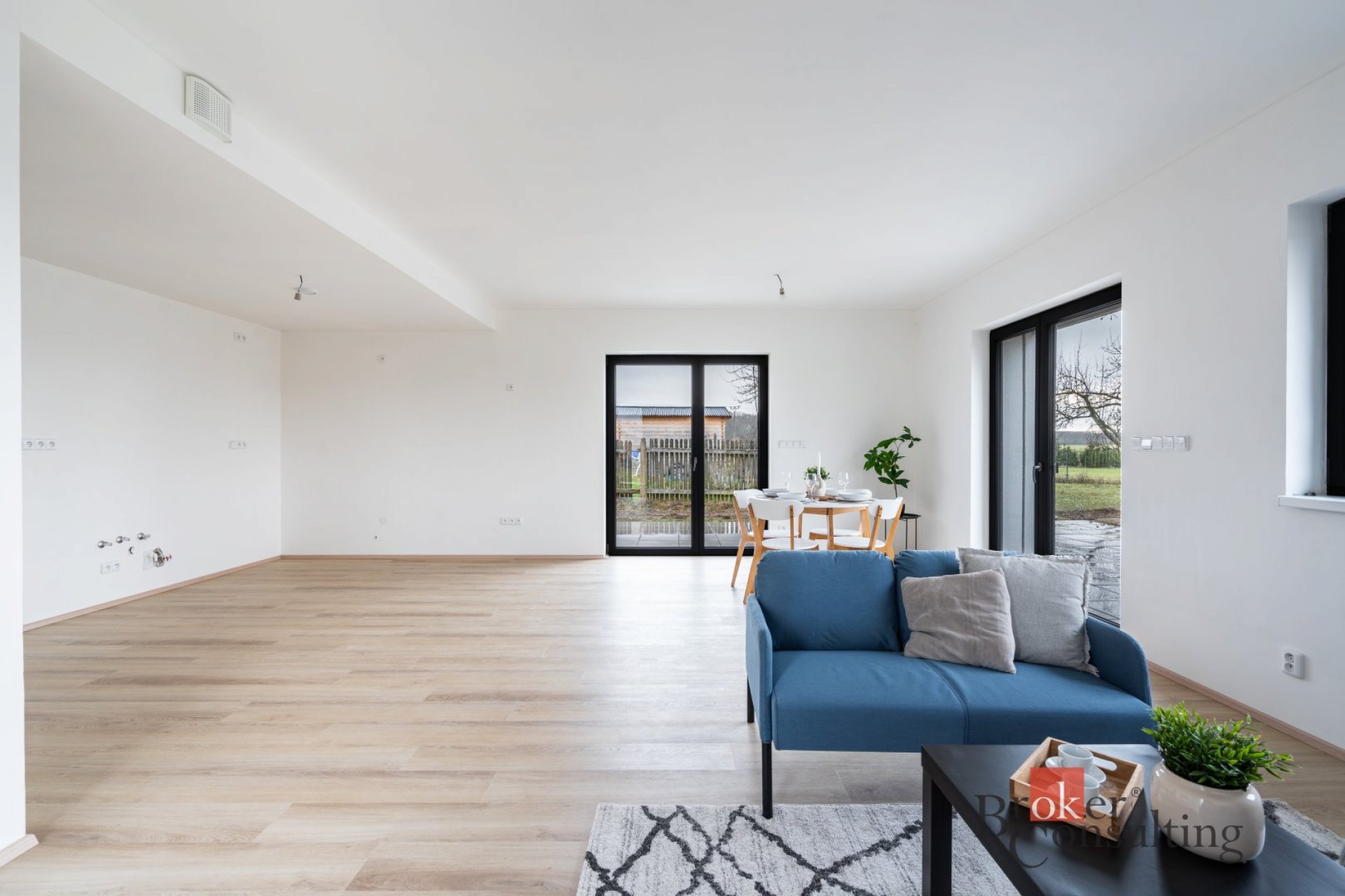 Jedná se o zděnou stavbu (Ytong) se dvěma nadzemními podlažími. Tato novostavba o dispozici 5+kk se nachází na pozemku o rozloze 723 m², přičemž celková plocha domu činí 164,8 m². V přízemí se nachází prostorný obývací pokoj spojený s kuchyní (41,1 m²) a vstupem na terasu (40 m²), dále je zde místnost, která může sloužit jako pokoj pro hosty či pracovna (11,8 m²), koupelna se záchodem (4,6 m²), technická místnost (2,9 m²) a ještě jedna menší místnost pod schody (4,0 m²). V prvním patře jsou dva pokoje s vlastní šatnou (17,8 m² a 16,0 m²), dále ložnice (16,0 m²) se samostatnou šatnou (3,0 m²) přes chodbu a také druhá koupelna (6,1 m²). Jistě také oceníte pudní prostor o velikosti cca 40 m².