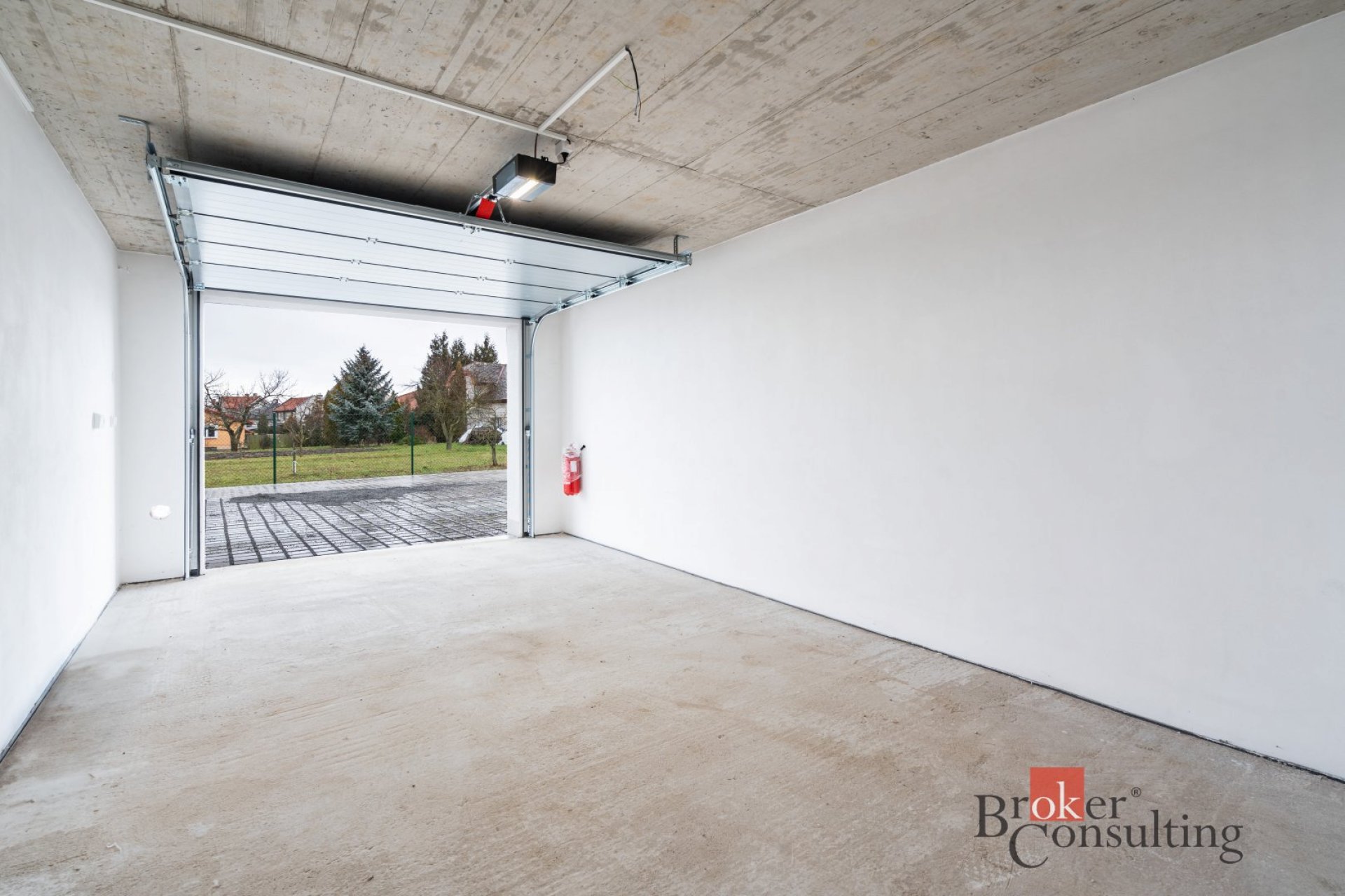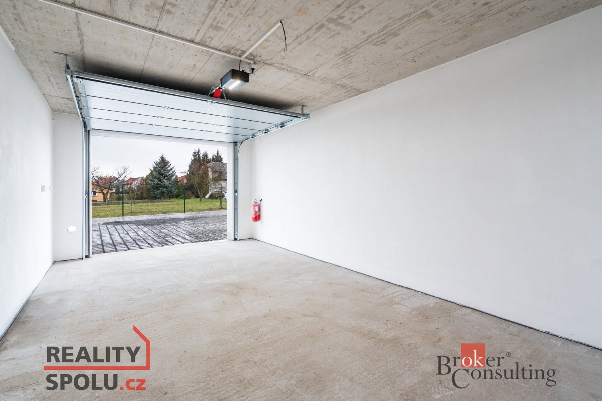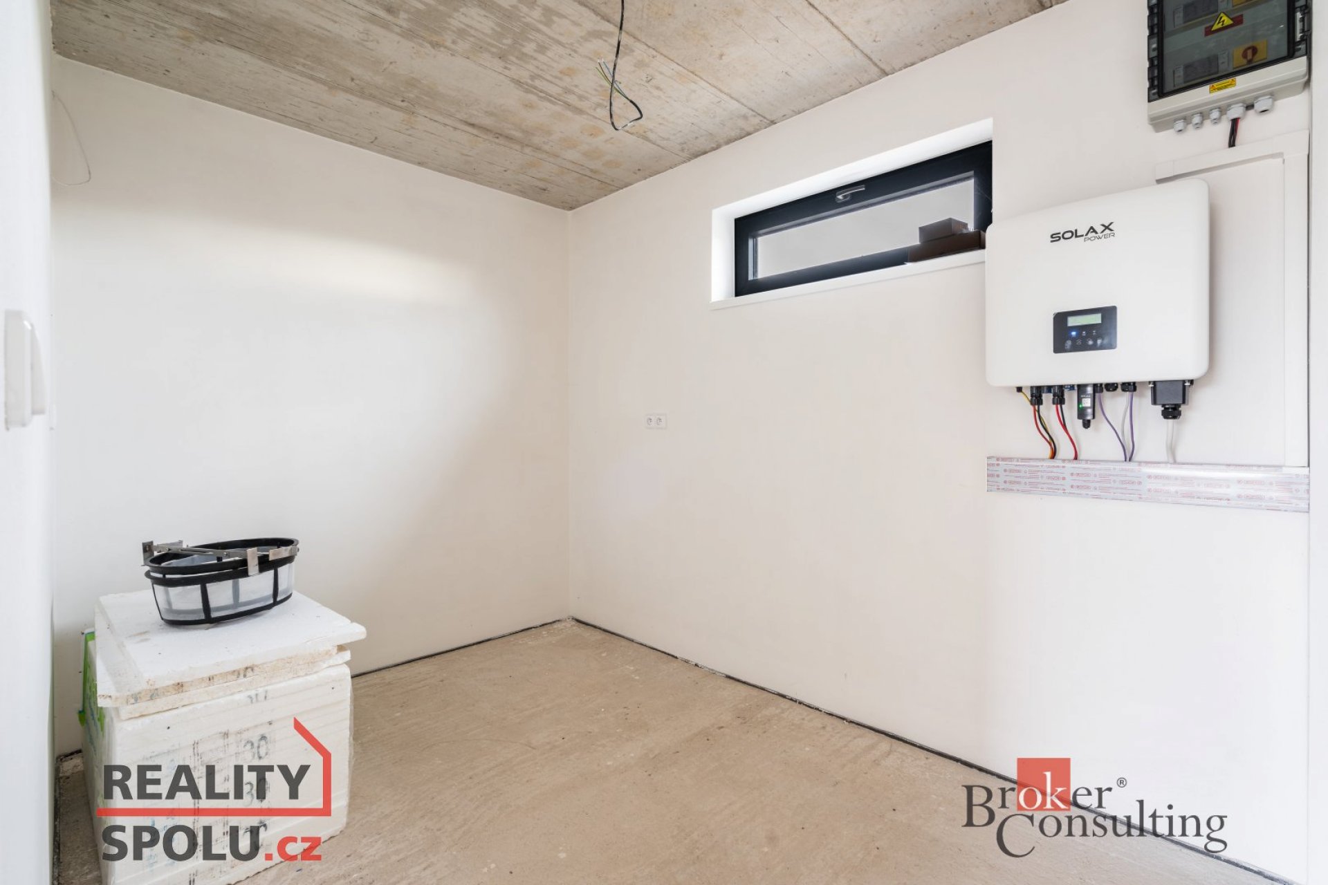 U domu se nachází také prostorná garáž se skladem zahradního nářadí (28,5 m²), kde je uložena technologie FVE a příprava pro bateriové úložiště.