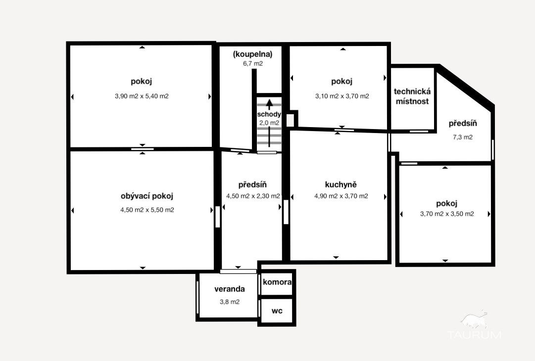 Samotný rodinný dům má jedno nadzemní podlaží a prostornou půdu, vhodnou k přestavbě na obytné podkroví. Přízemí domu o velikosti 3+1 a výměře 116 m² má dispozičně velmi zajímavé uspořádání.