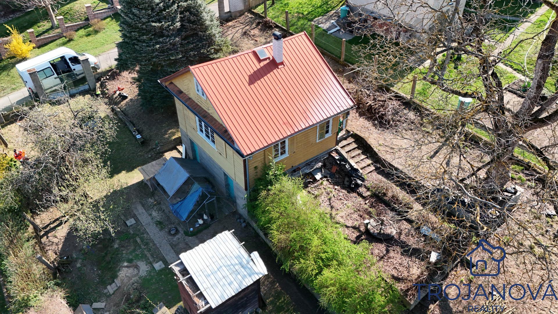Pozemek: Jak je vidět na leteckém snímku, chata je chytře umístěna tak, aby vám zbyla prostorná a slunná zahrada (579 m2) se vzrostlými stromy, které zajišťují soukromí.