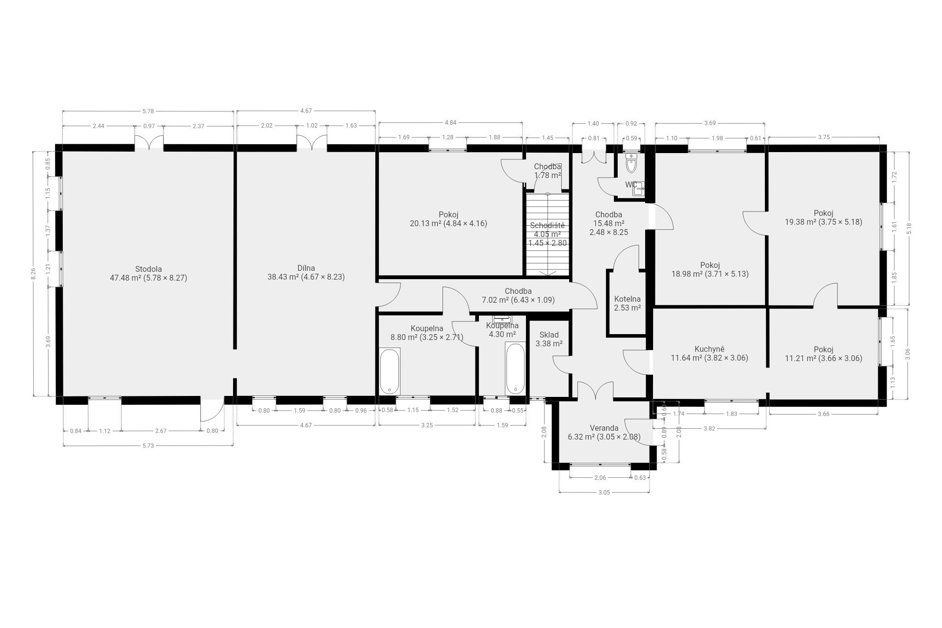 Dům je v původním, technicky horším stavu a je určen ke kompletní rekonstrukci. Nabízí však pevný základ pro vytvoření komfortního a prostorného domova. K dispozici jsou čtyři obytné místnosti, kuchyně, dvě koupelny, samostatné WC, chodby, spíž, sklad, kotelna a technické zázemí. Velkým benefitem jsou prostorné půdní prostory vhodné pro vestavbu dalších pokojů. Na dům navazuje také dílna a velká stodola, která rozšiřuje možnosti využití nemovitosti.