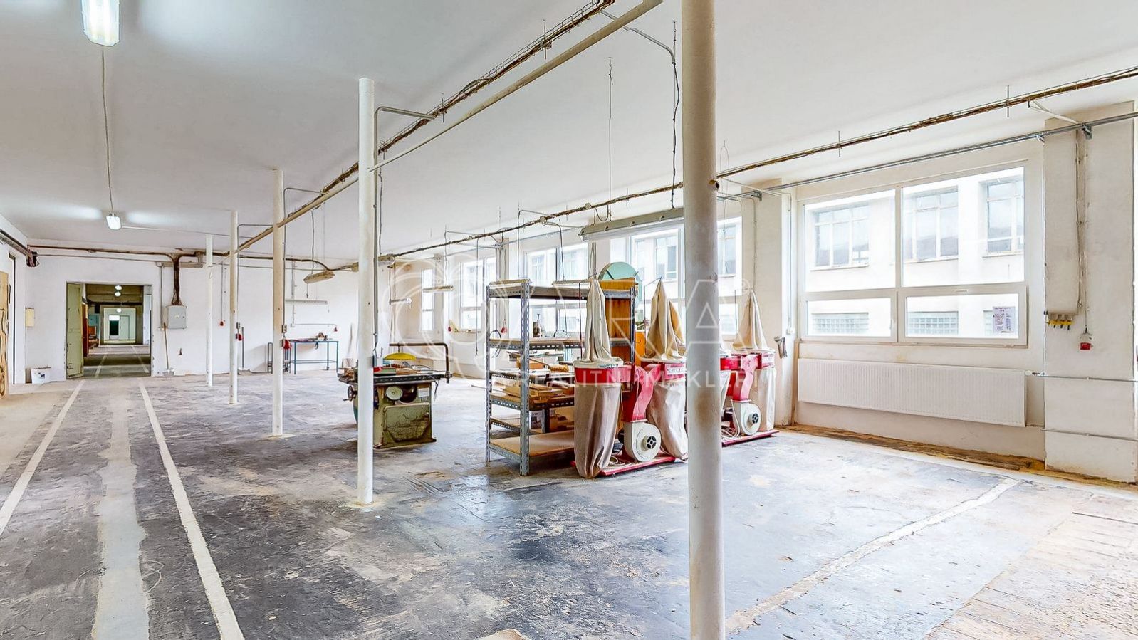 - Elektrická vrata (2,94 × 3,3 m) + dvě další vrata na opačných stranách haly