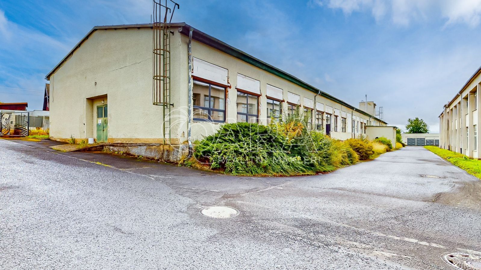 Hala disponuje novými elektrickými vjezdovými vraty (2,94 × 3,3 m) a dalšími dvěma vraty na koncích budovy s možností využití nákladové rampy. Pohodlný příjezd je zajištěn přímo z místní komunikace s bezproblémovým parkováním v areálu a možností dalšího rozšíření zpevněných ploch podél budovy.