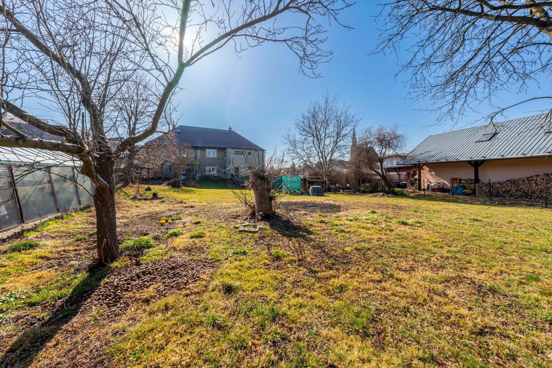 Součástí nemovitosti je garáž a před domem je možné pohodlně parkovat i na vlastním pozemku. Za domem se rozprostírá zahrada o výměře 757 m² — dostatek prostoru pro relaxaci a zahrádkaření.