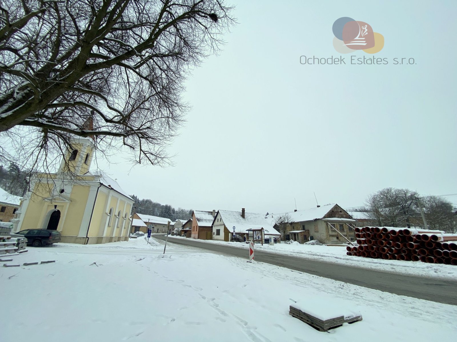 Pozemek má 241 m² a leží přímo na návsi, v samotném srdci obce. Jen pár kroků od malého kostelíka, který dotváří atmosféru místa.